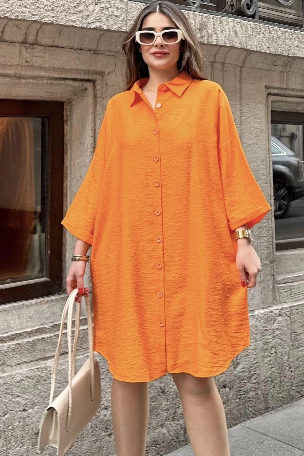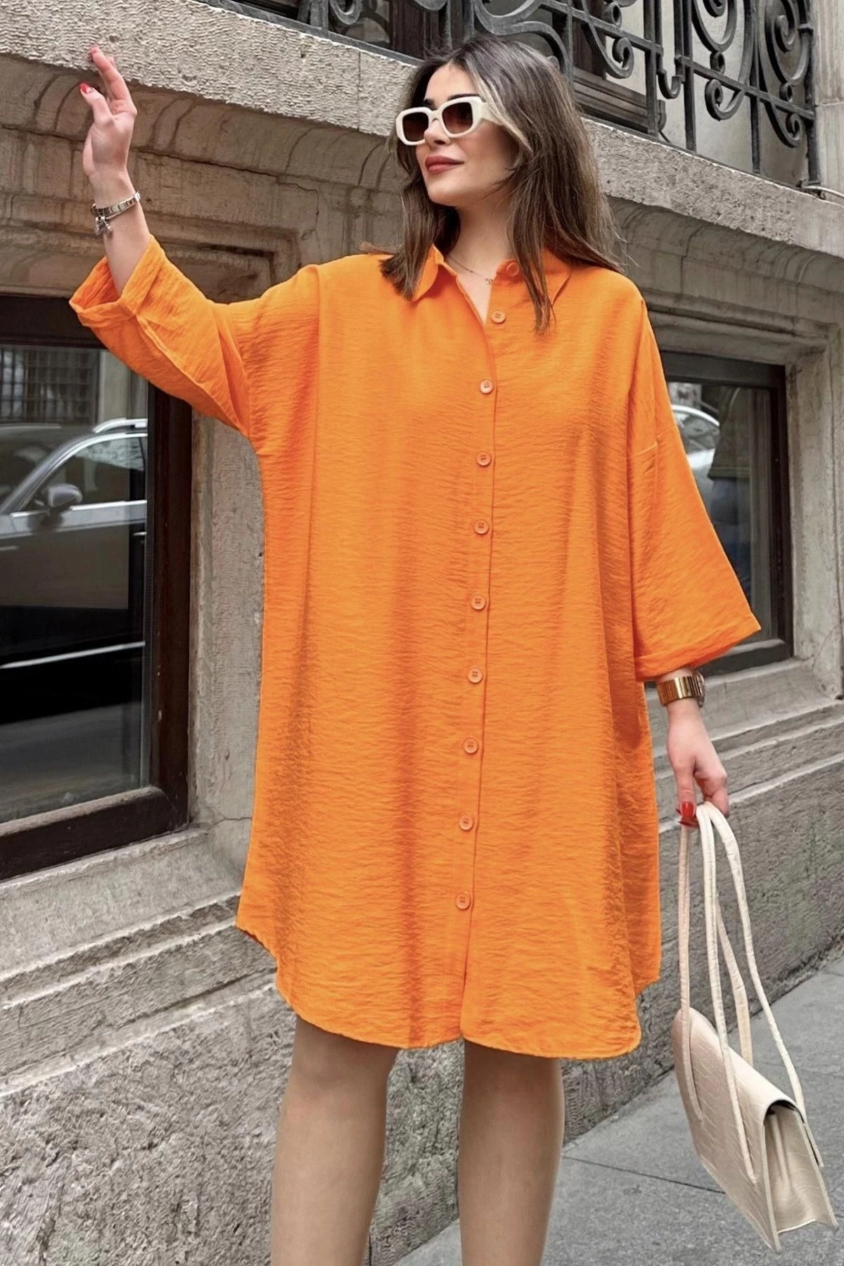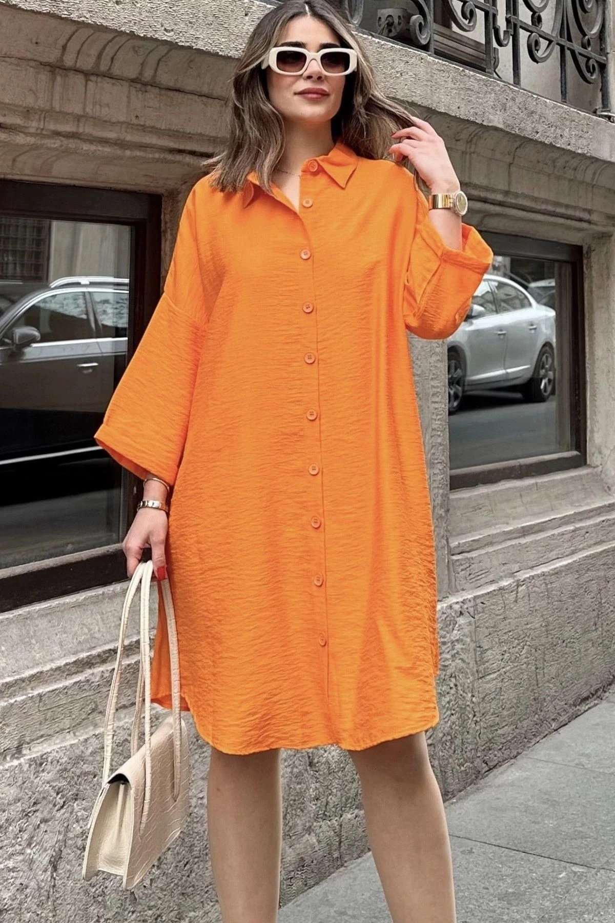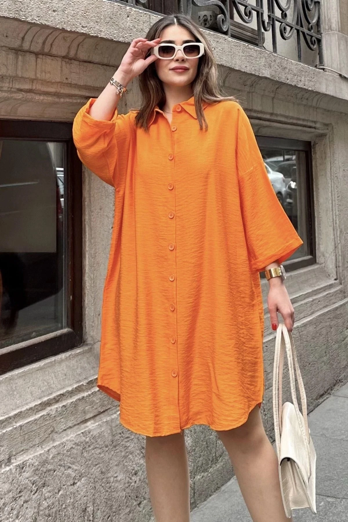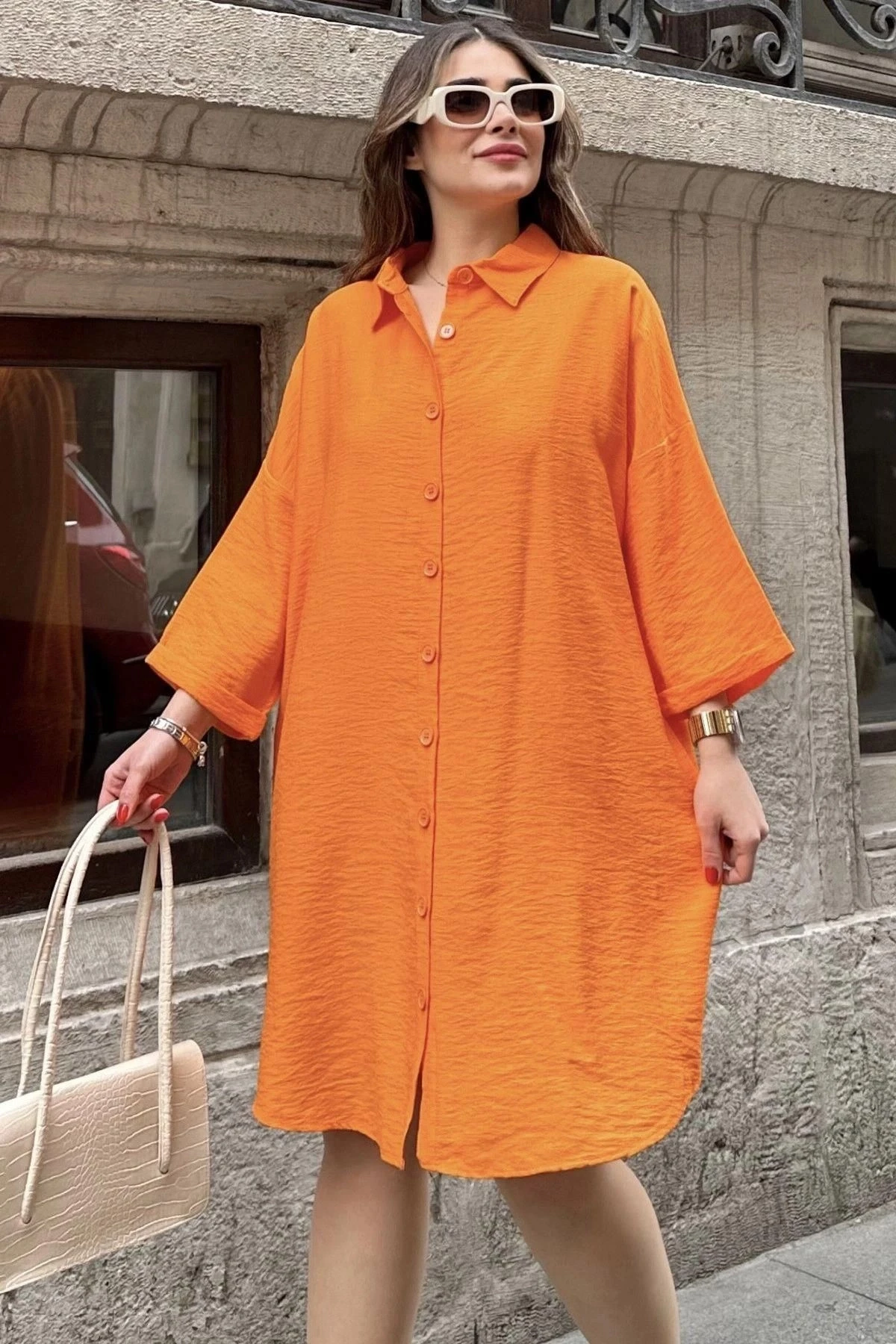 Kadın Turuncu Katlamalı Yarım Kol, Eteği Oval Kesim, Midi Boy, Salaş Keten Gömlek Elbise