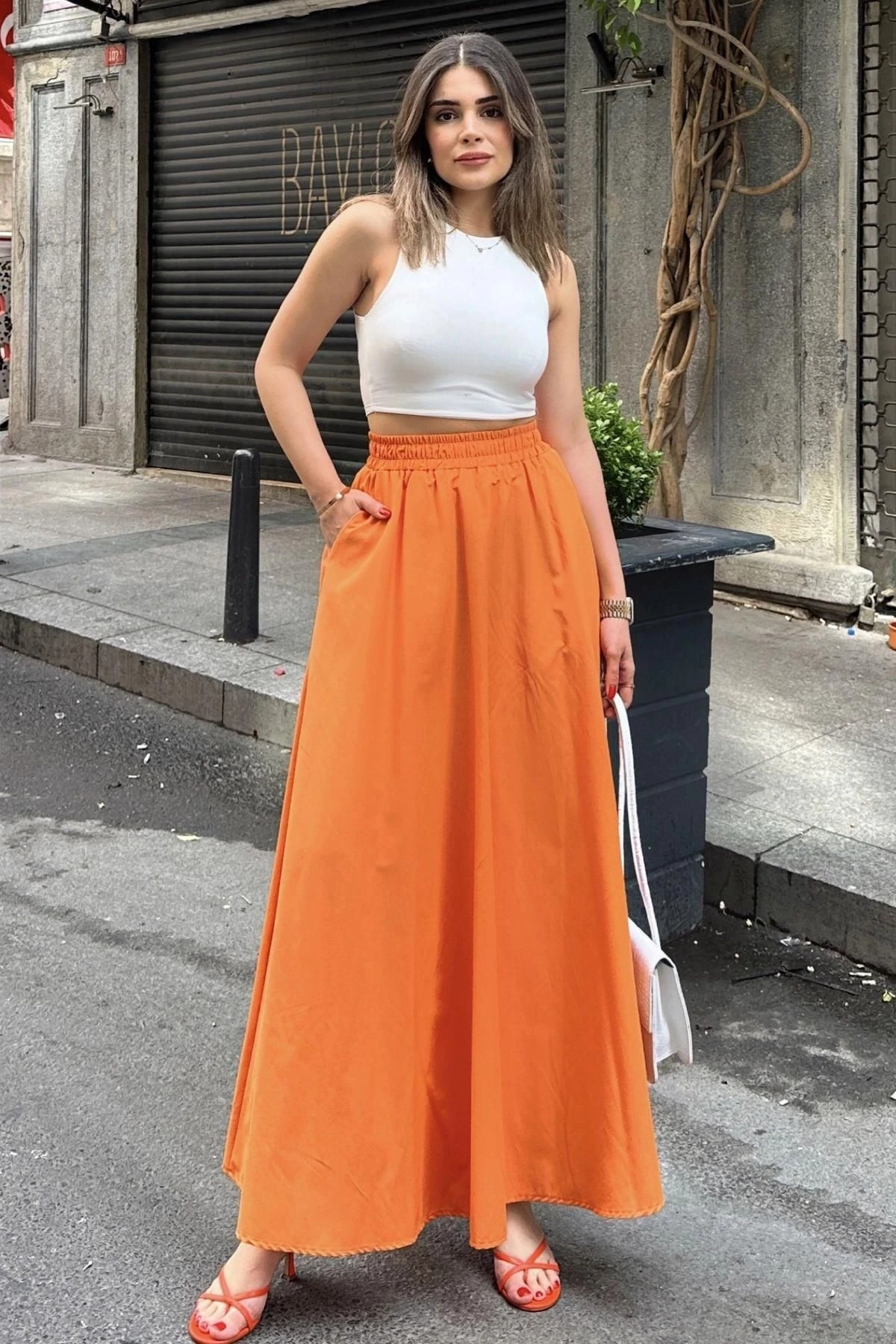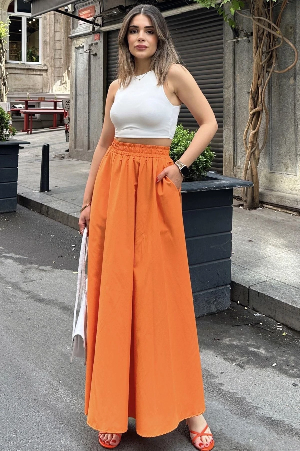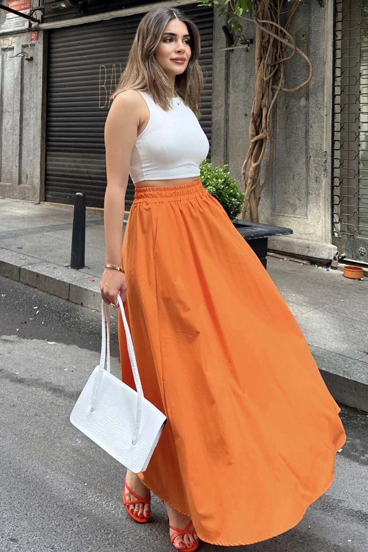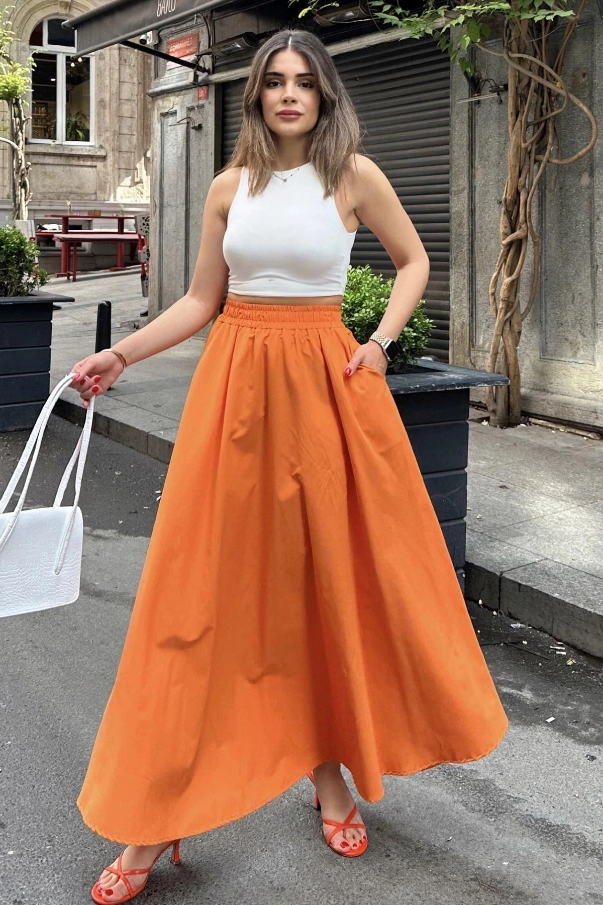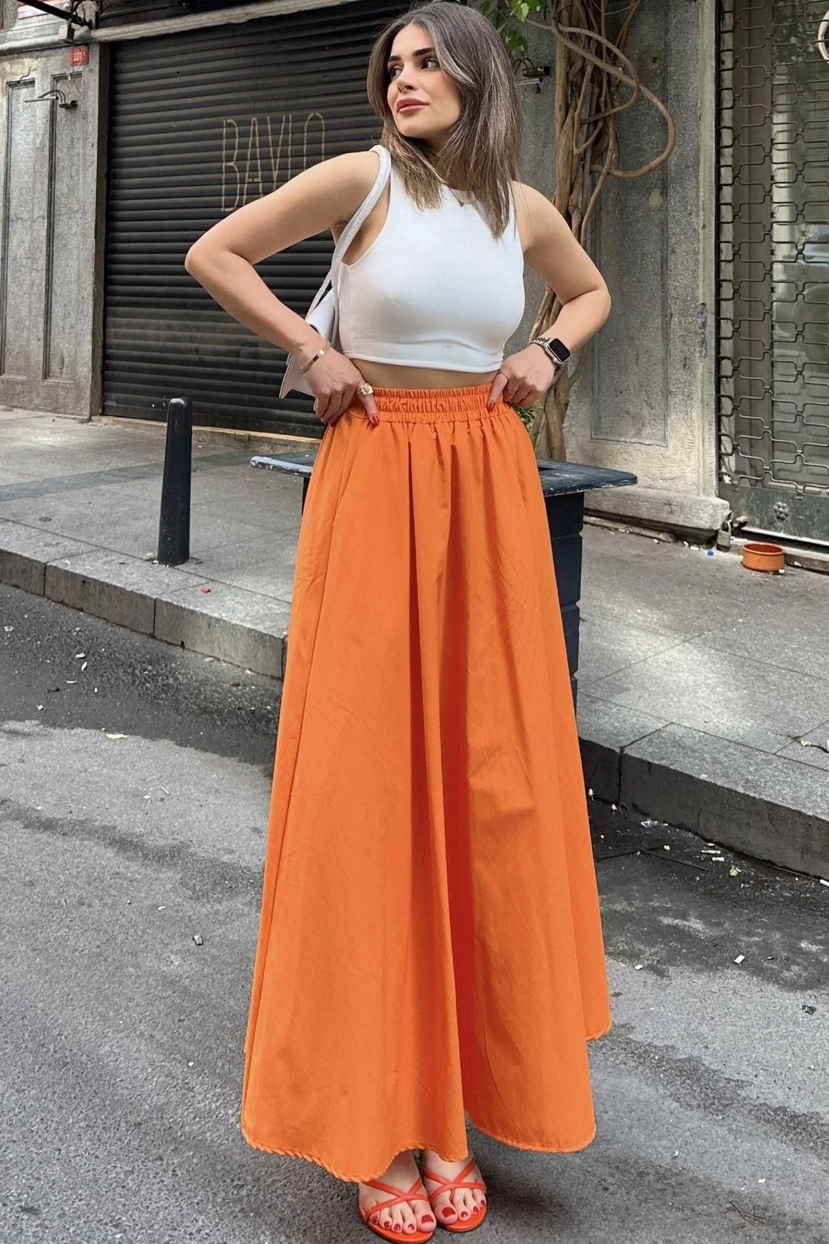 Kadın Turuncu Lastikli Yüksek Bel, A Kesim, Dökümlü Ve Salaş, Uzun Poplin Etek