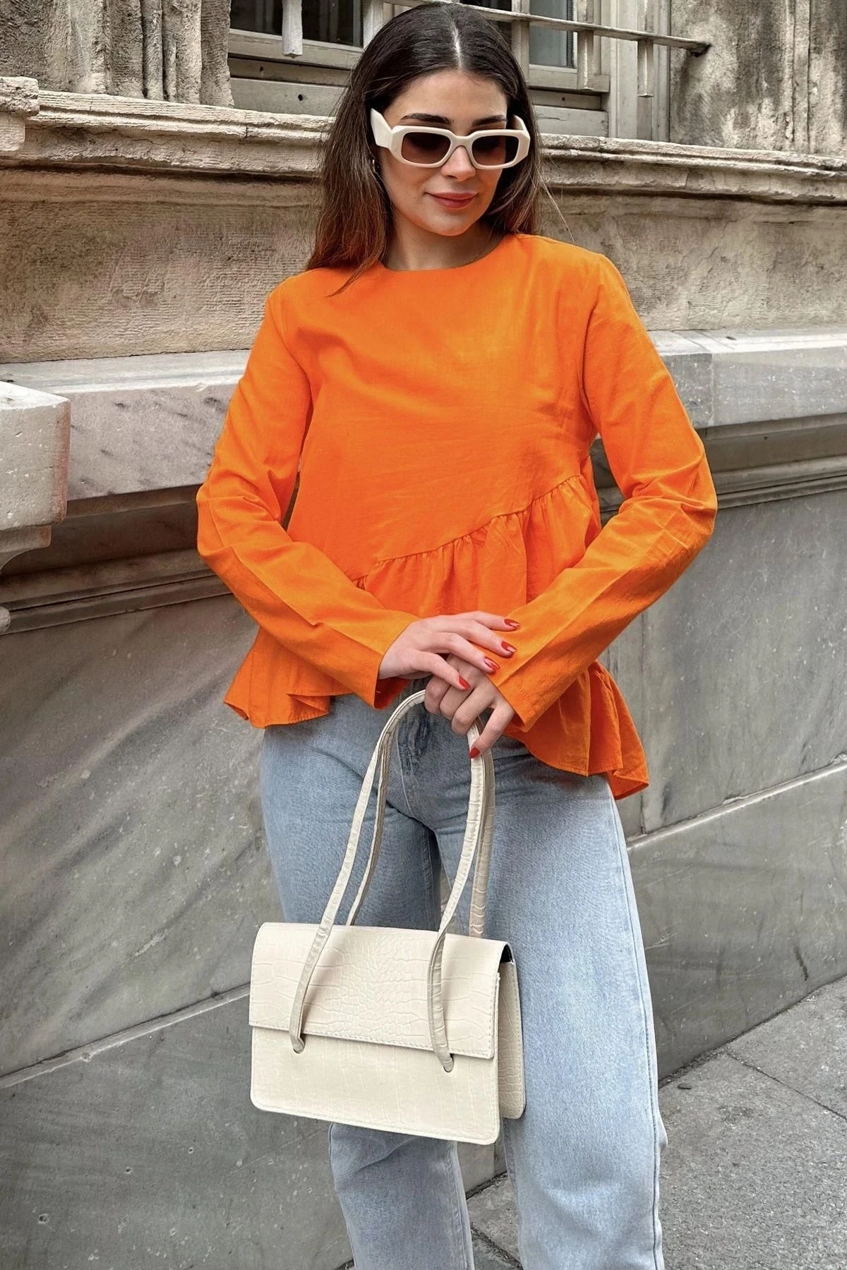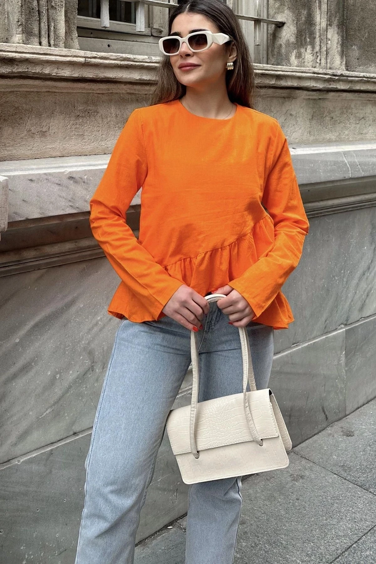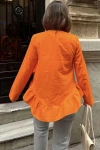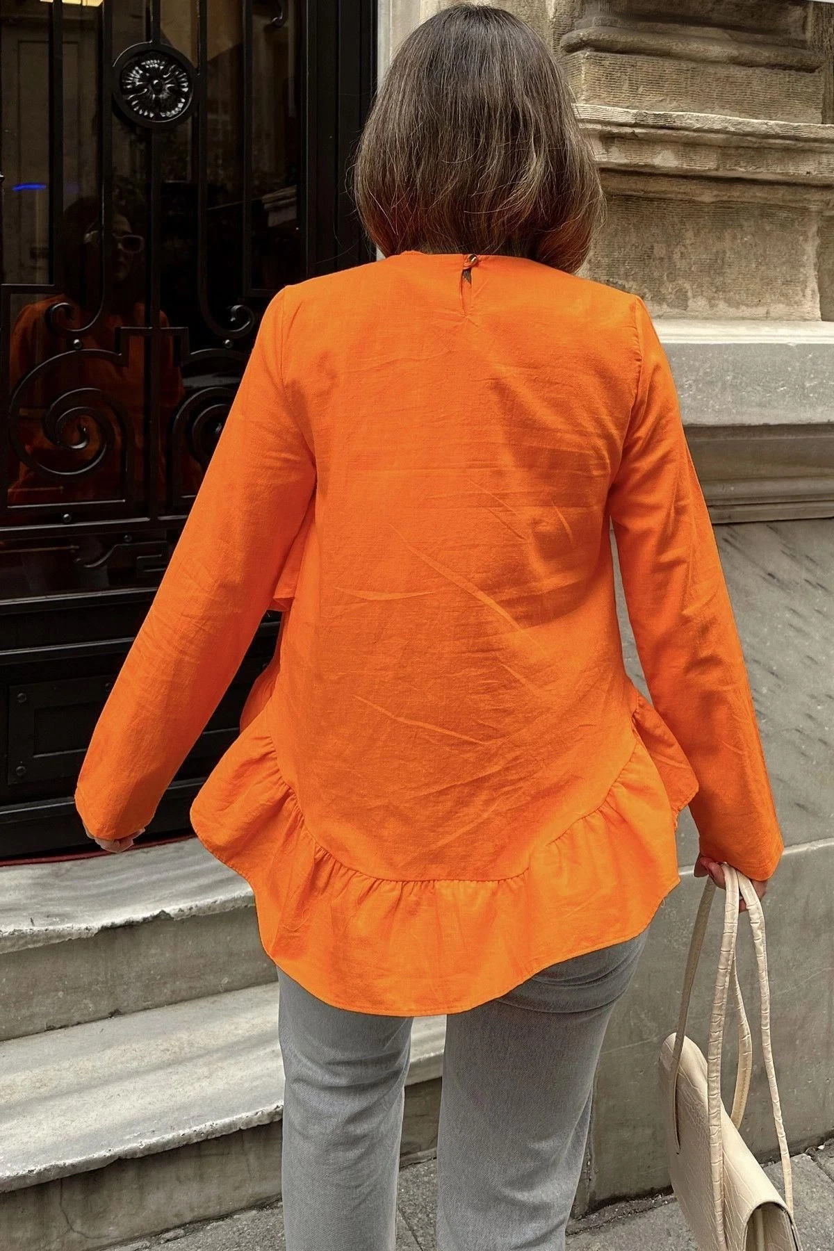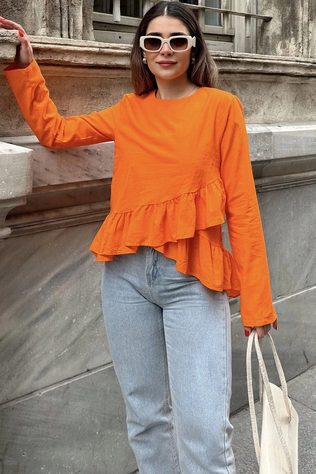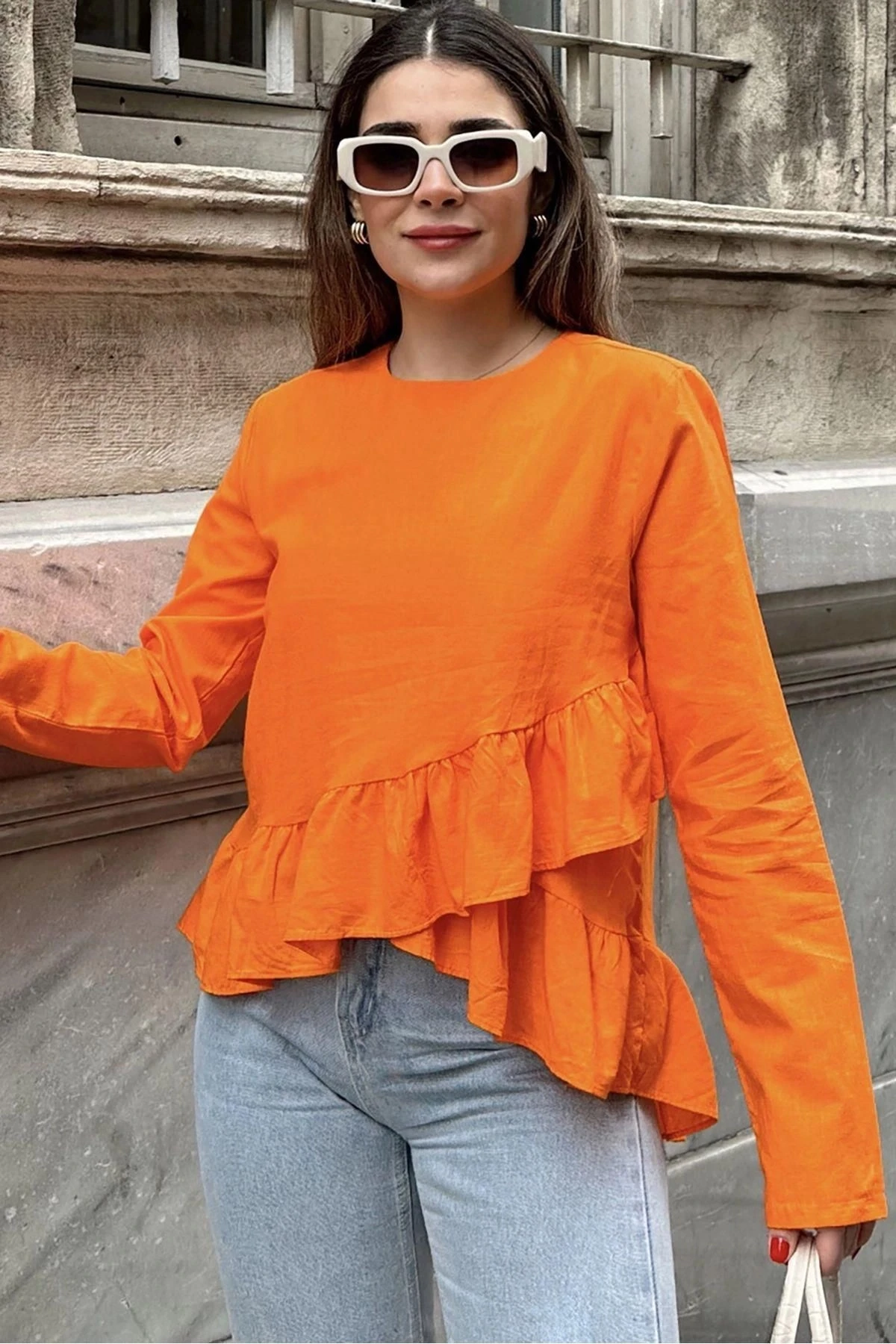 Kadın Turuncu Önü Fırfırlı, Yuvarlak Yaka, Arkası Uzun Pamuklu Salaş Bluz