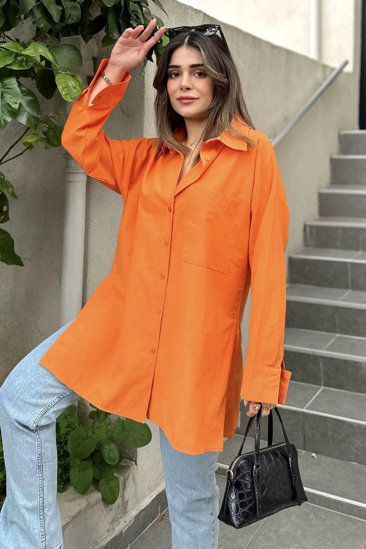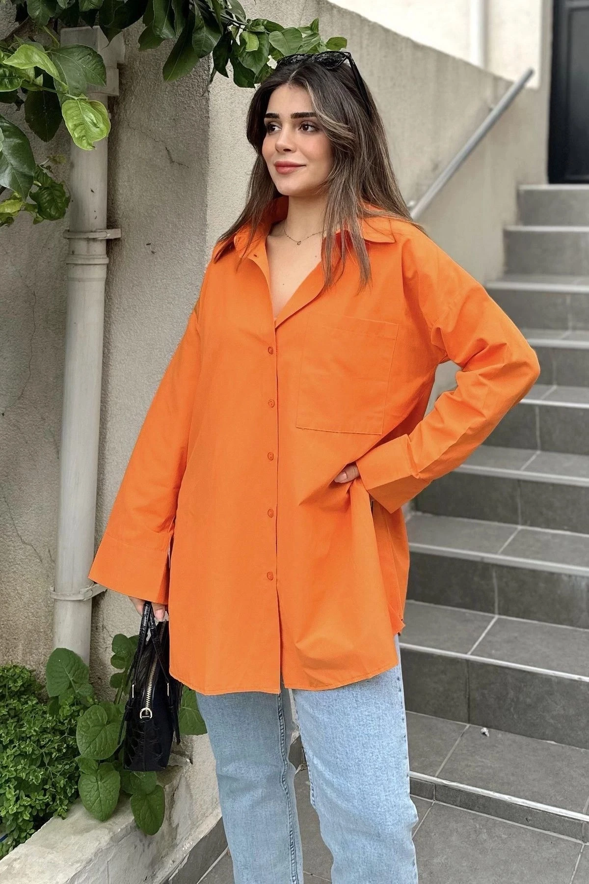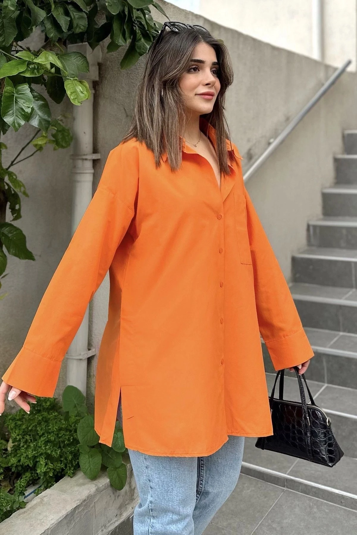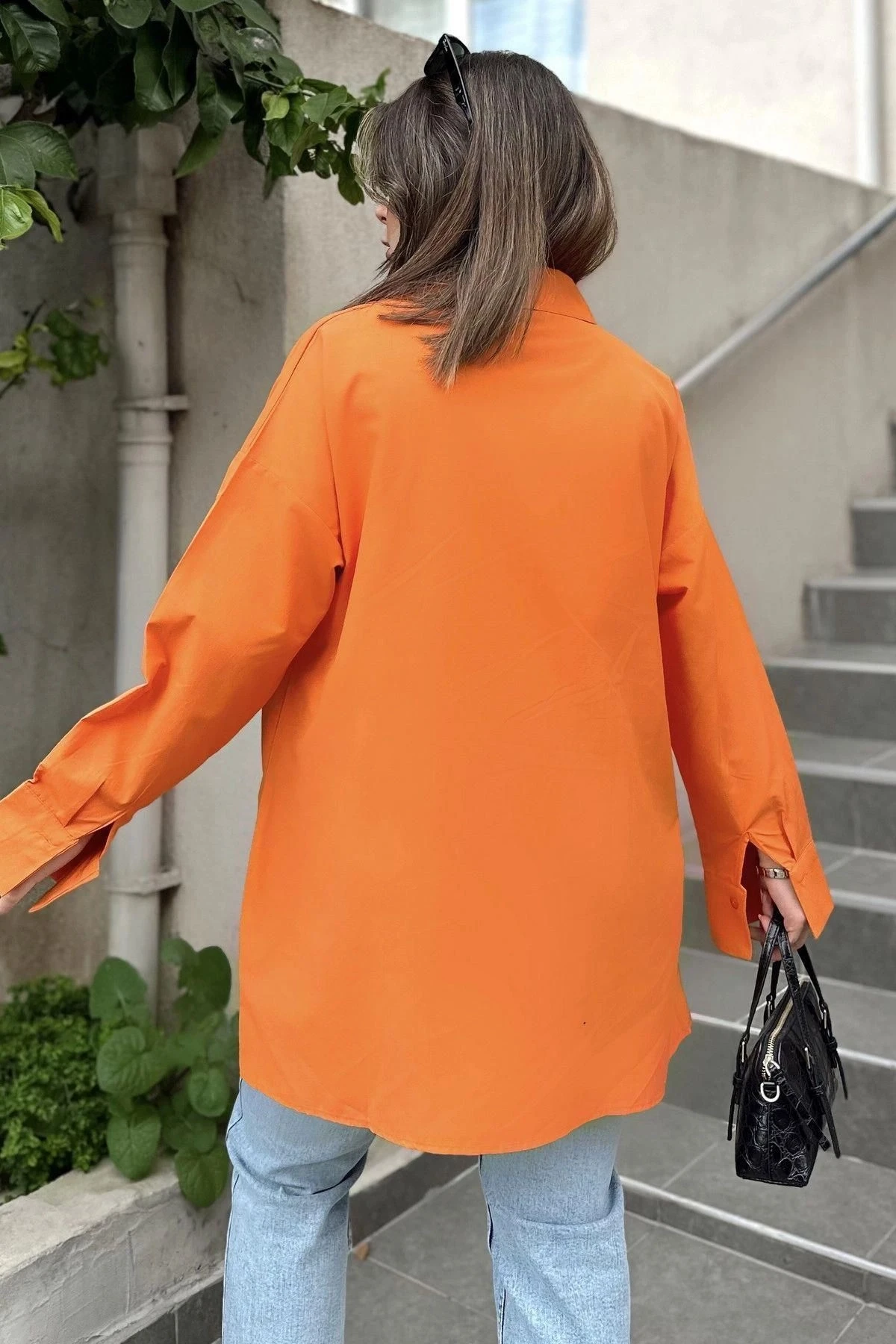 Kadın turuncu Terikoton Kumaş, Yırtmaçlı, Rahat Uzun Gömlek
