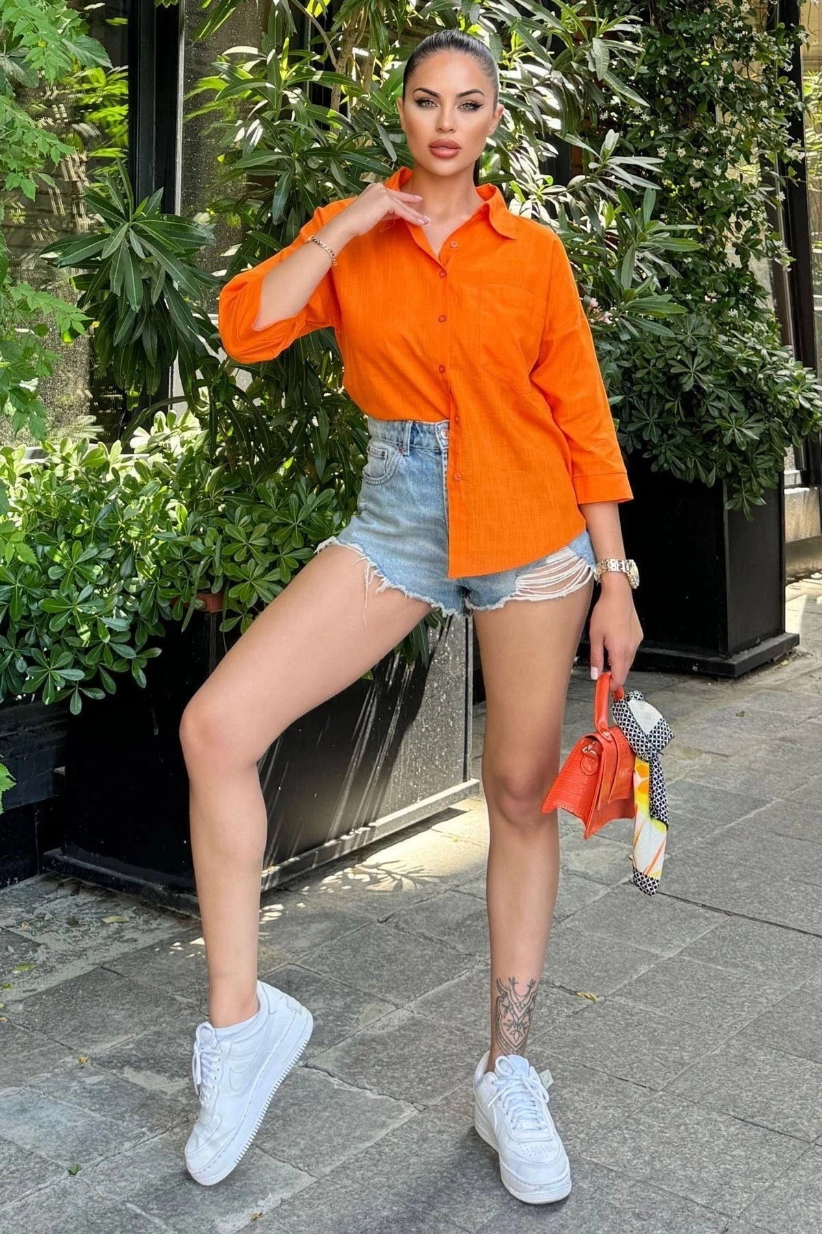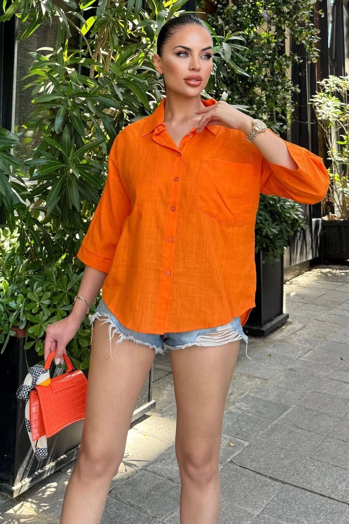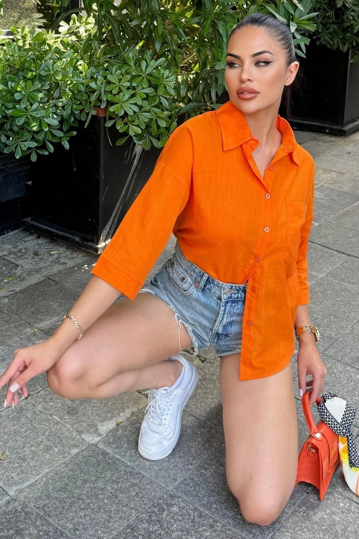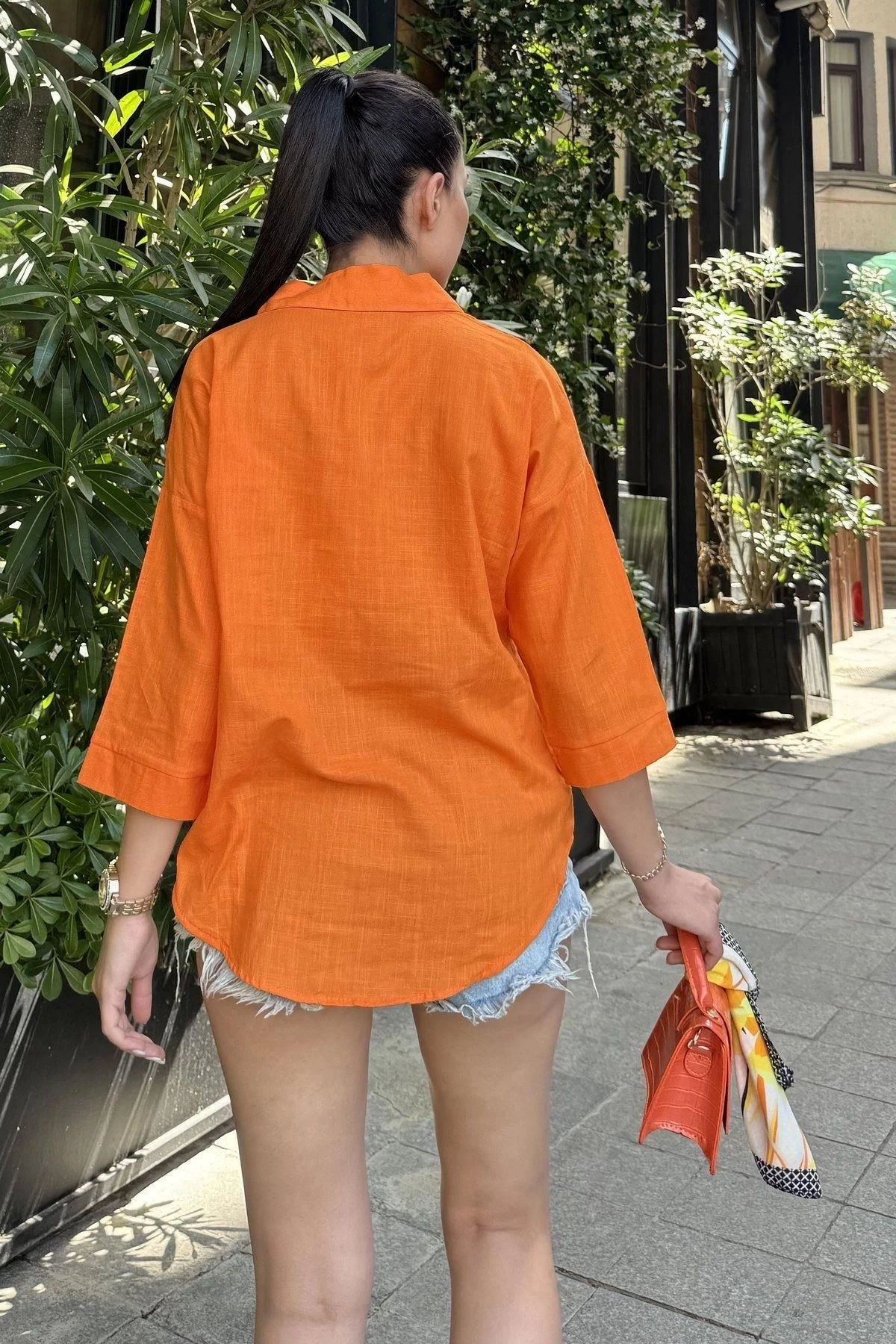Kadın Turuncu Truvakar Kol, Oval Kesim, Terletmez, Flamlı Keten Salaş Gömlek