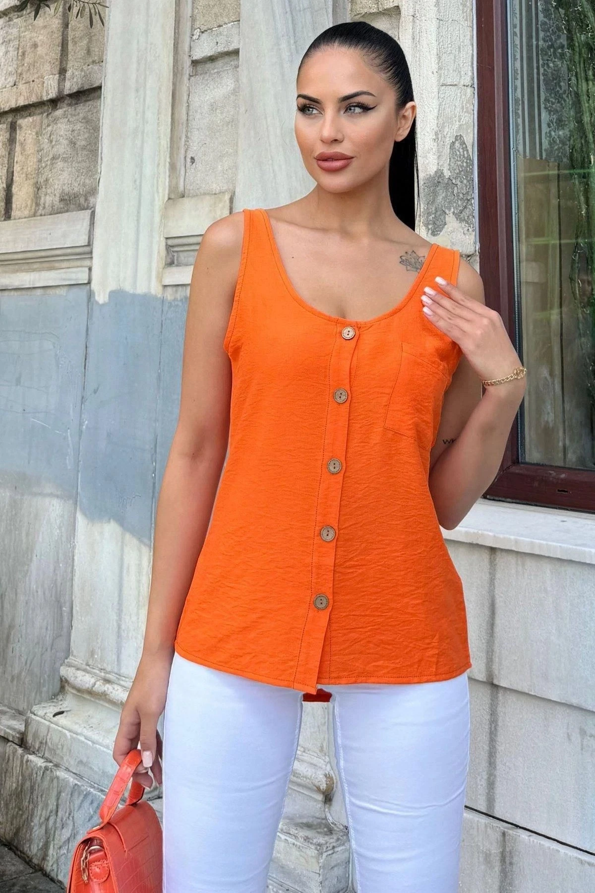 Kadın Turuncu Yuvarlak Yaka Ve Düğme Detaylı, Kalın Askılı Keten Atlet Bluz