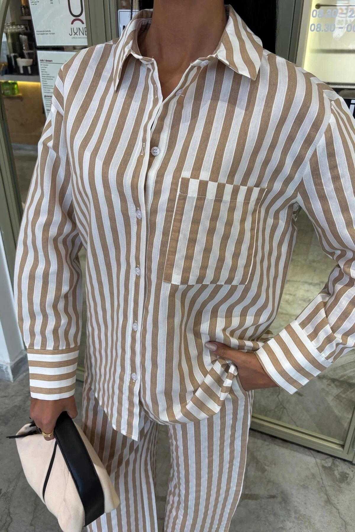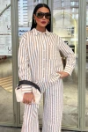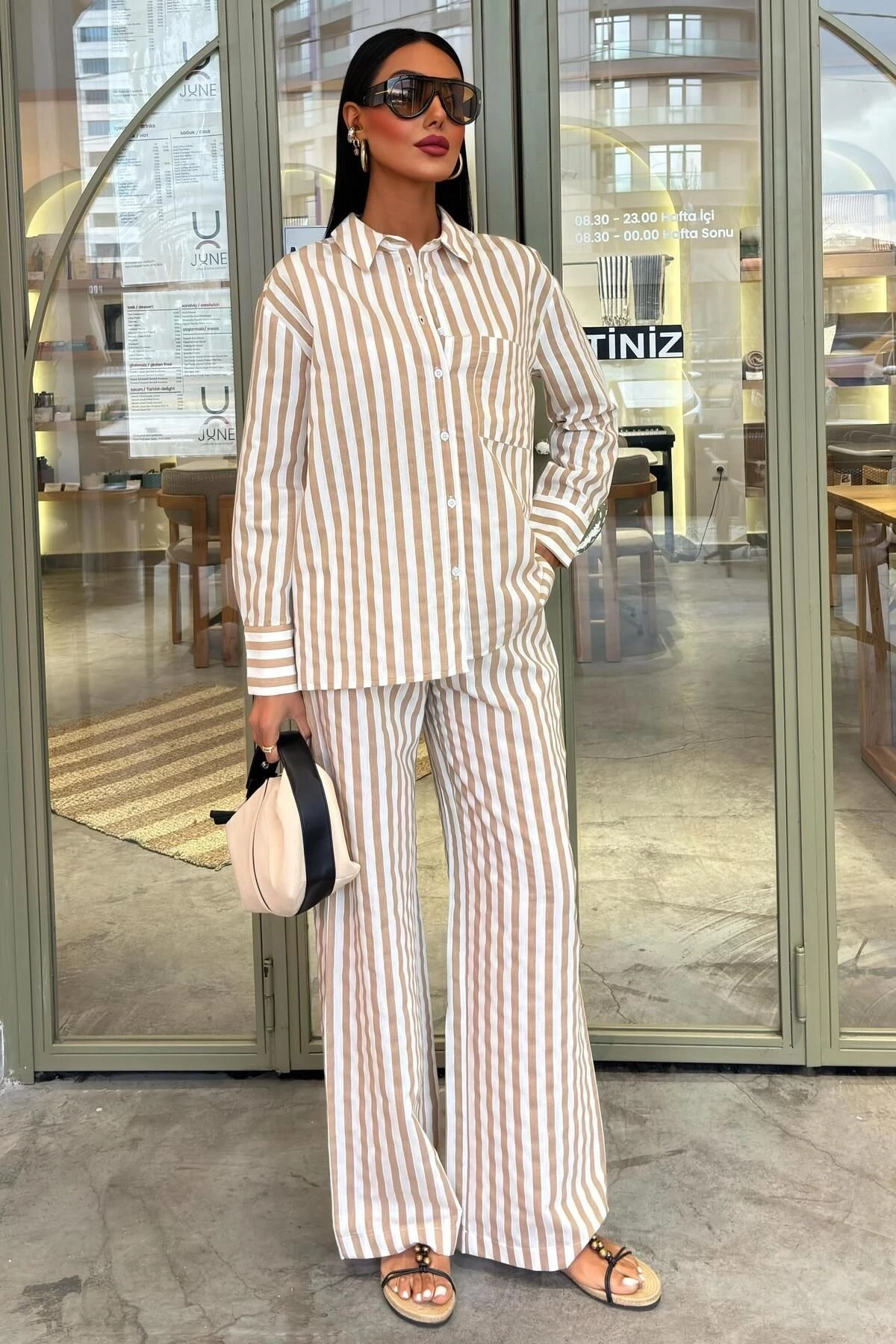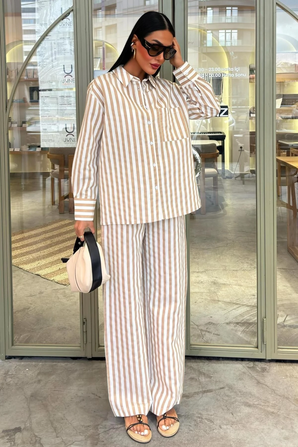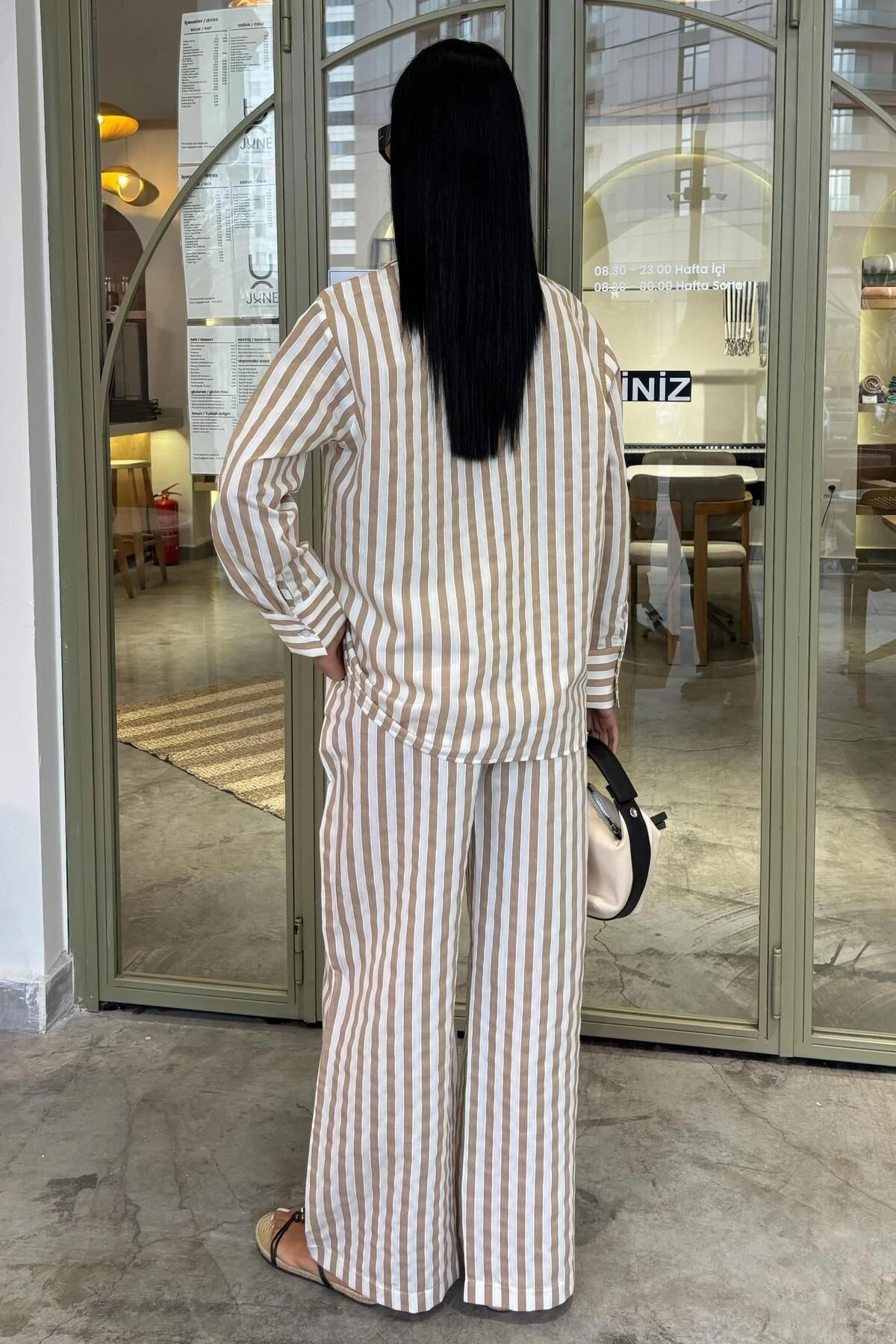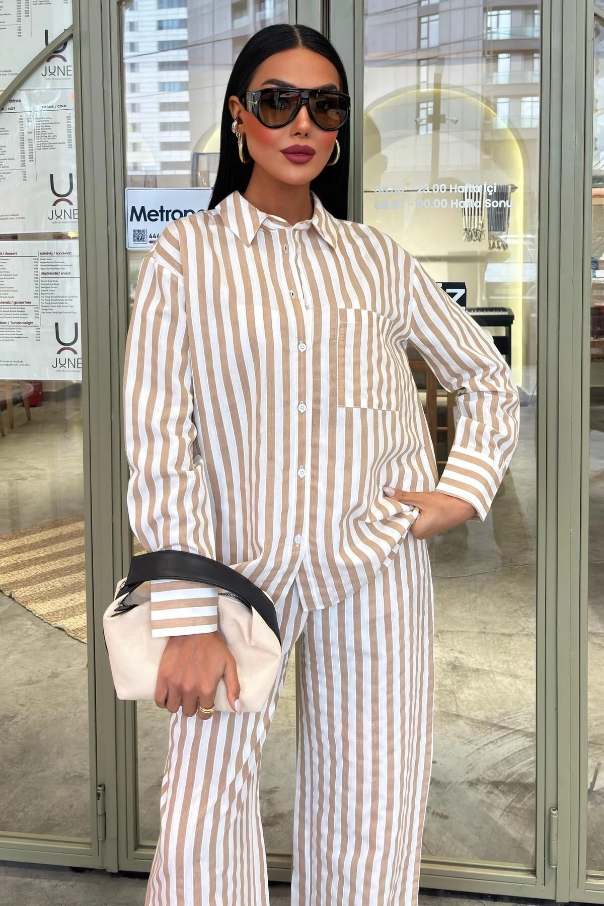 Kadın Vizon Çizgili Oversize Wual Gömlek Yaka Takım