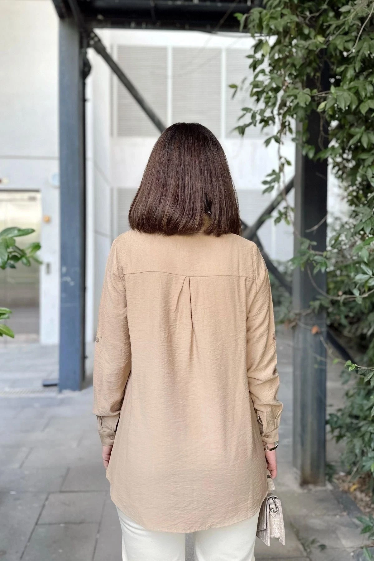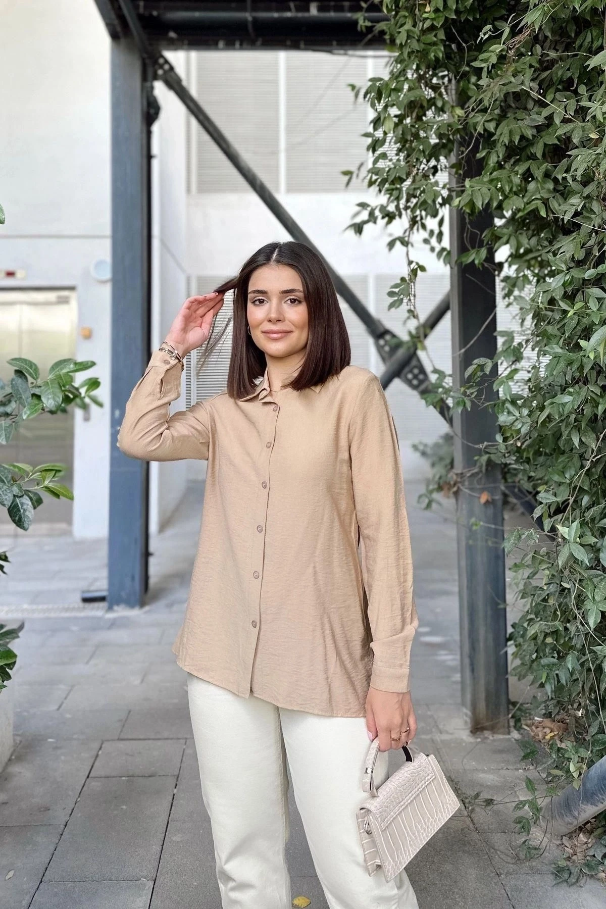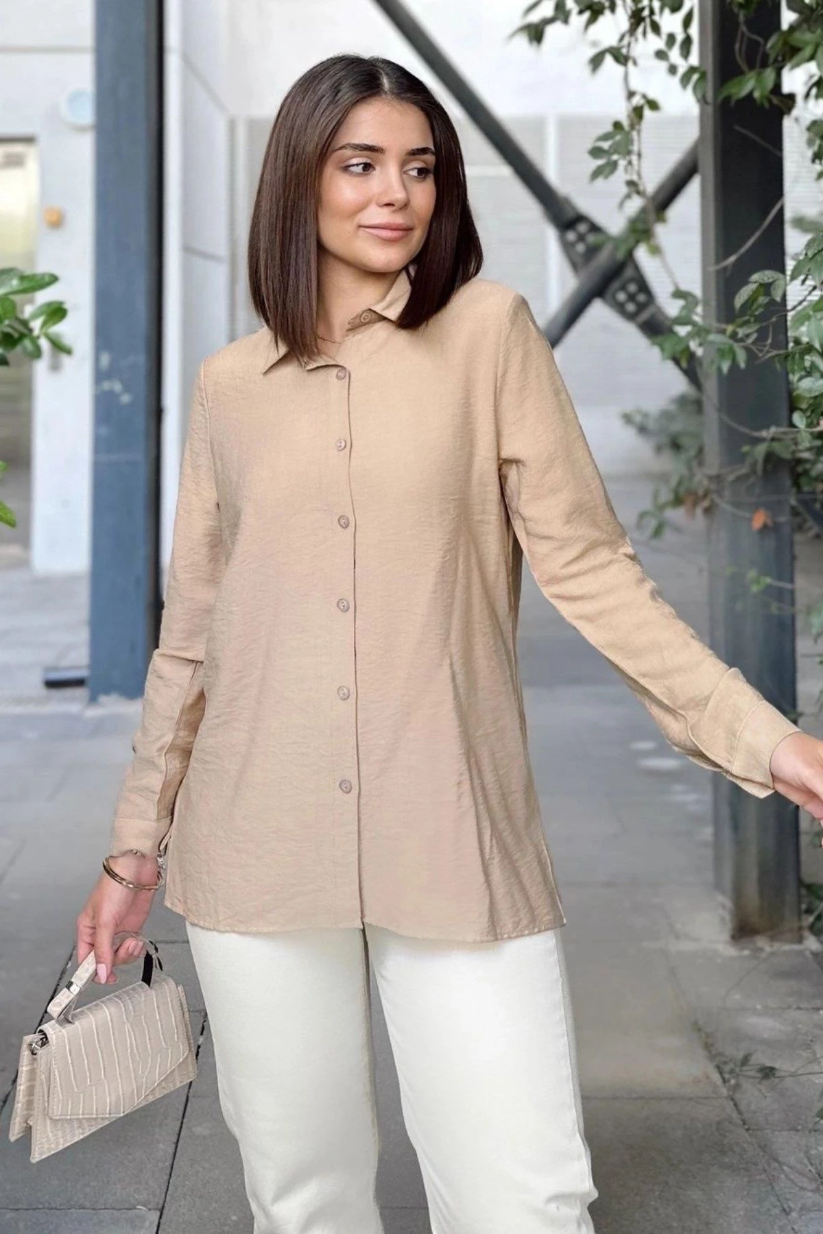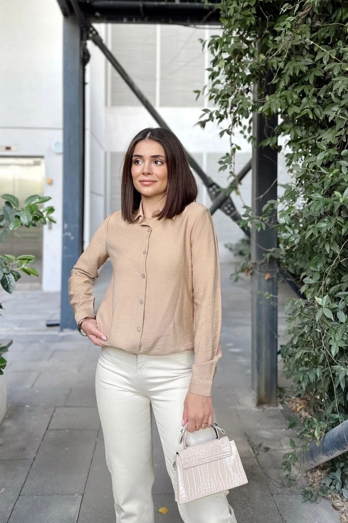 Kadın Vizon Klasik Yaka Uzun Kol Regular Kesim Standart Boy Gömlek (Özel Kumaş)