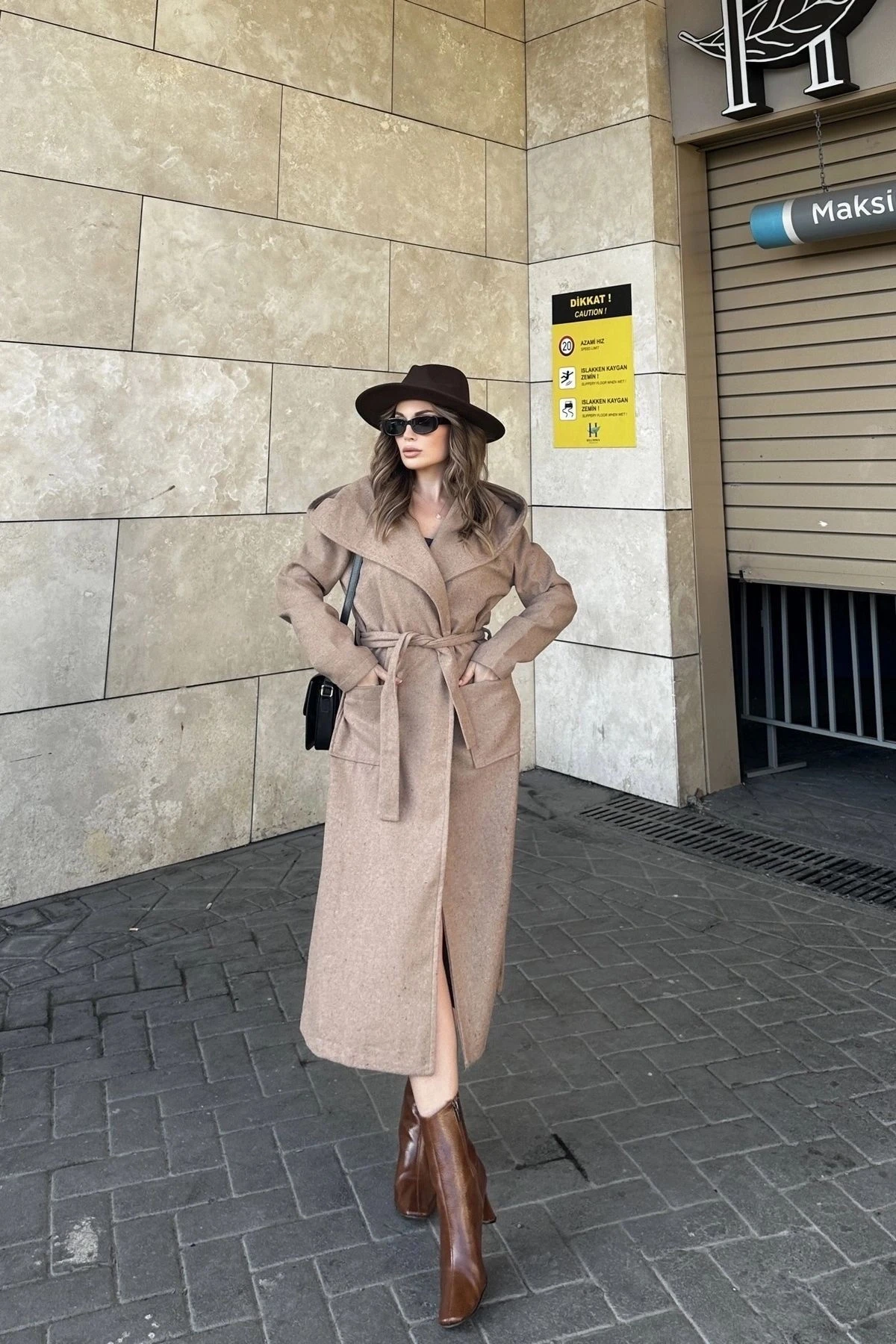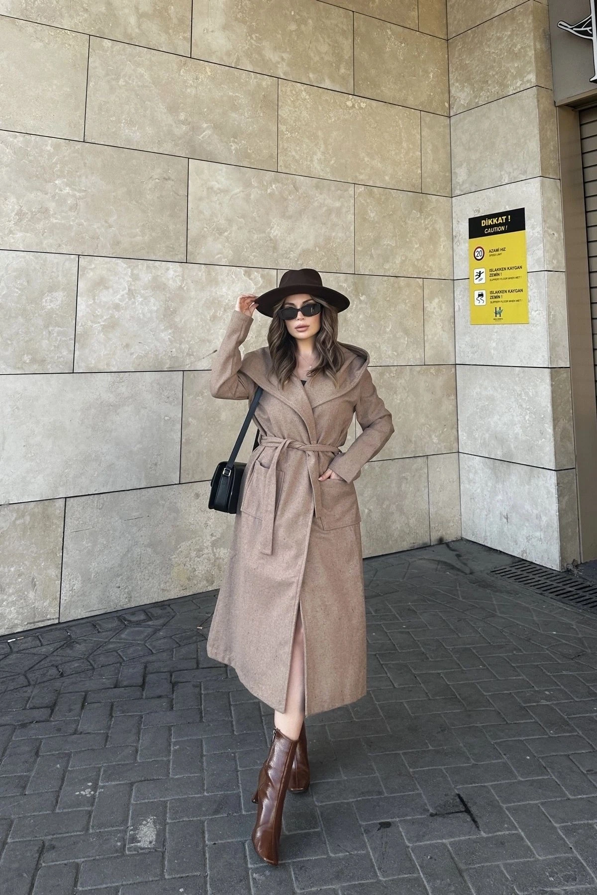 Kadın Vizon Kruvaze Yaka, Kapüşonlu, Çift Cepli, Beli Kemerli, Uzun Kaşe Kaban (ASTARSIZ)