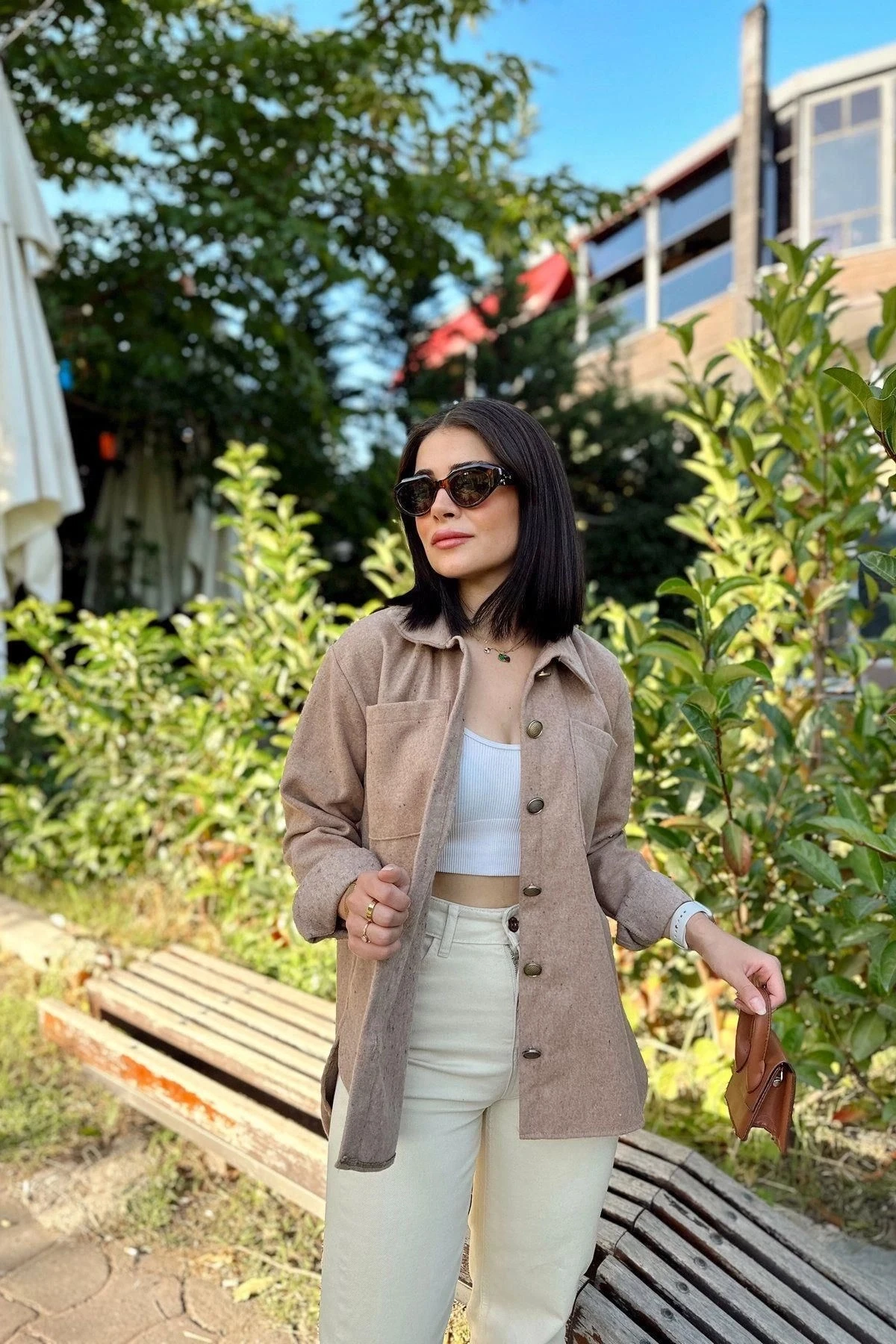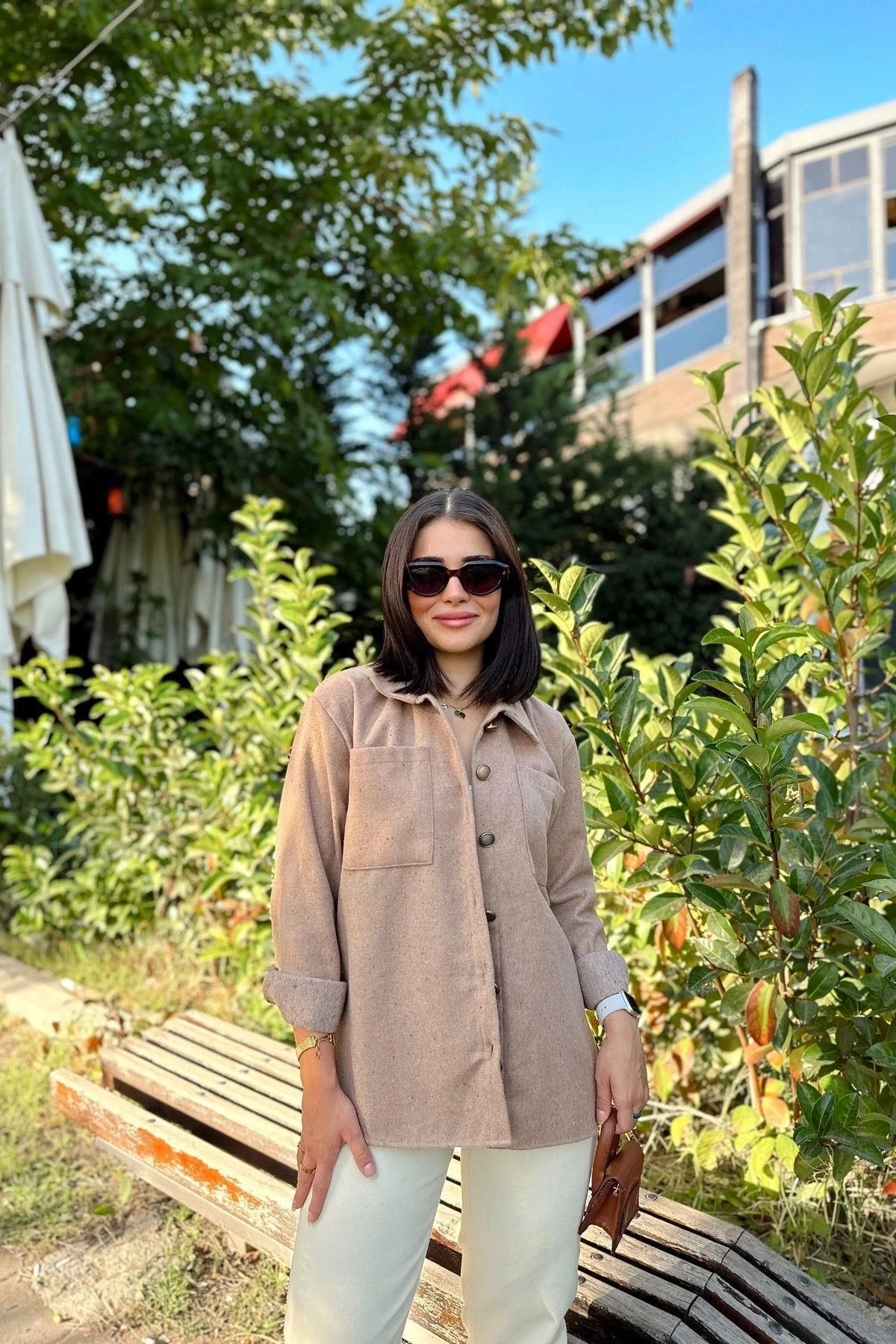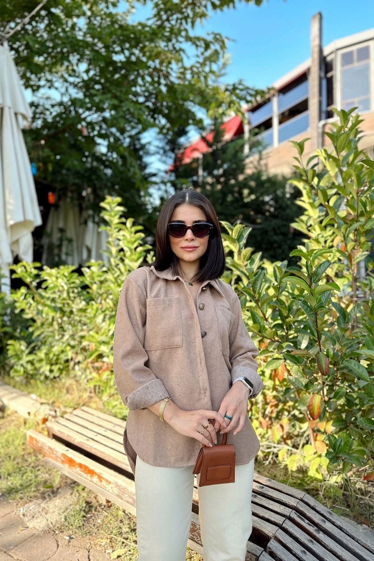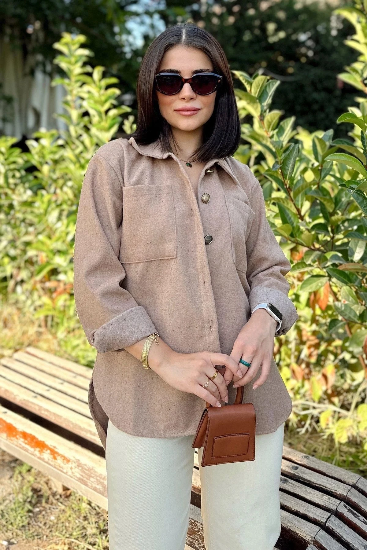 Kadın Vizon Uzun Kol, Çift Cepli, Eteği Oval Kesim, Kaşe Gömlek Ceket