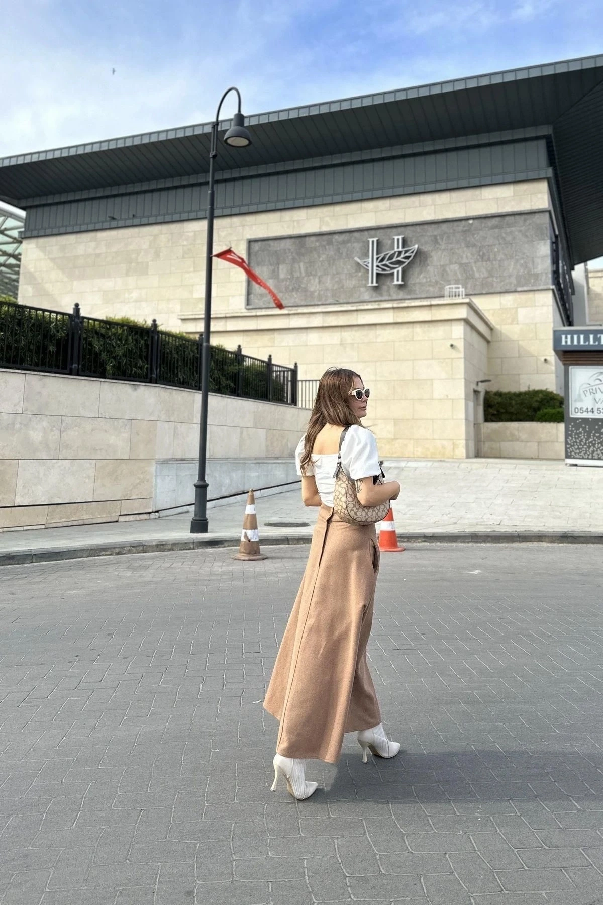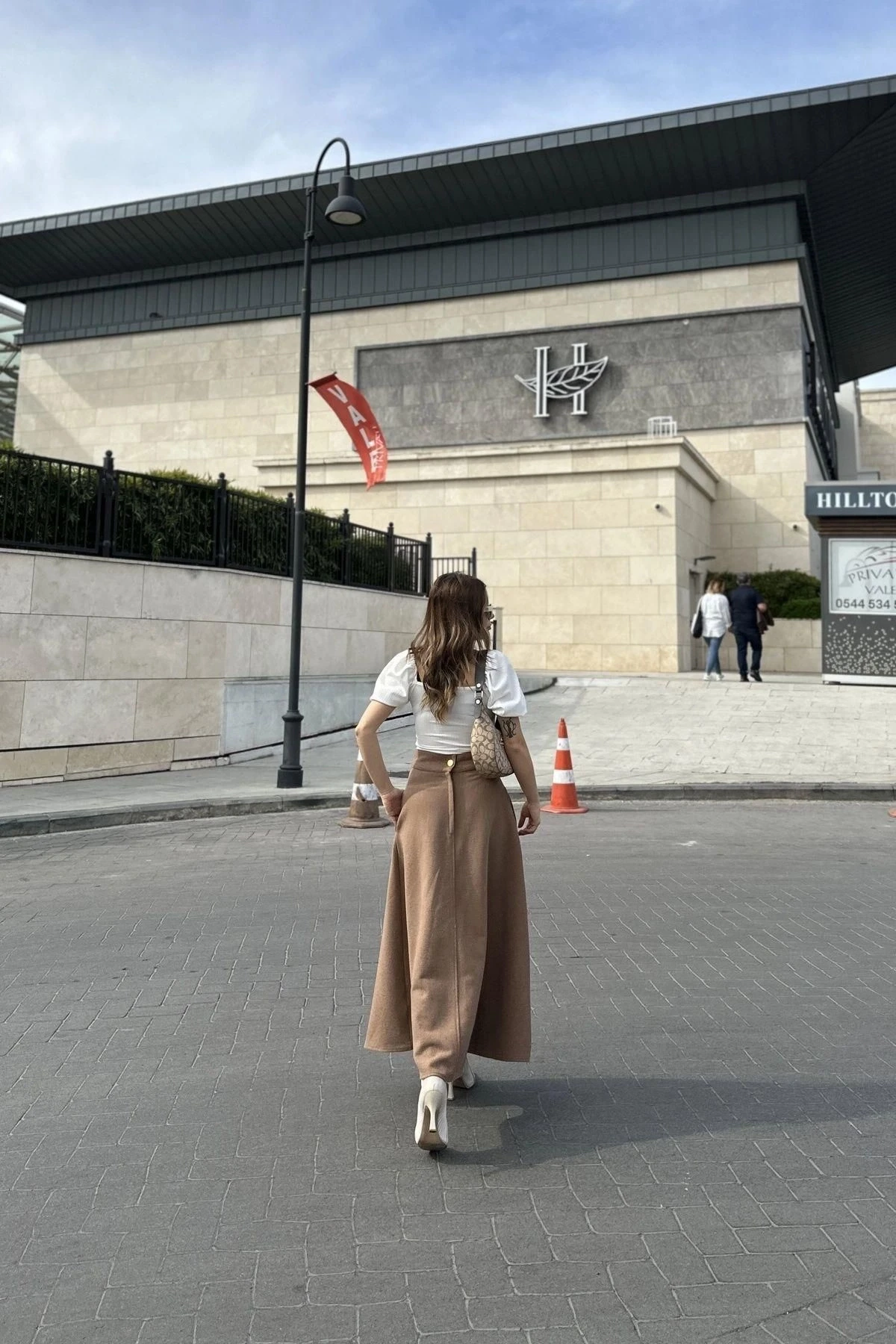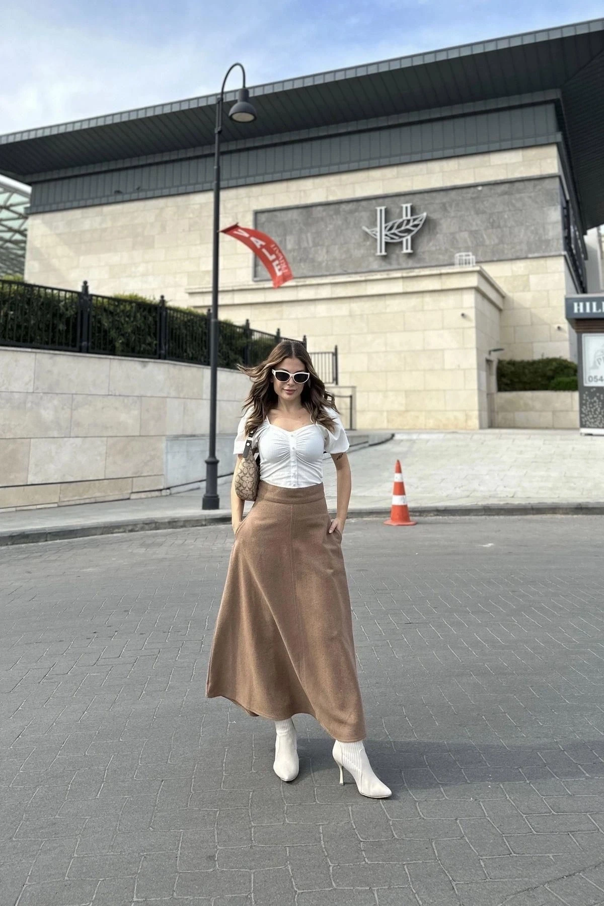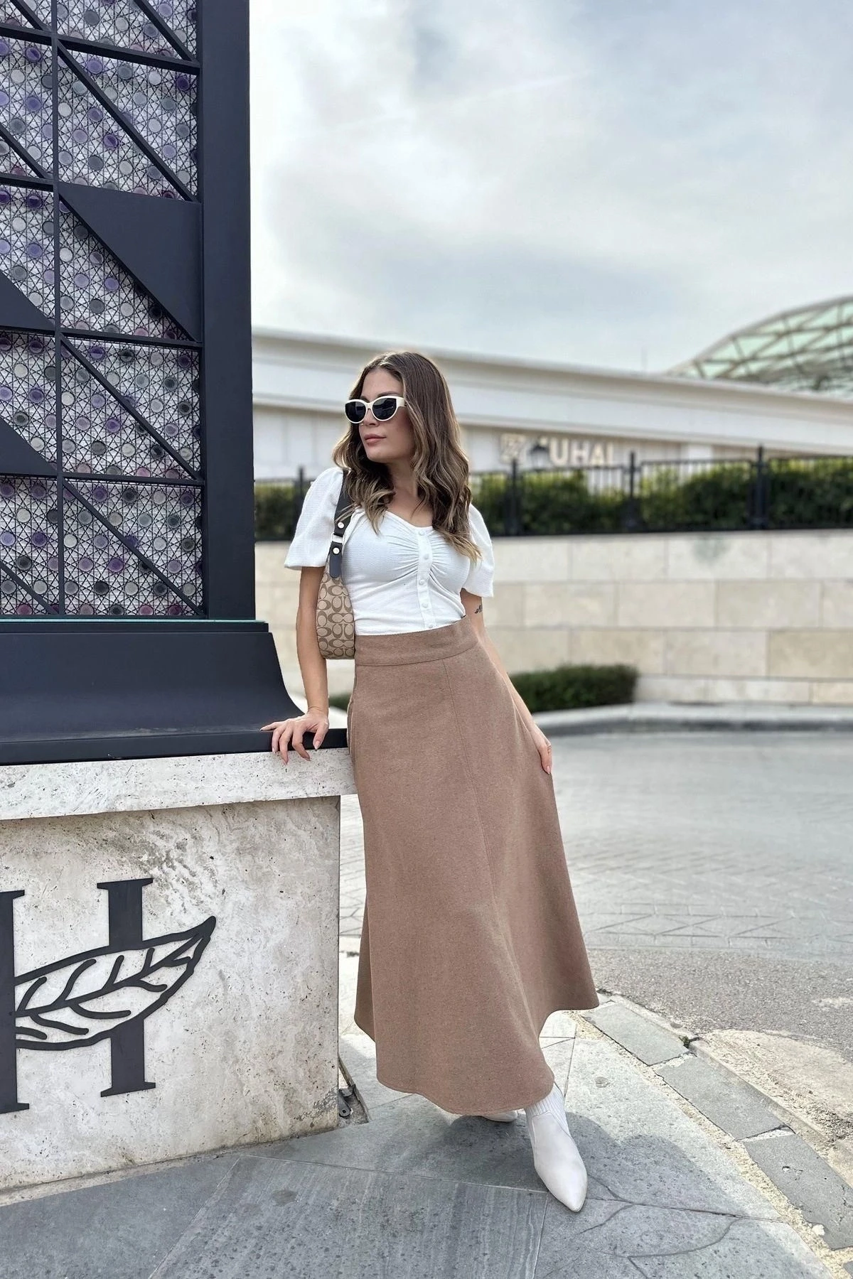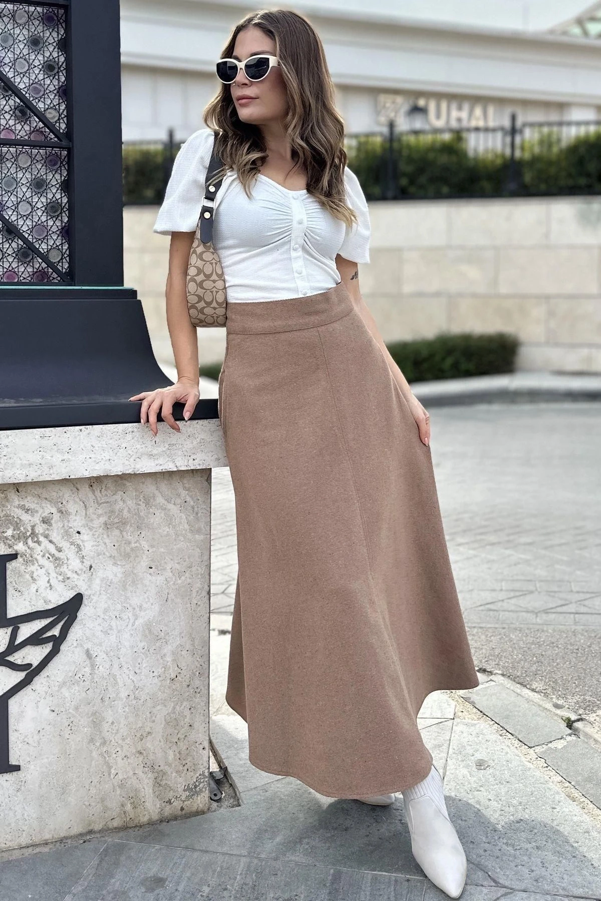Kadın Vizon Yüksek Bel, Cepli, Uzun, Fitilli Kaşe Kumaş, Maksi Kiloş Etek (DAR KALIP)