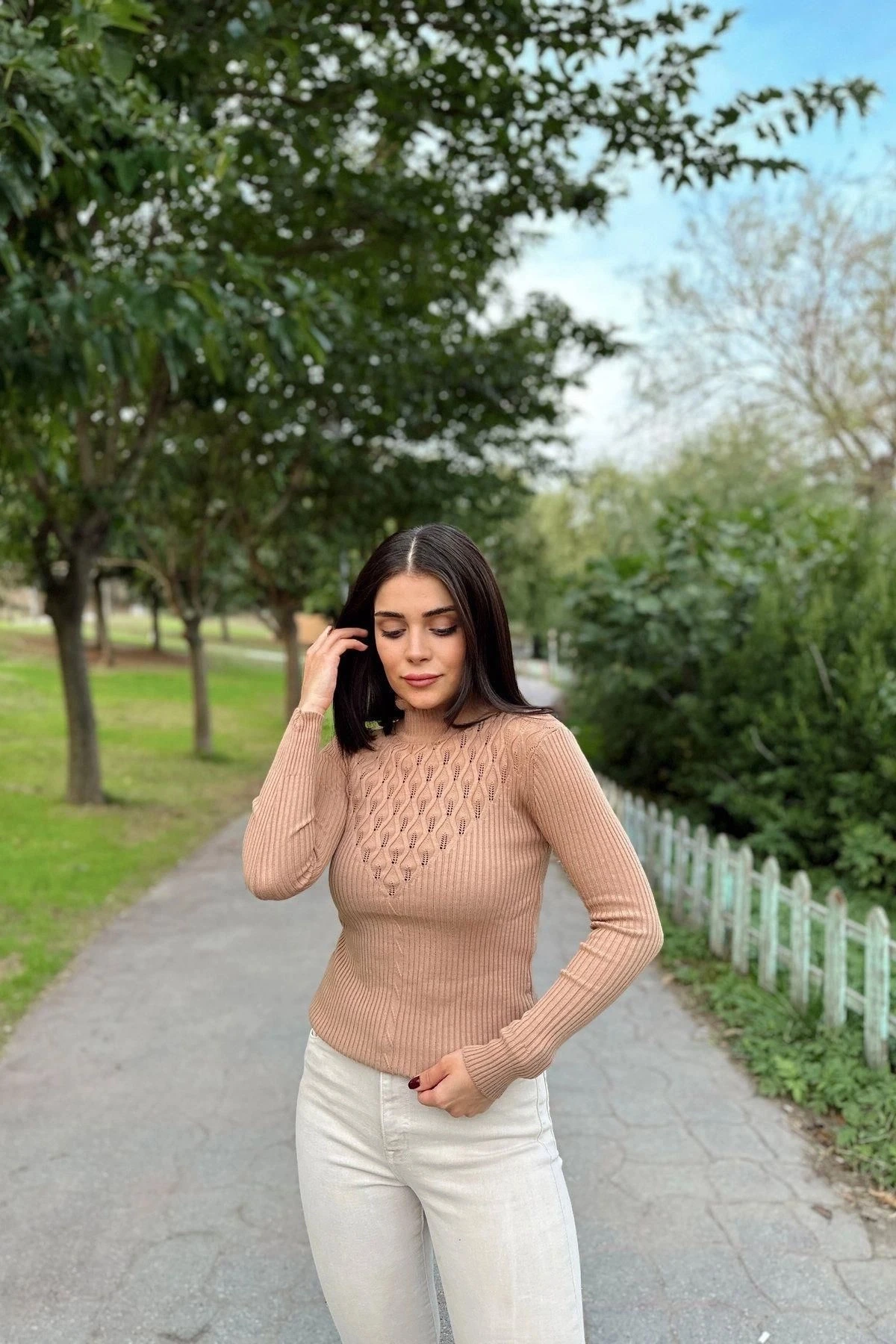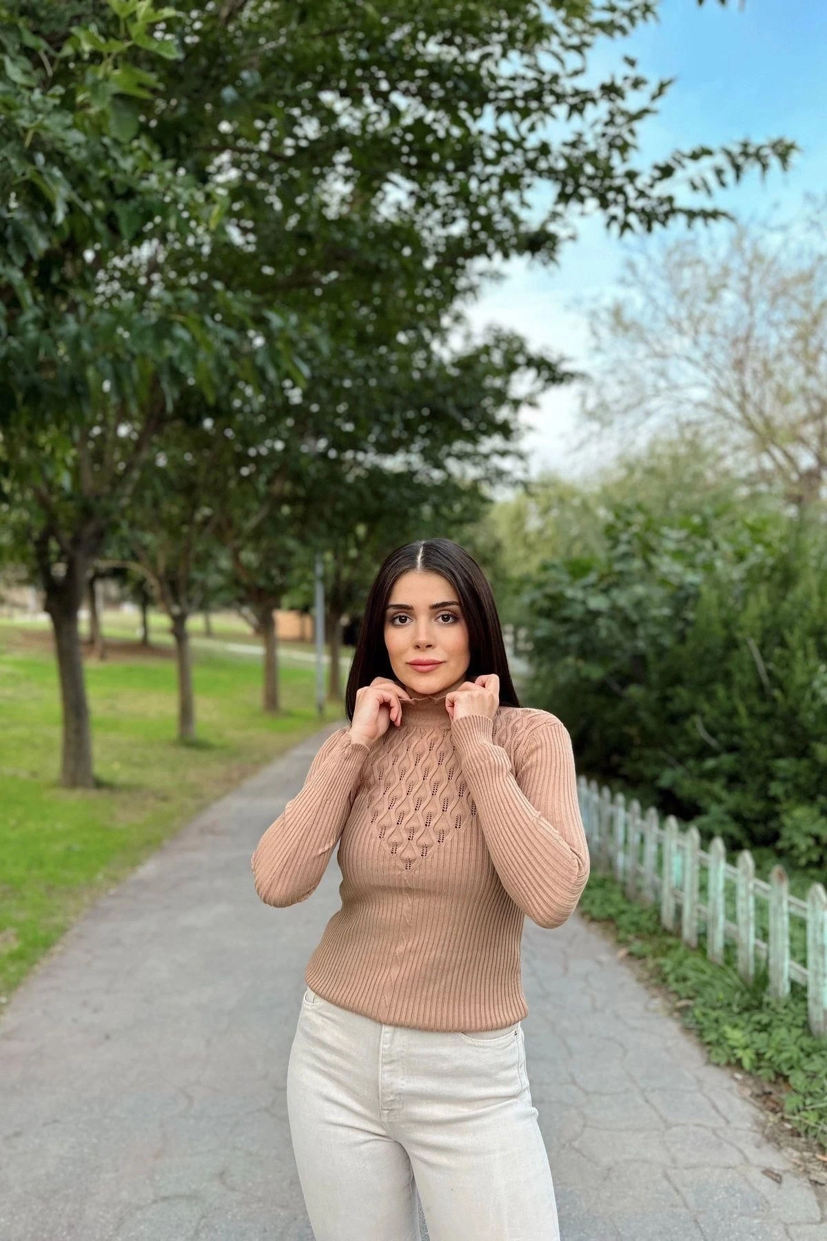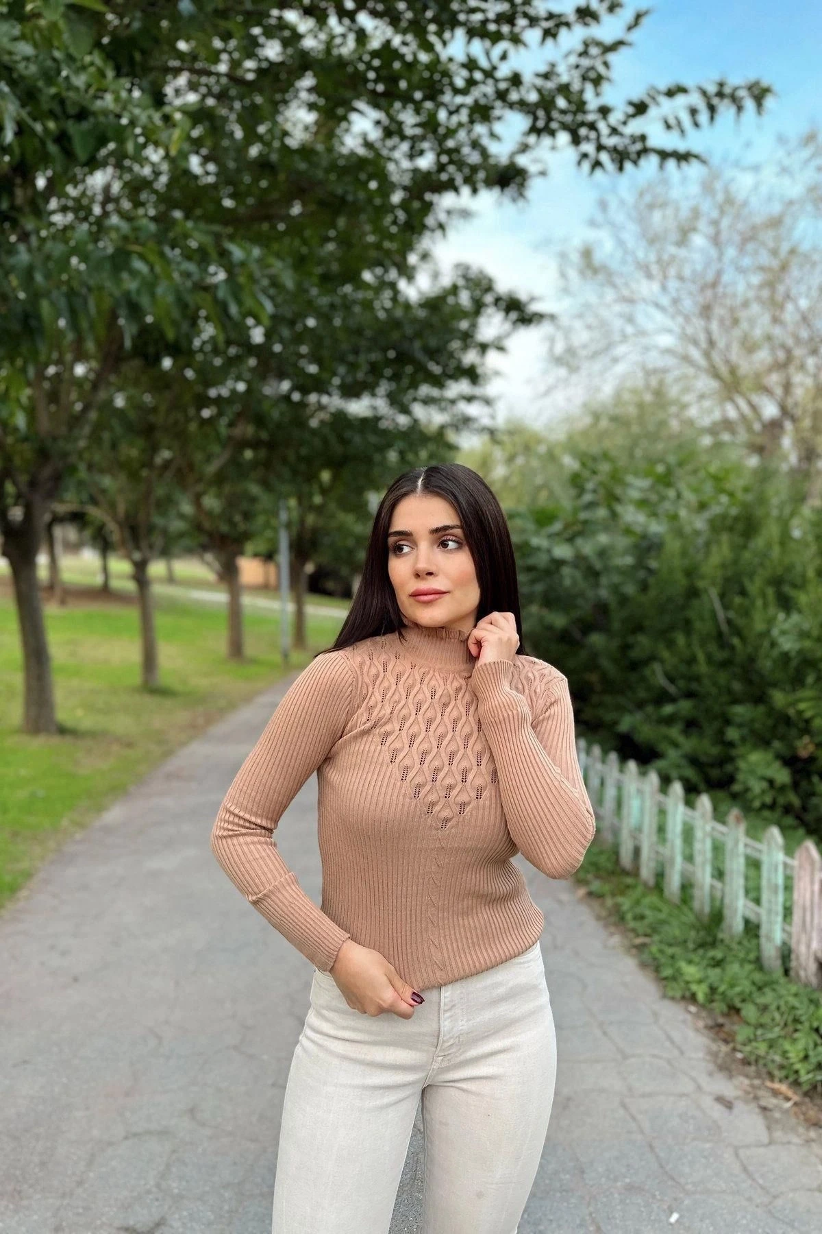 Kadın Vizon Yüksek Yaka, Uzun Kol,Vucüda Oturan Kalıp, Esnek Kumaş, Dekolte Detay, Triko Bluz