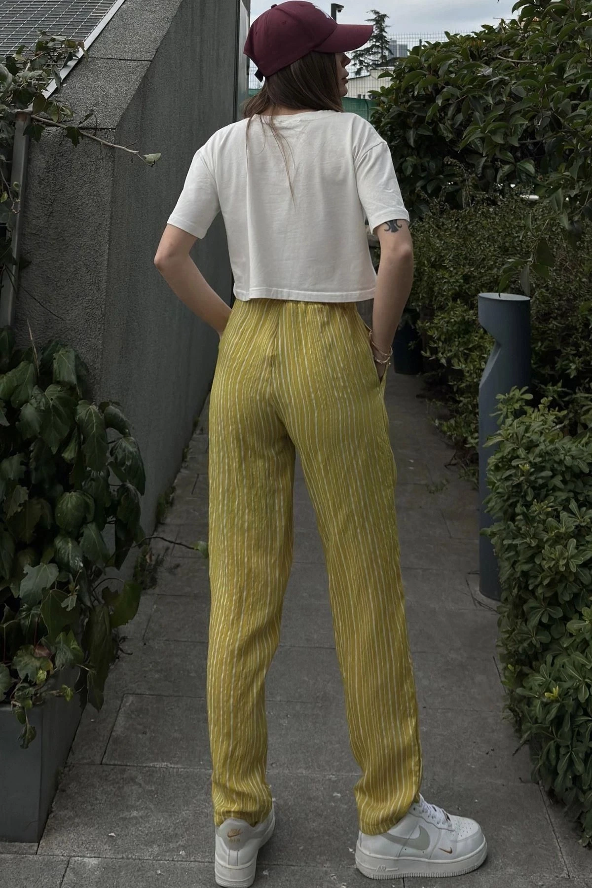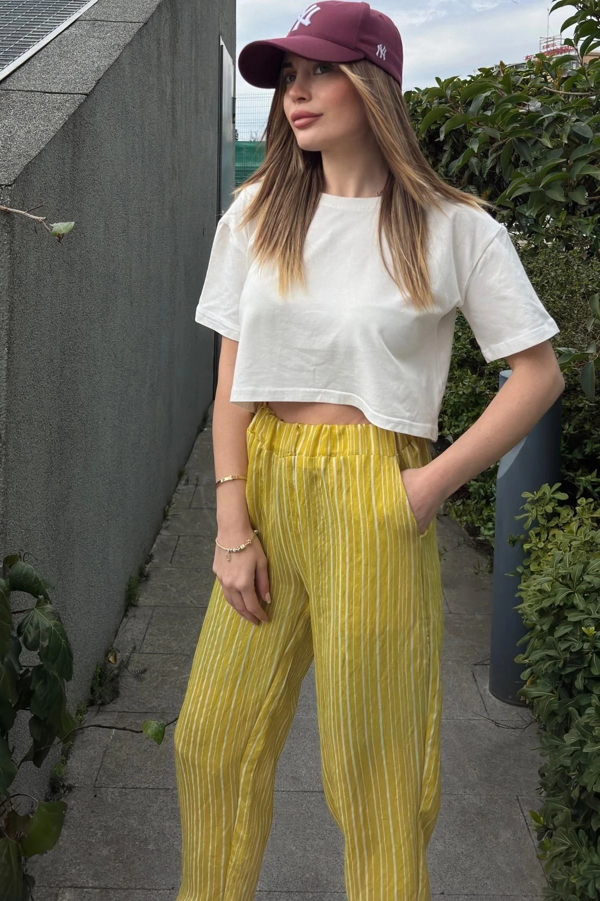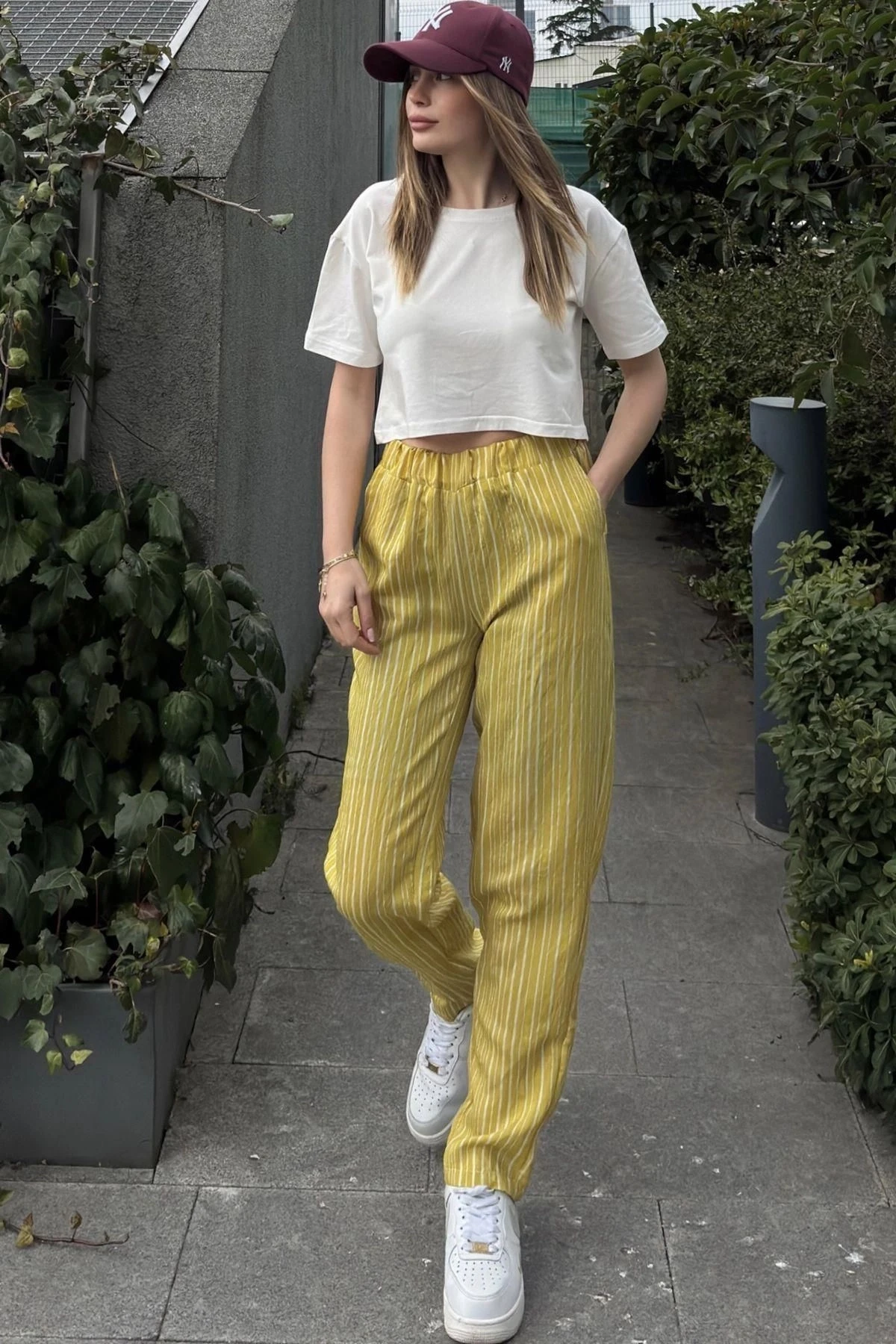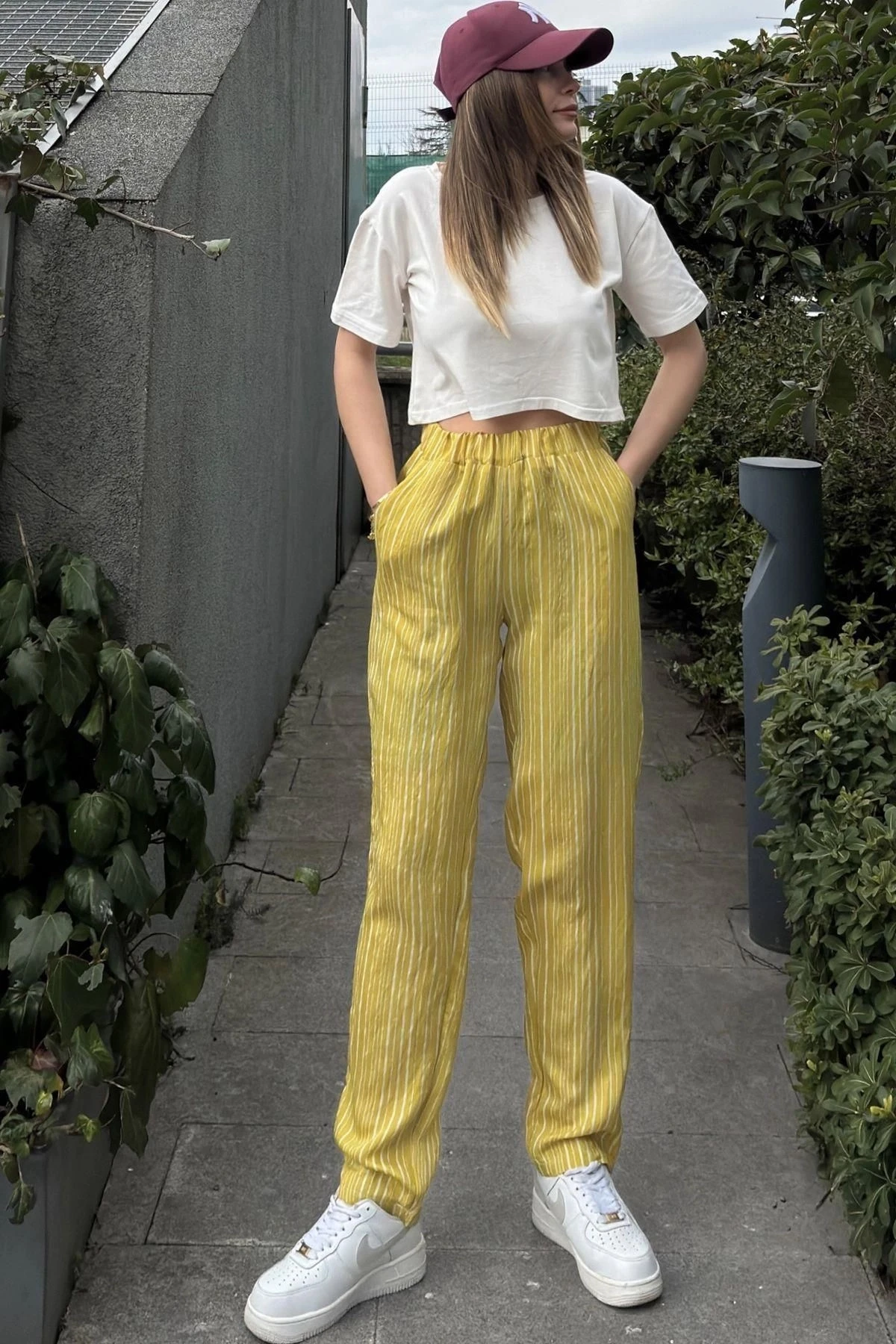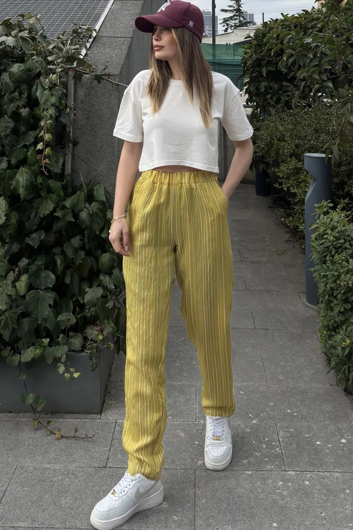 Kadın Yag Yeşili Çizgili, Beli Lastikli, Cepli, Salaş Spor Pantolon
