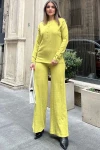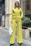 Kadın Yağ Yeşili Düğmeli Yuvarlak Yaka Bluz & Beli Lastikli Geniş Paça Pantolon - Salaş Maya Takım