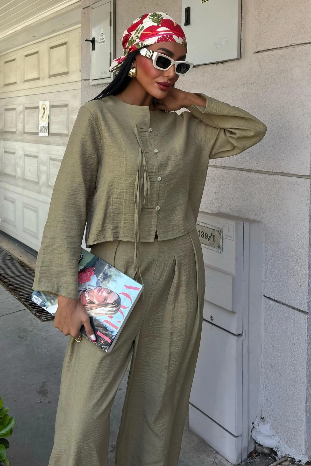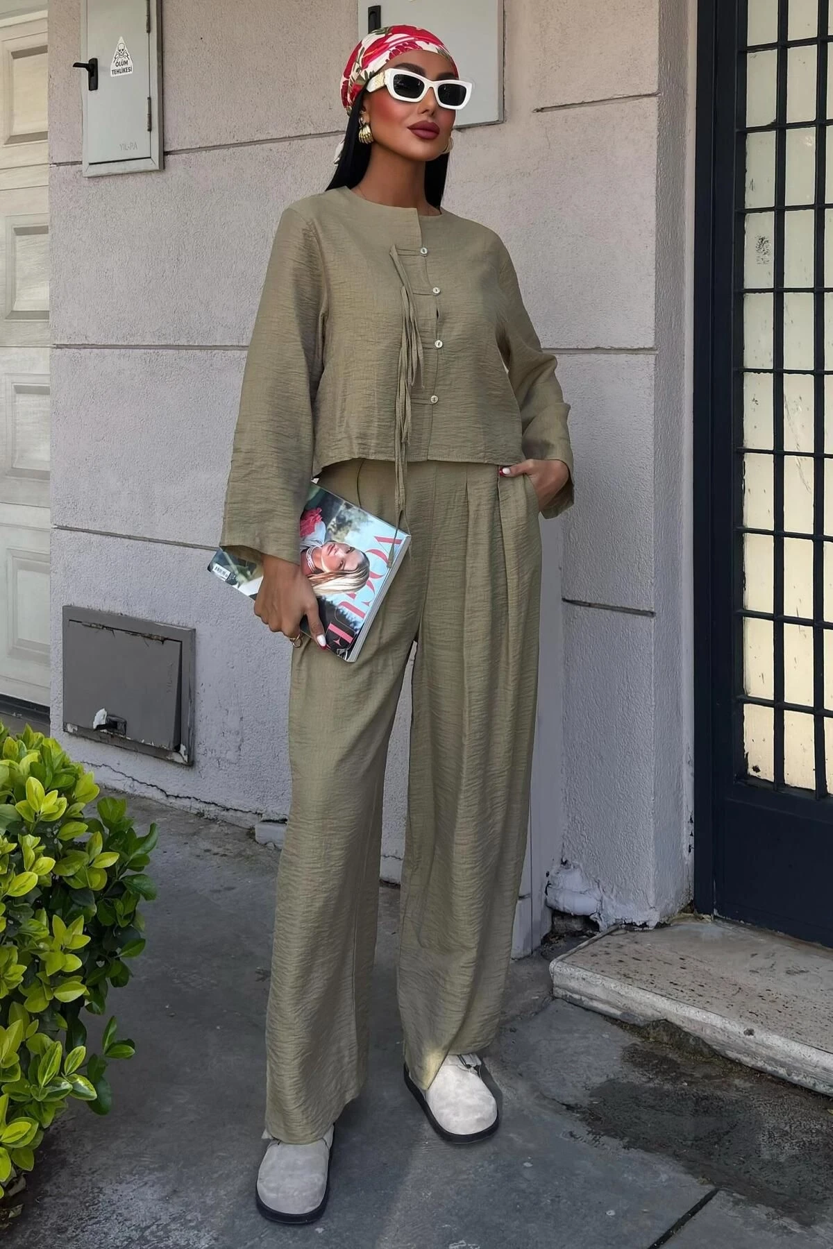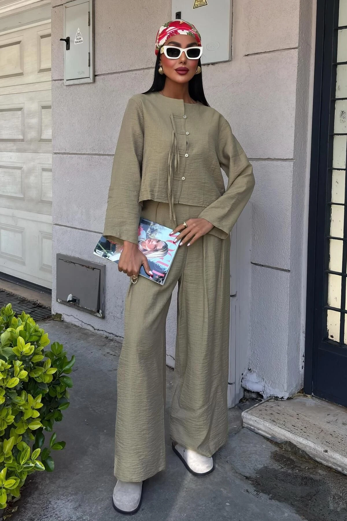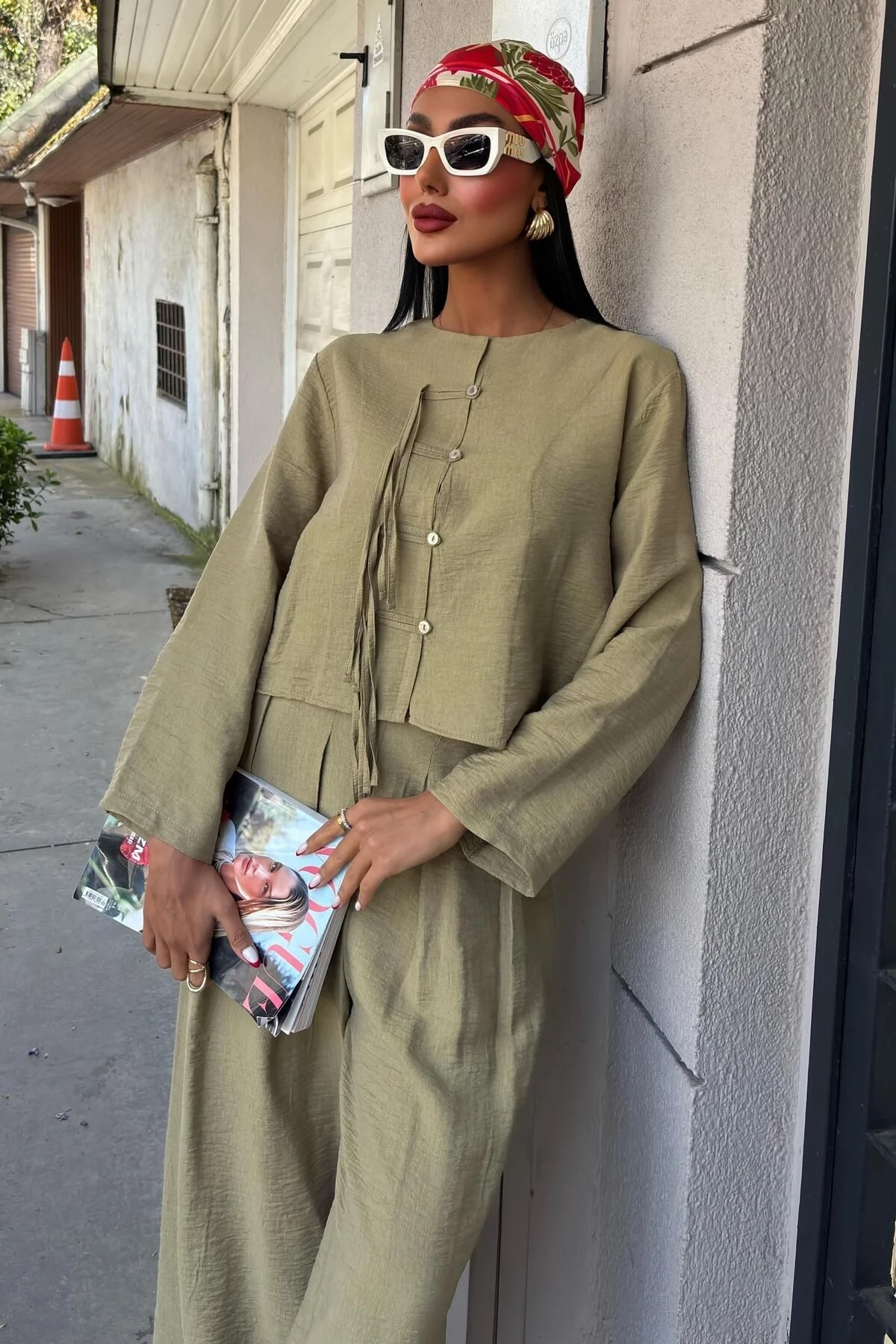 Kadın Yag Yeşili Keten Oversize Uzun Kollu Takım