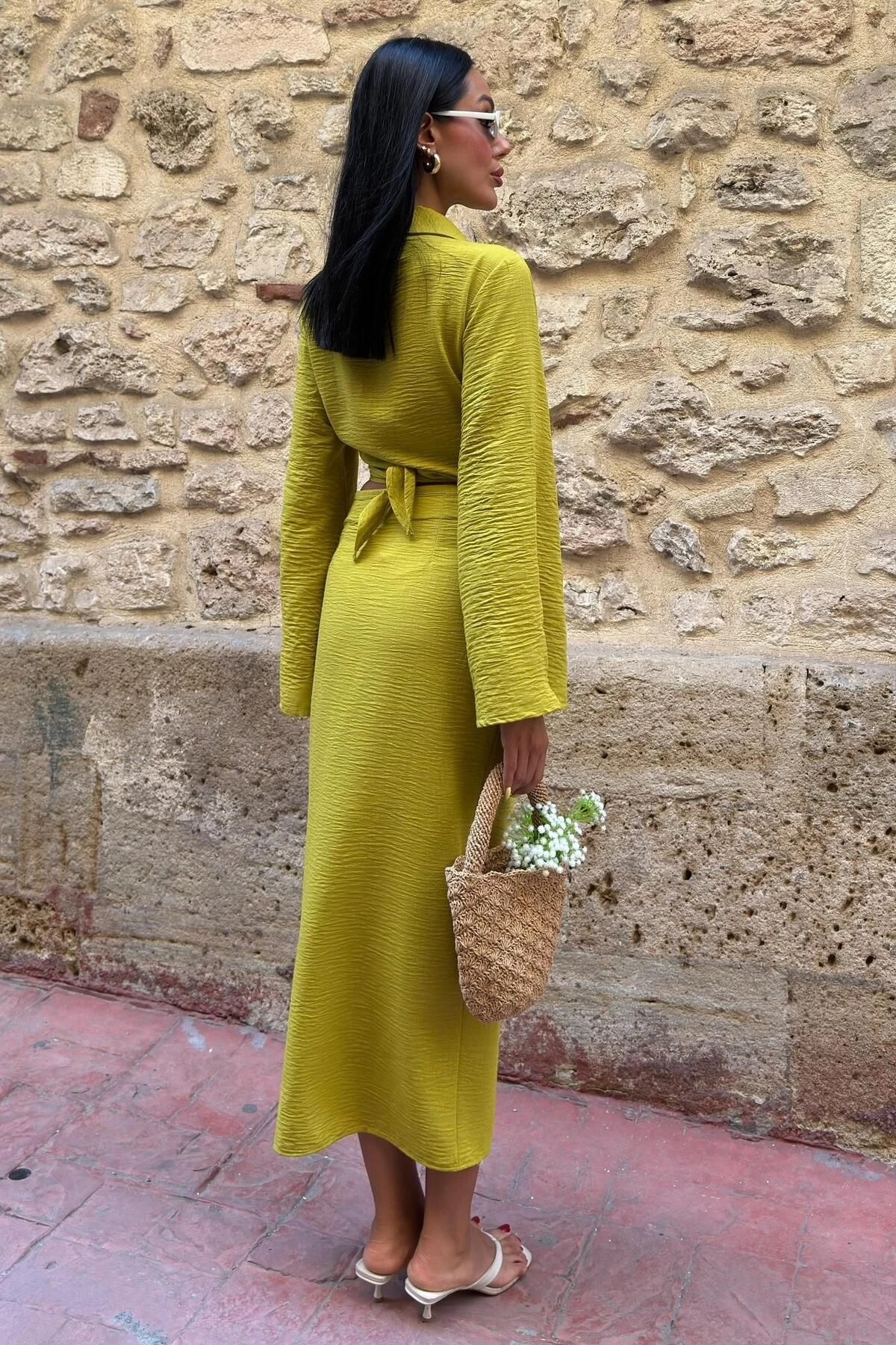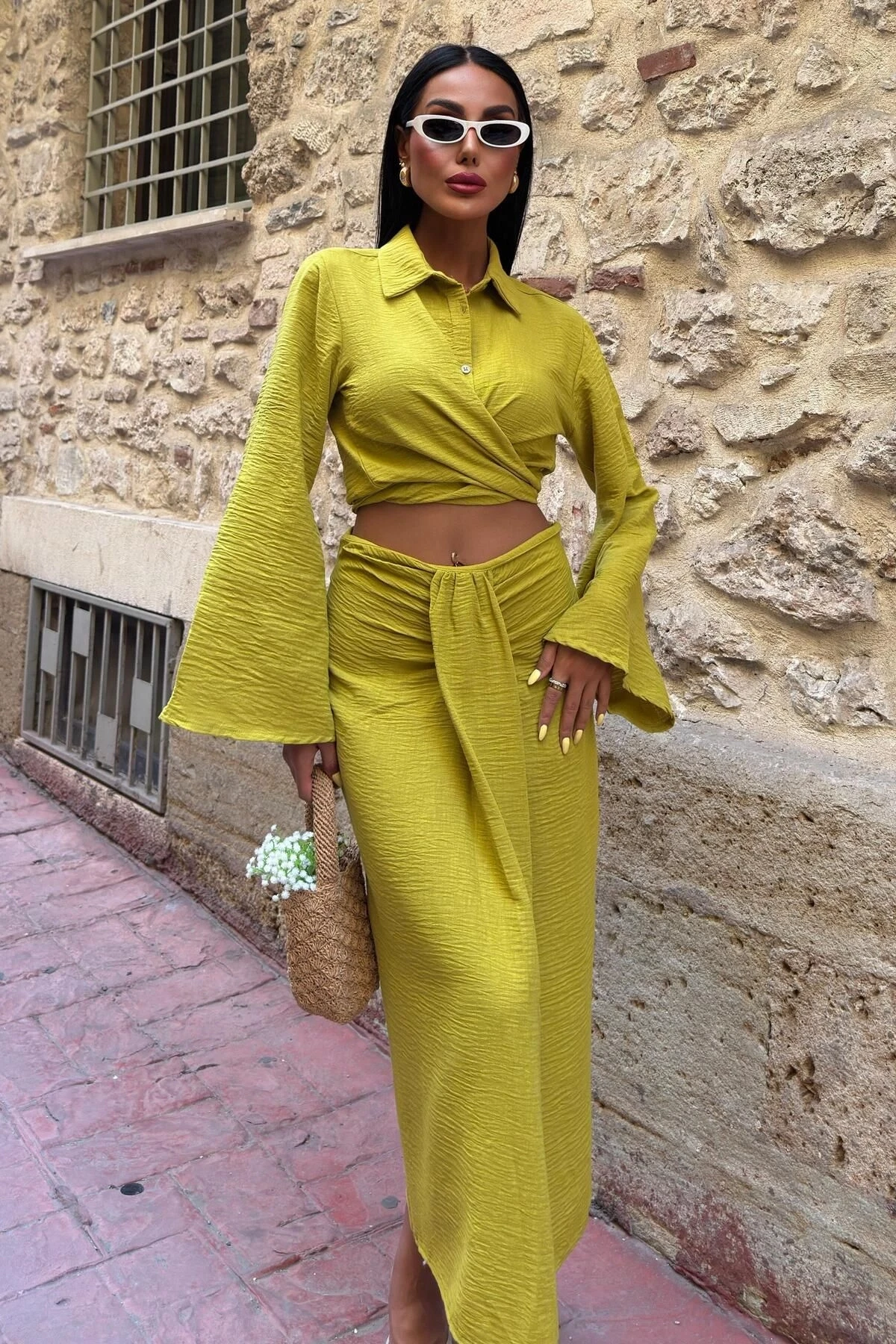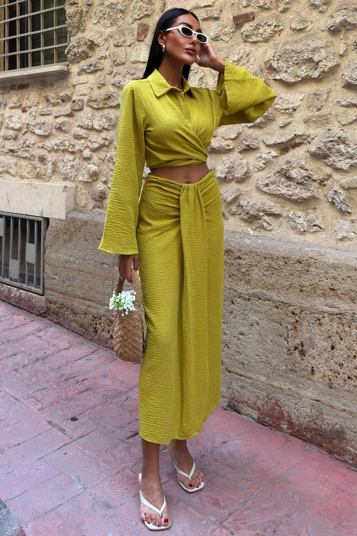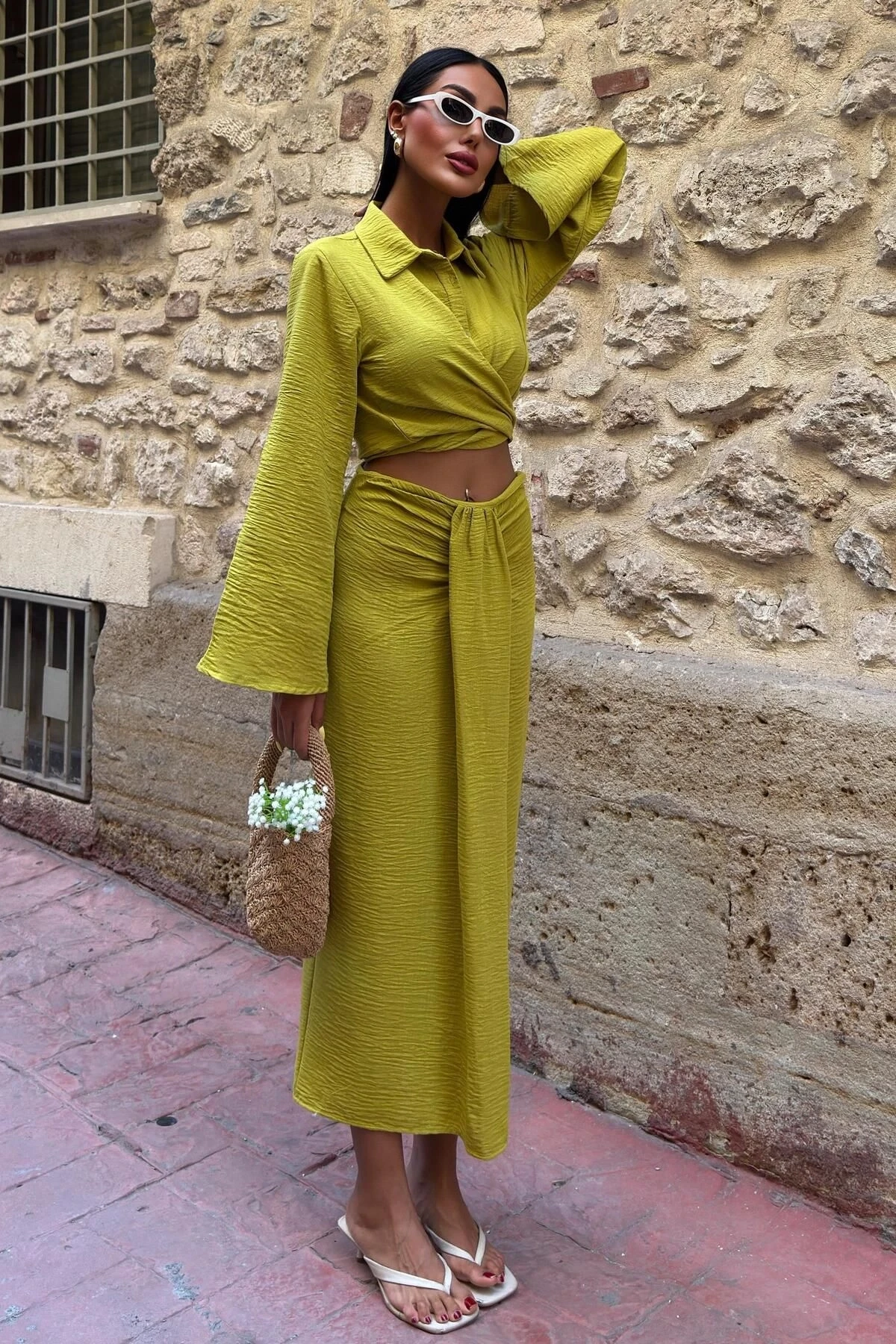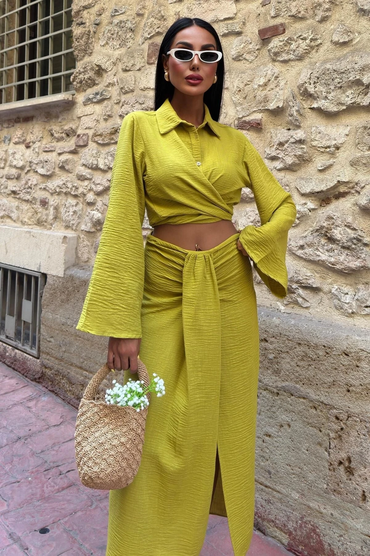 Kadın Yag Yeşili Keten Uzun Kollu Takım