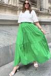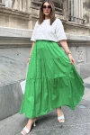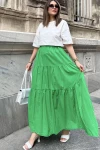 Kadın Yeşil Asimetrik Kesim, Beli Lastikli, Fırfırlı Kat Kumaş, Uzun Pamuklu Etek