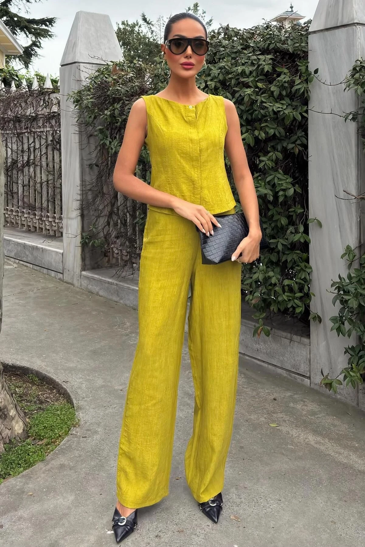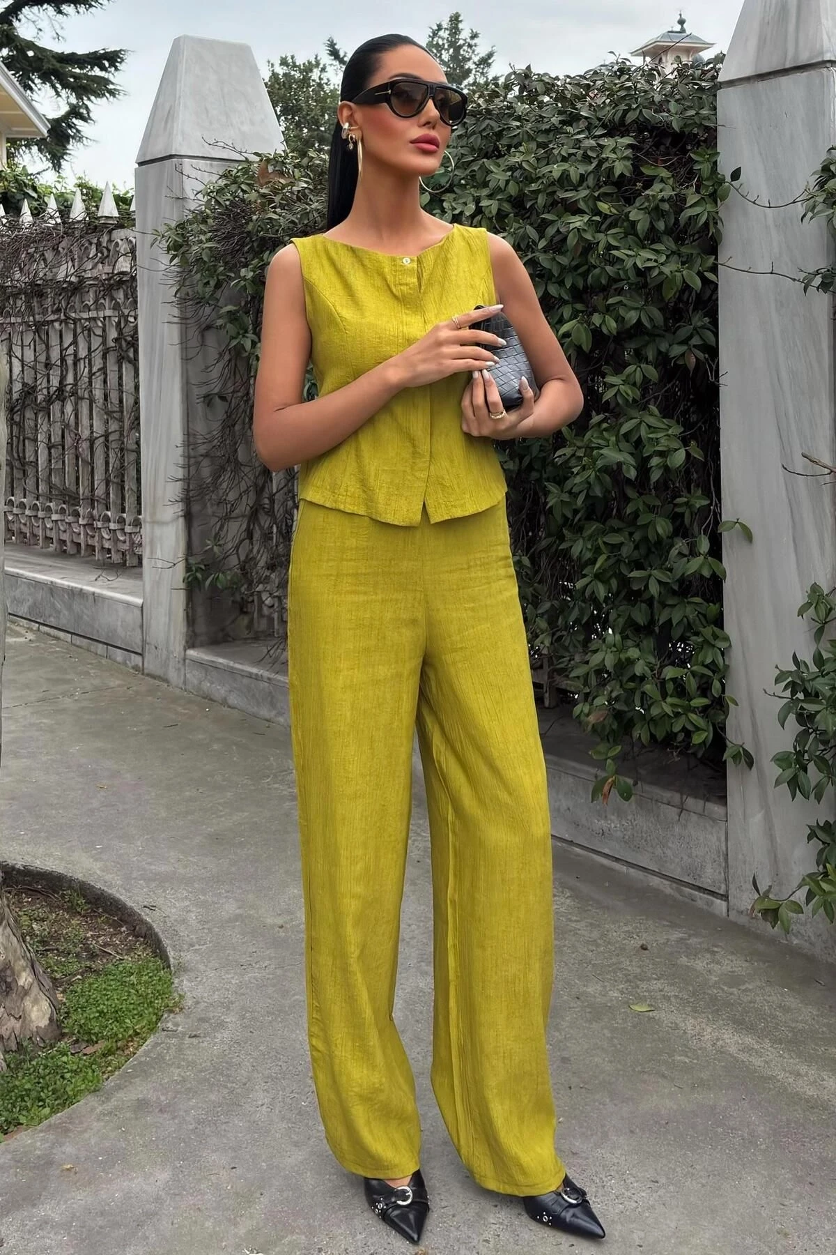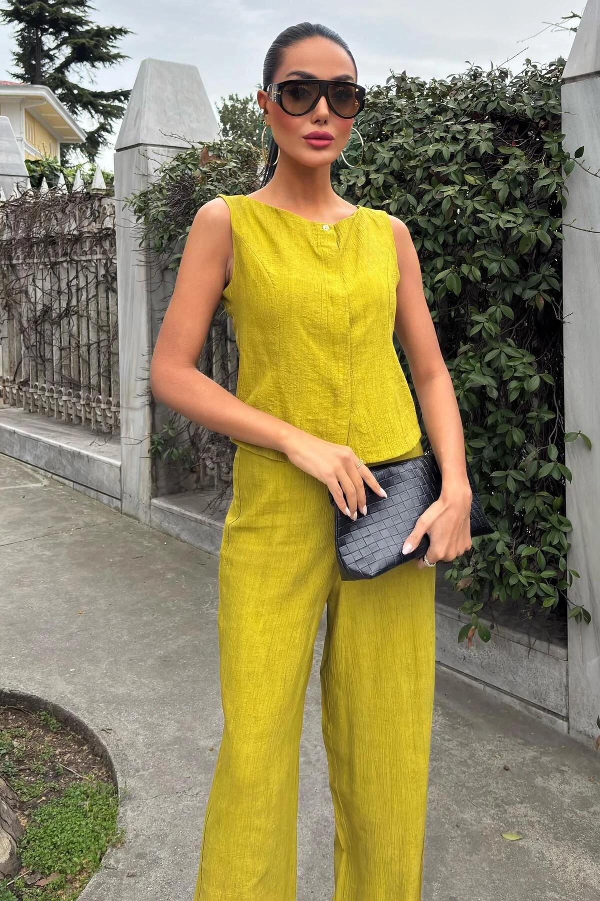 Kadın Yeşil Batik Desenli Kolsuz Uzun Dokuma Takım