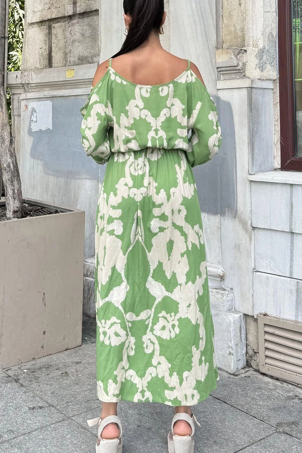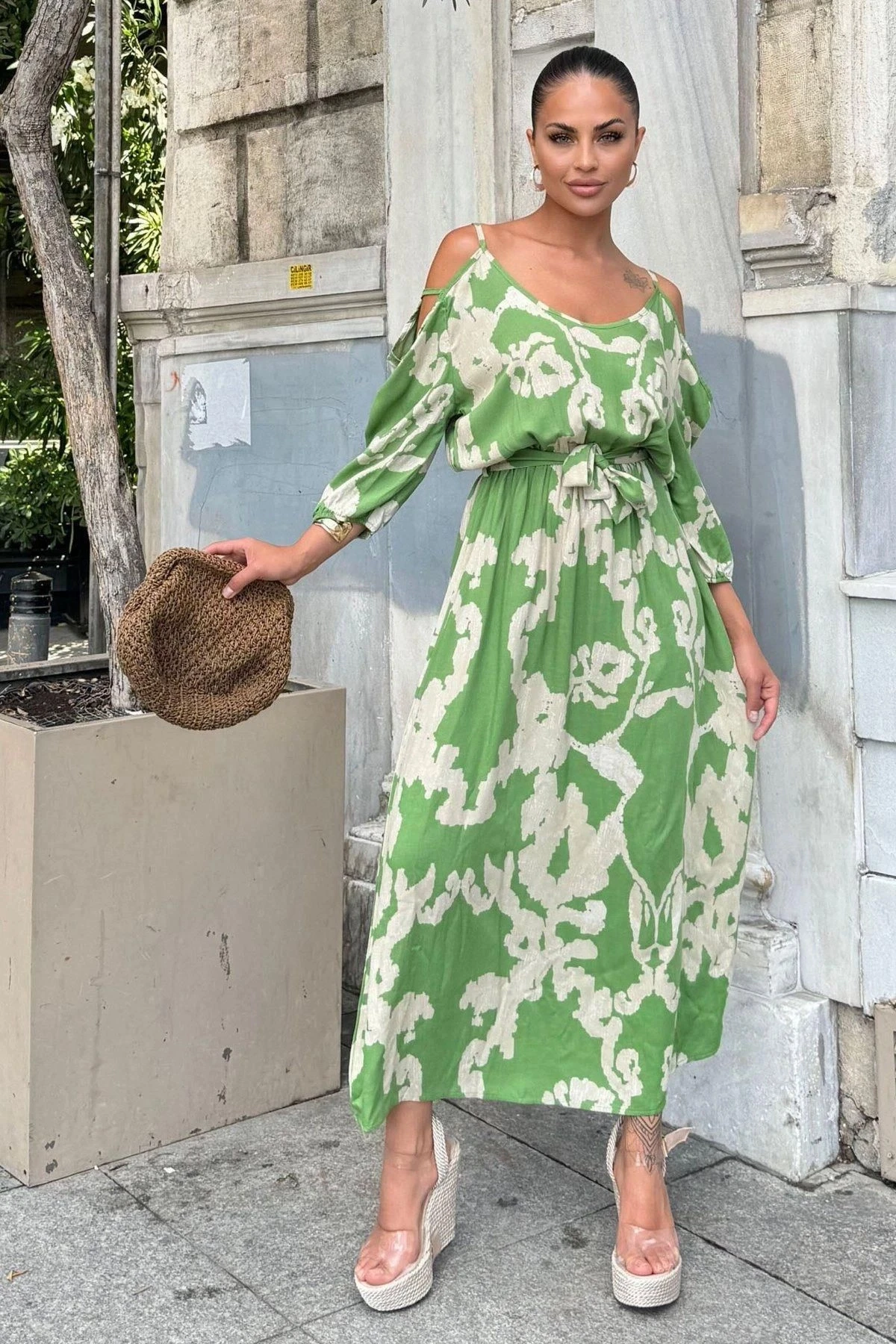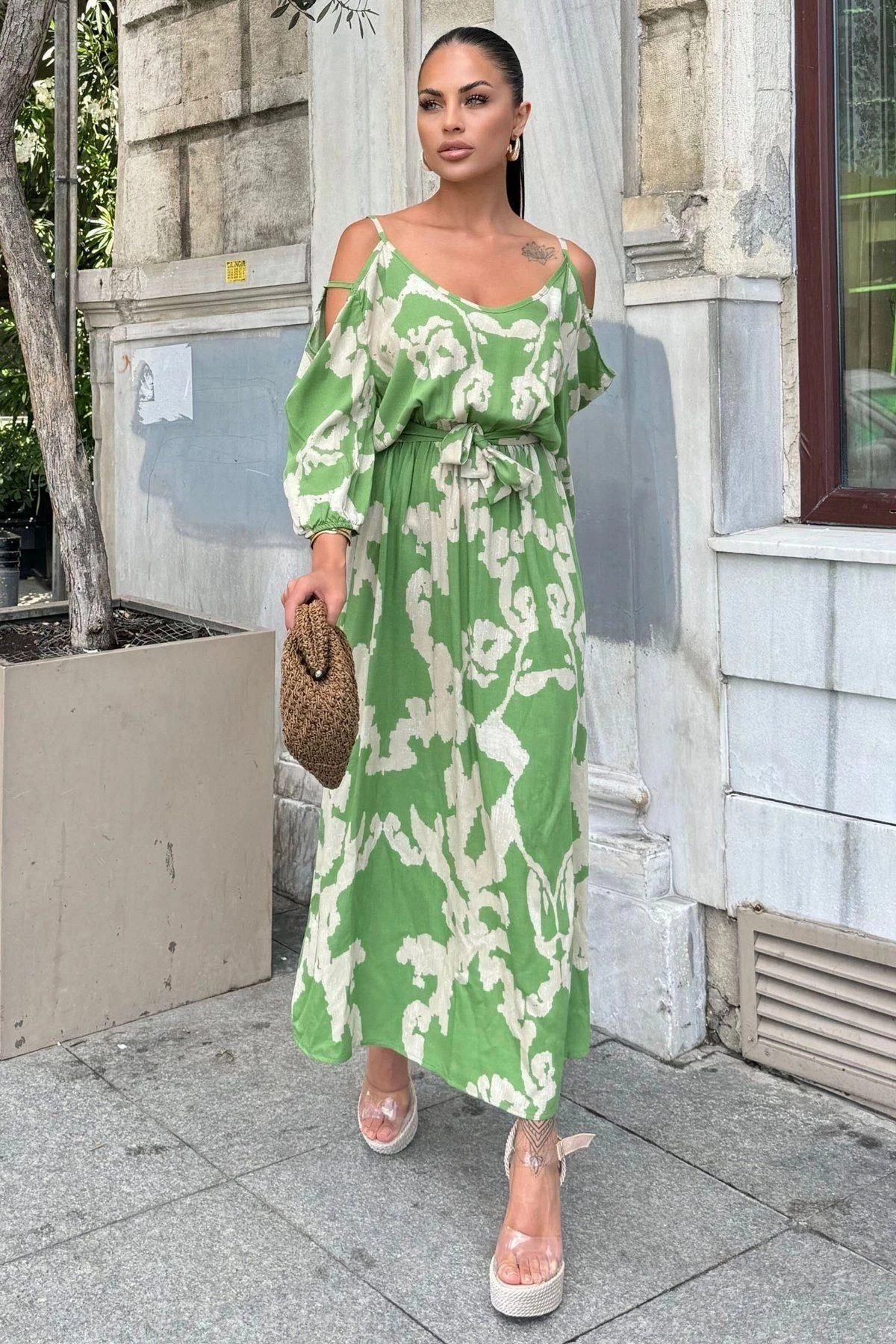 Kadın Yeşil & Bej Kemerli, Omuz Detaylı, Salaş, Dökümlü Uzun Elbise