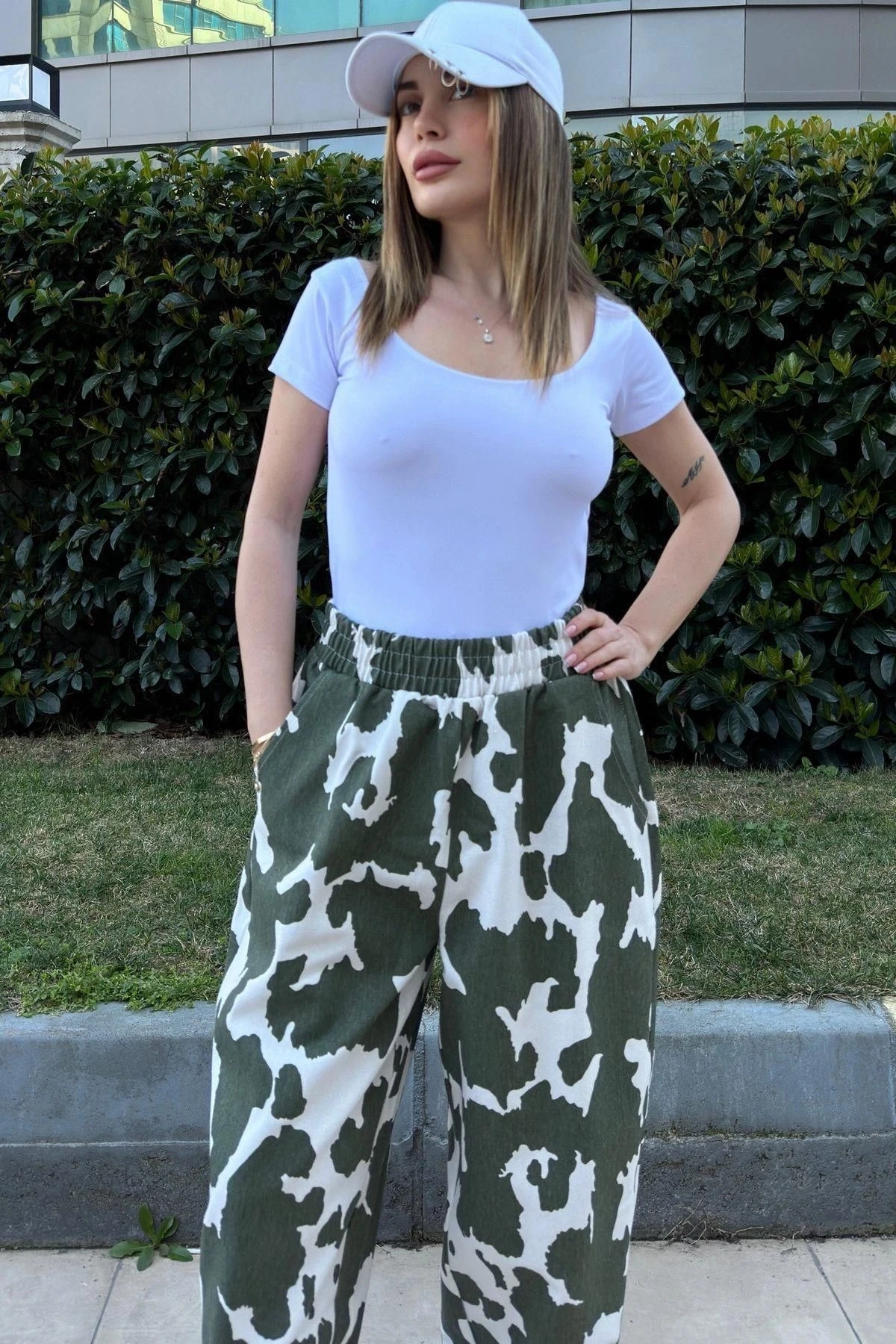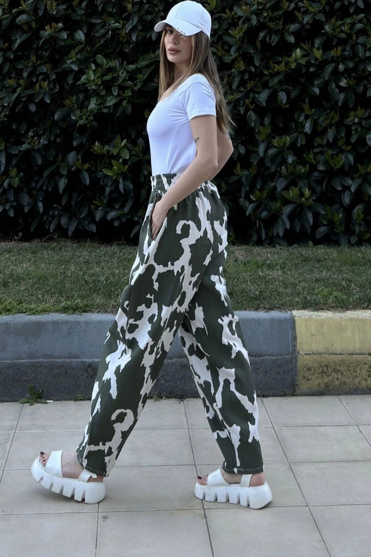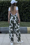 Kadın Yeşil Beli Lastikli, Cepli, Desenli Gabardin Kumaş, Salaş Pantolon