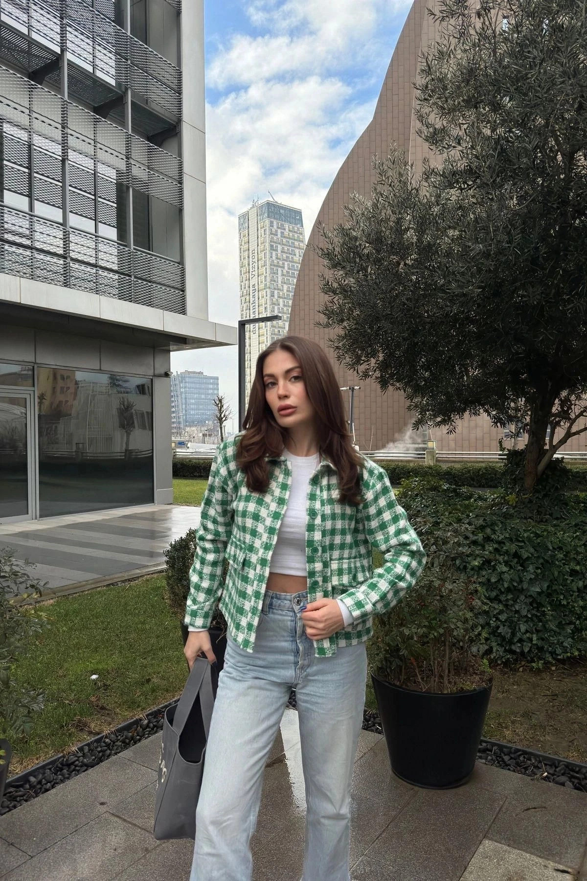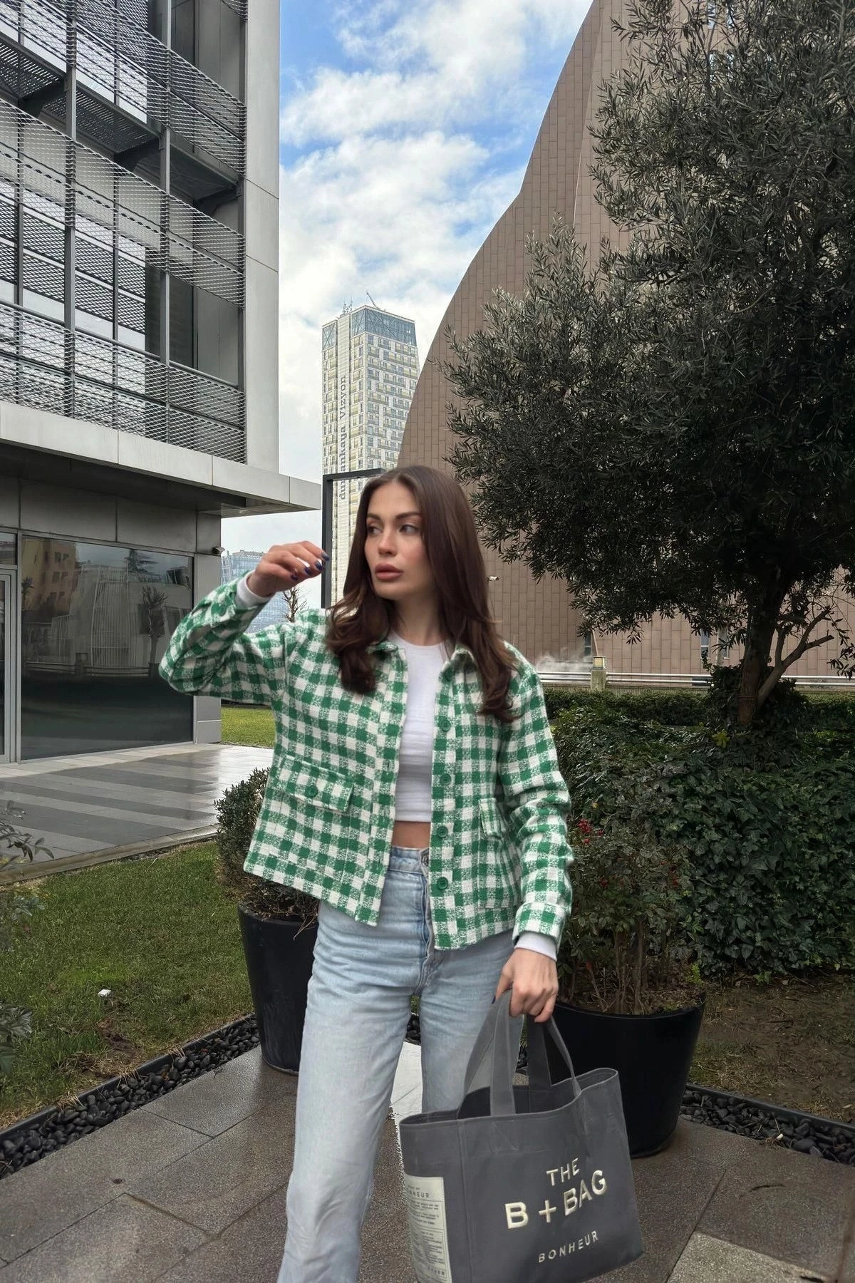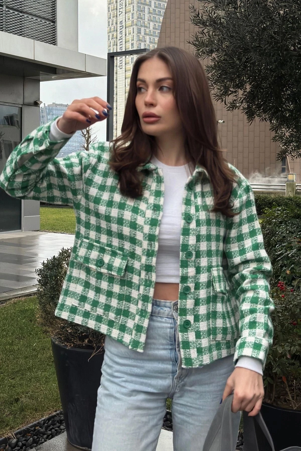 Kadın Yeşil Çift Cepli, Pötikare Desenli, Rahat Kalıp, Kısa Tüvit Ceket