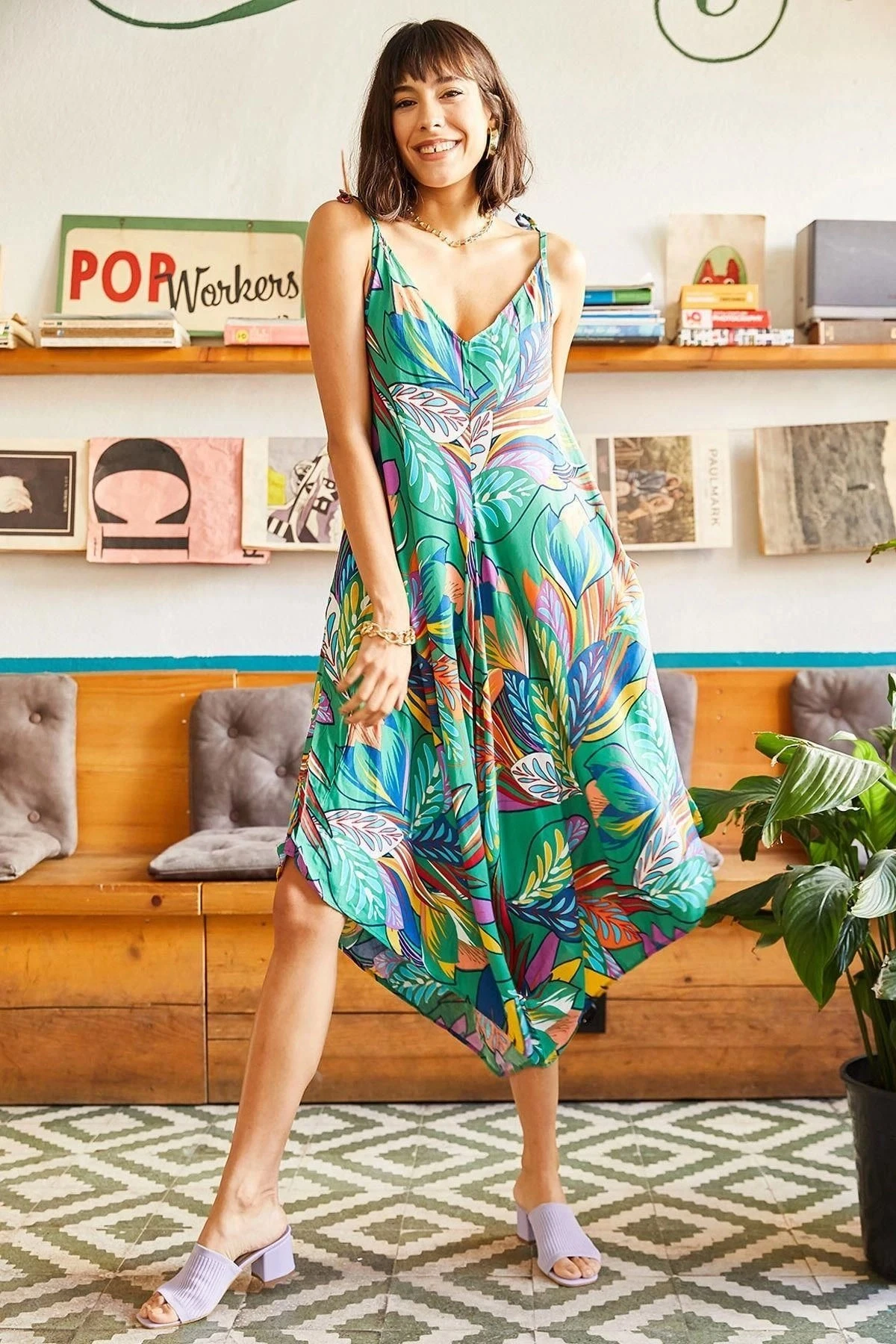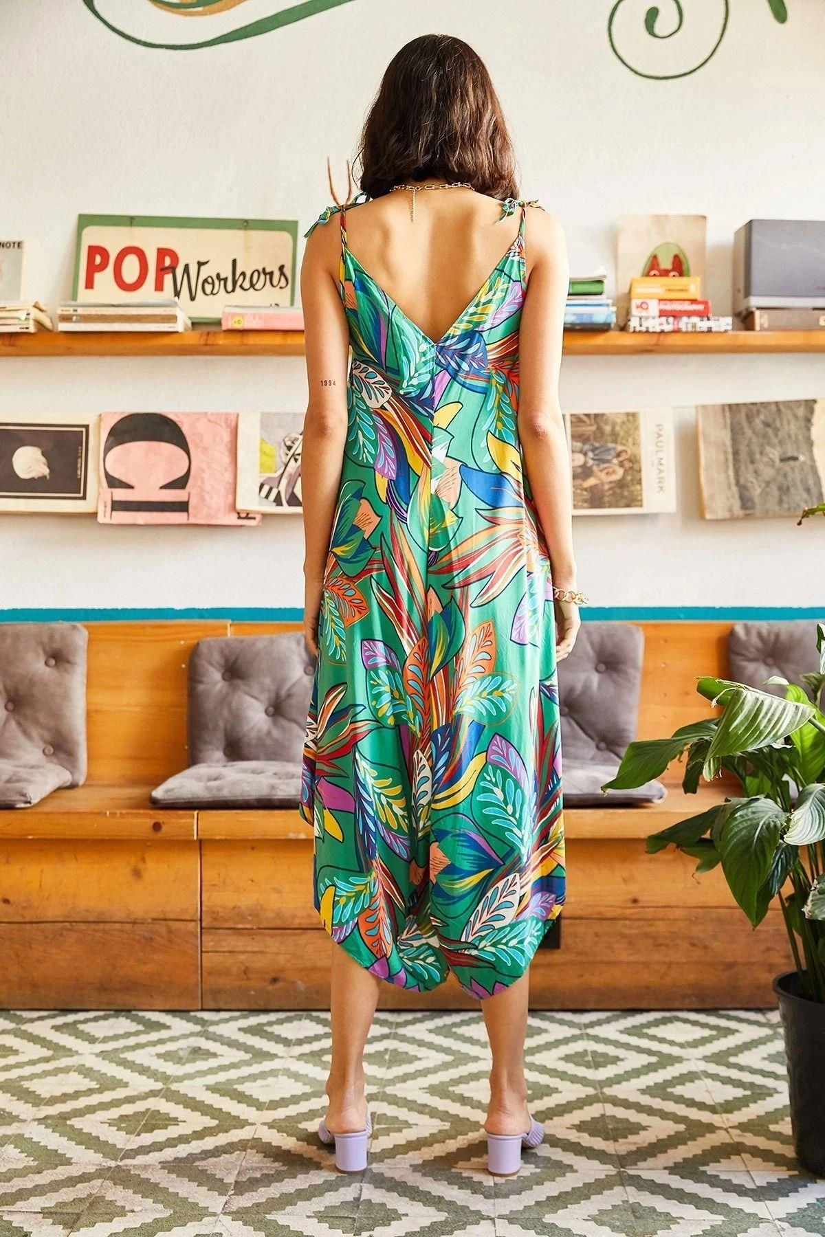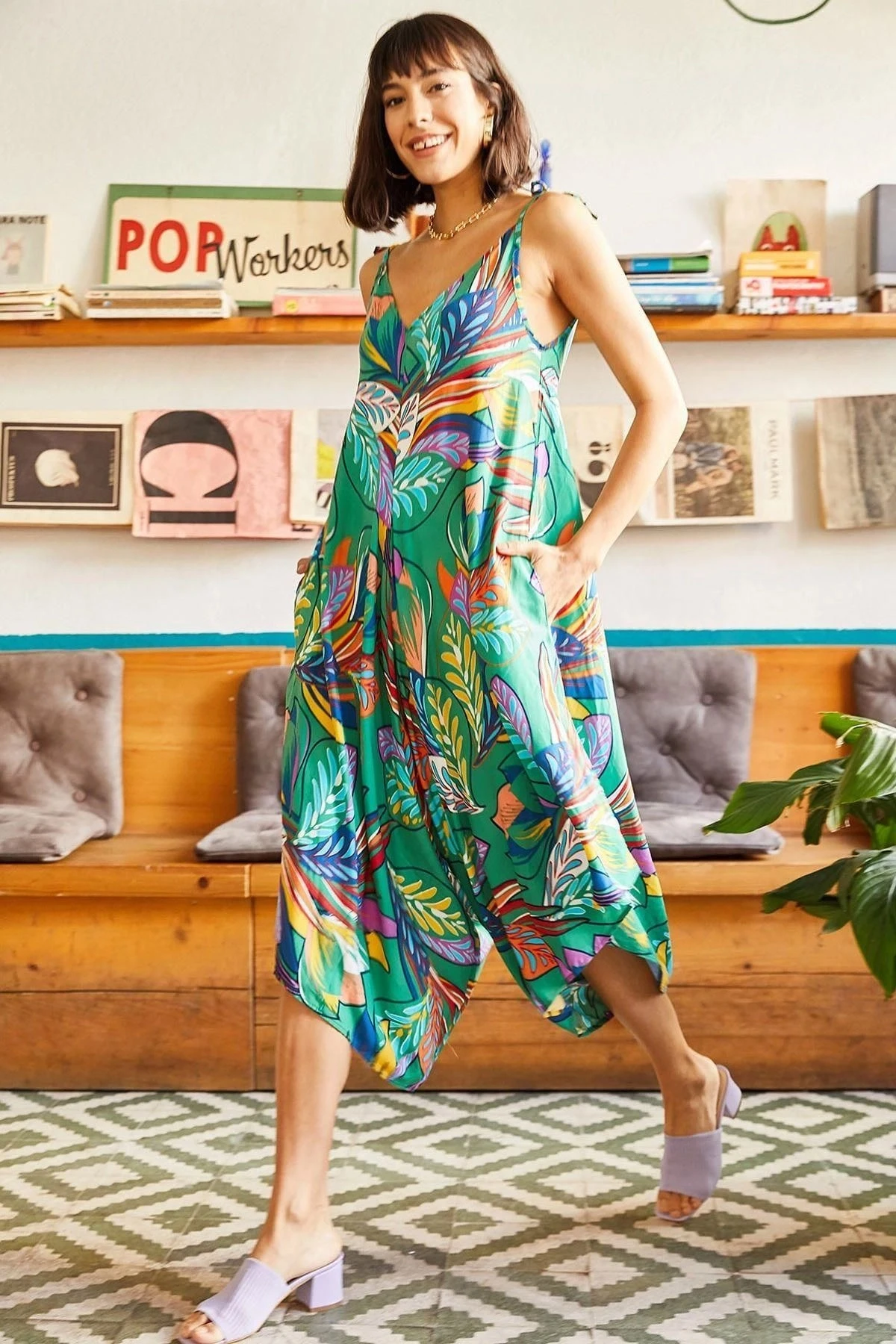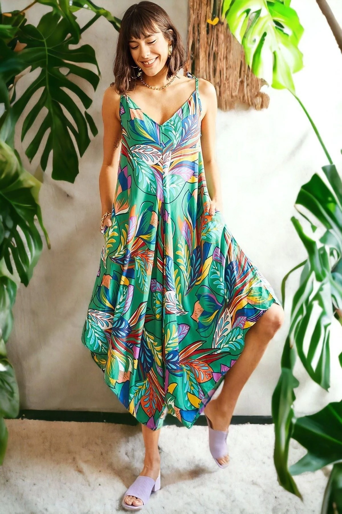 Kadın Yeşil Çok Renkli Kaliteli Kumaş Oversize Kesim Asimetrik Kol V Yaka Rahat Boy Tulum
