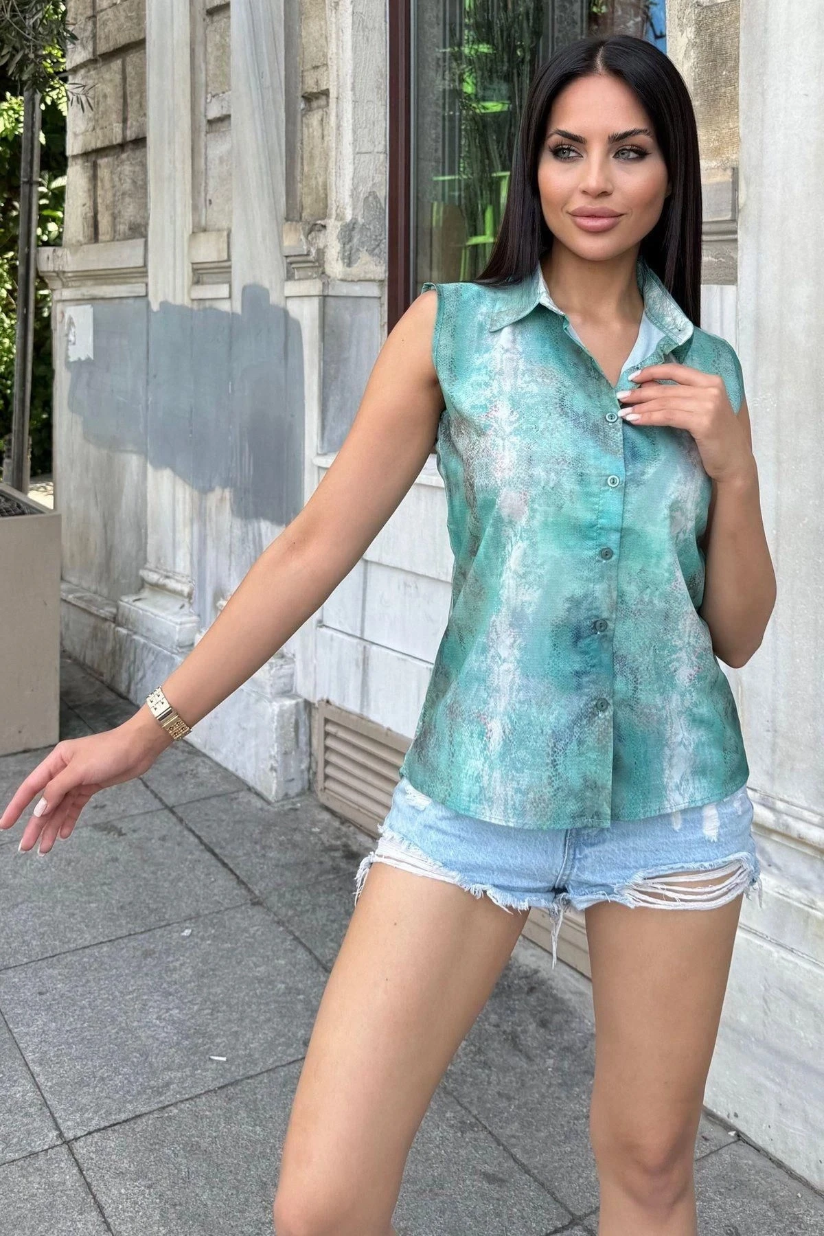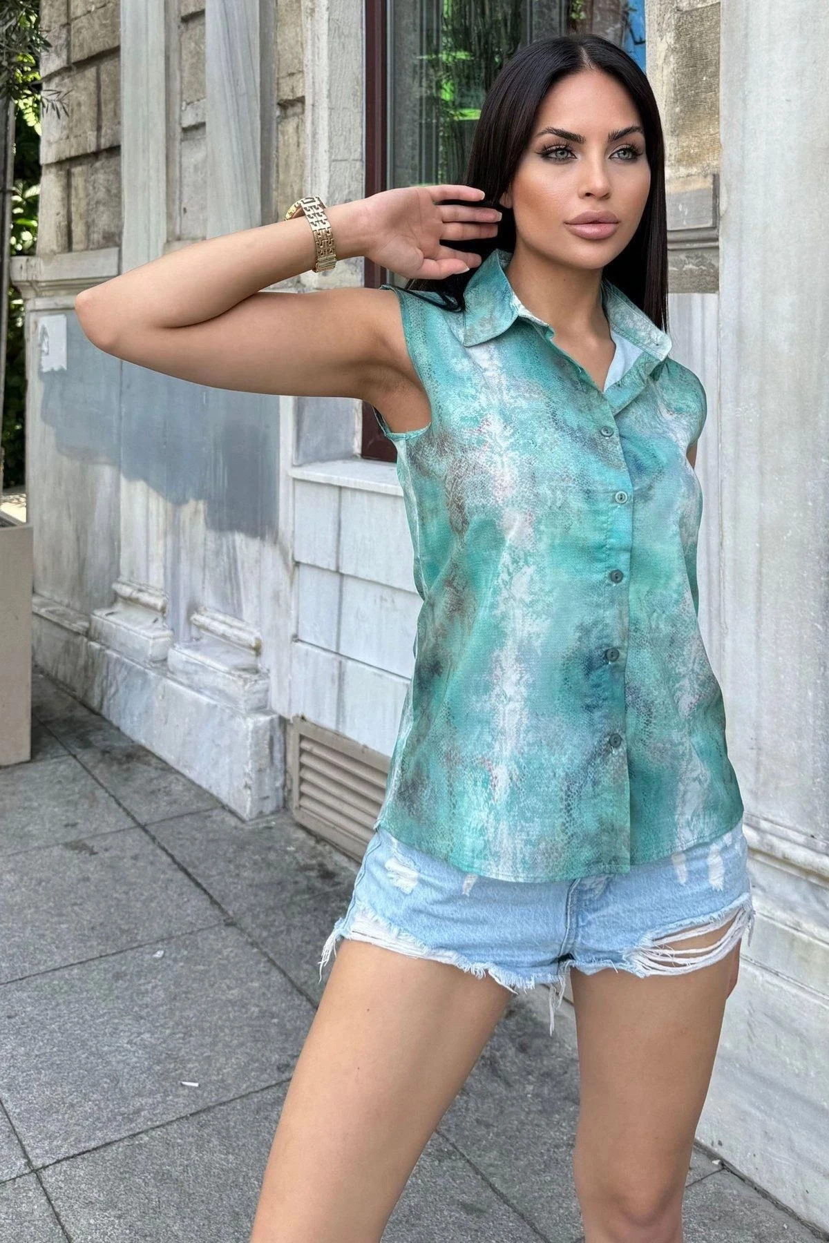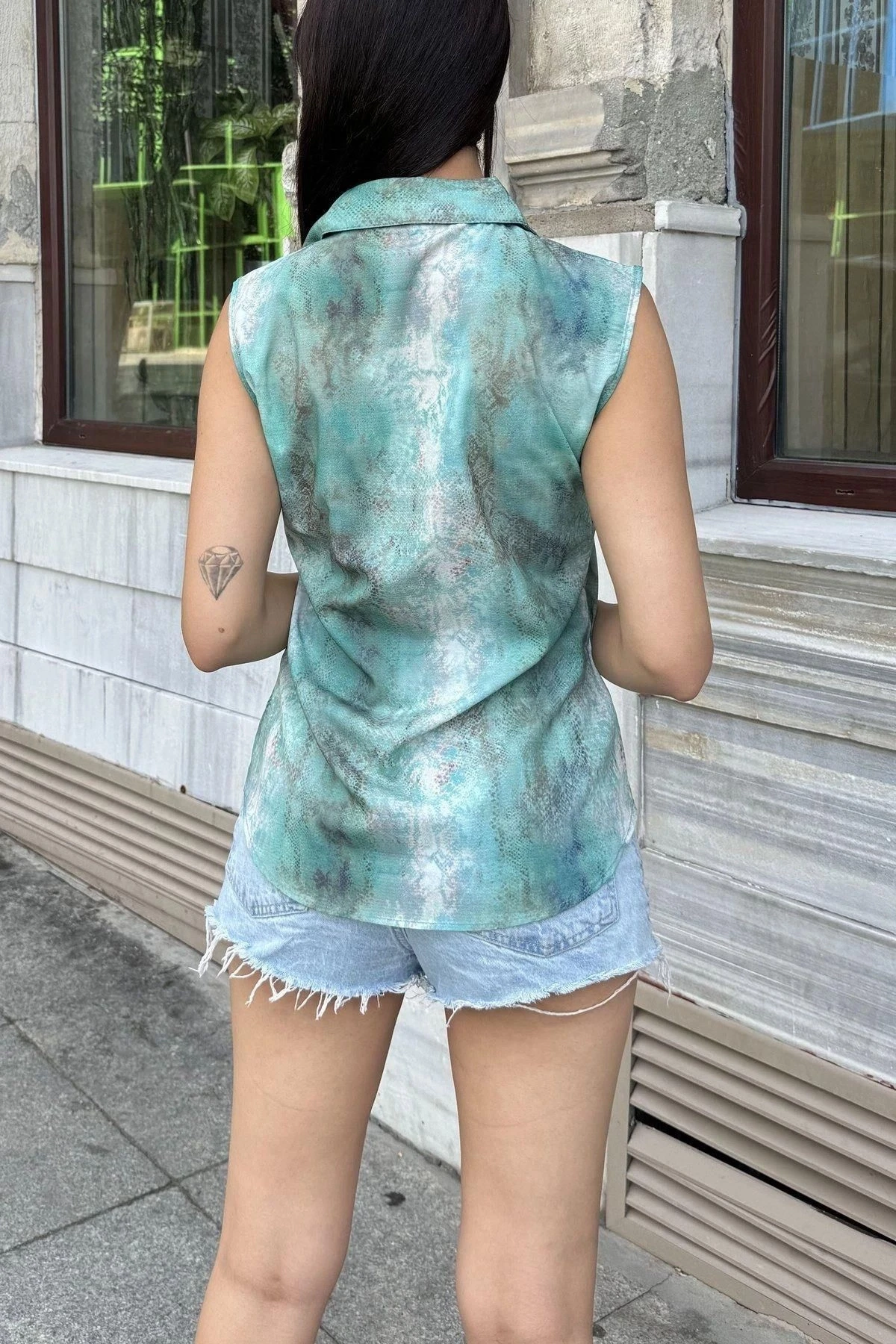 Kadın Yeşil Degrade Desenli, Krep Kumaş, Kolsuz Rahat Gömlek
