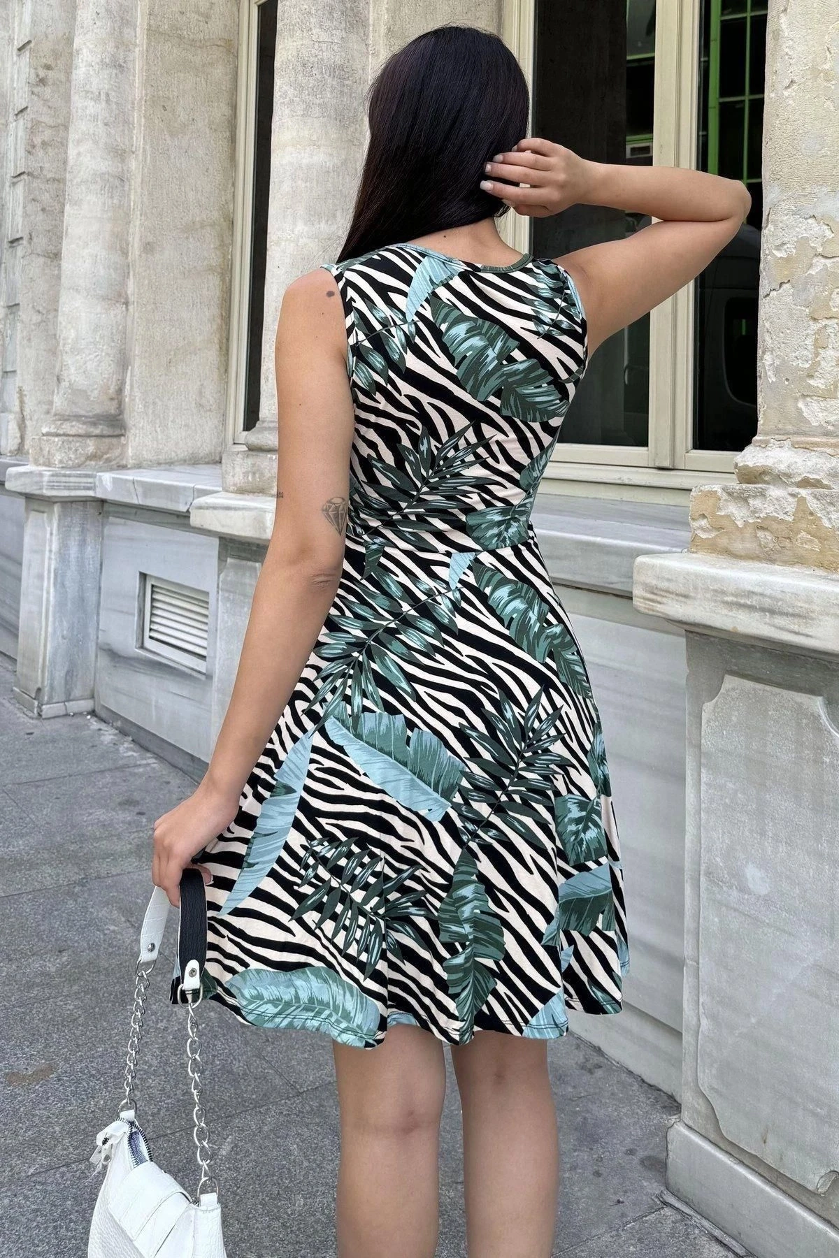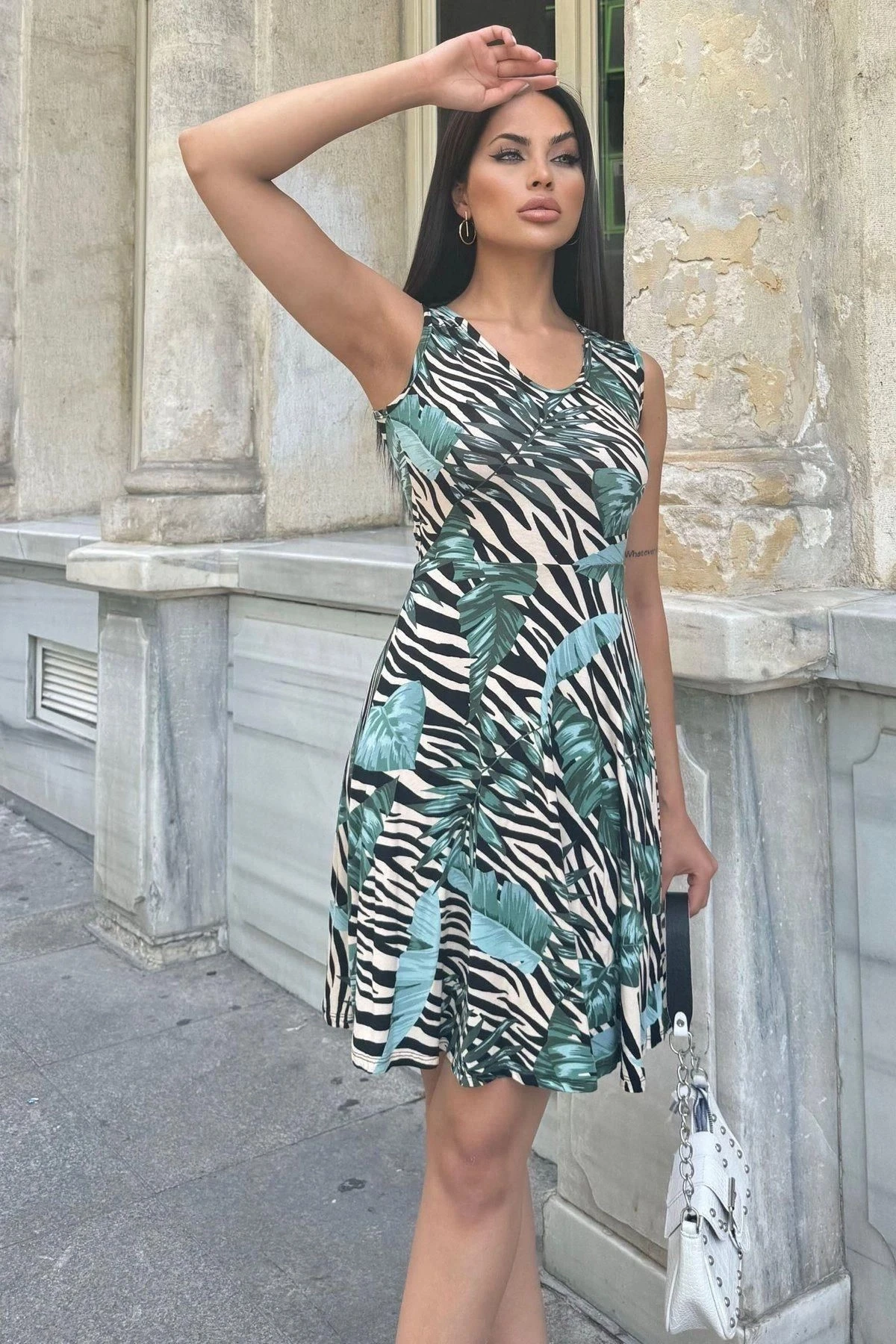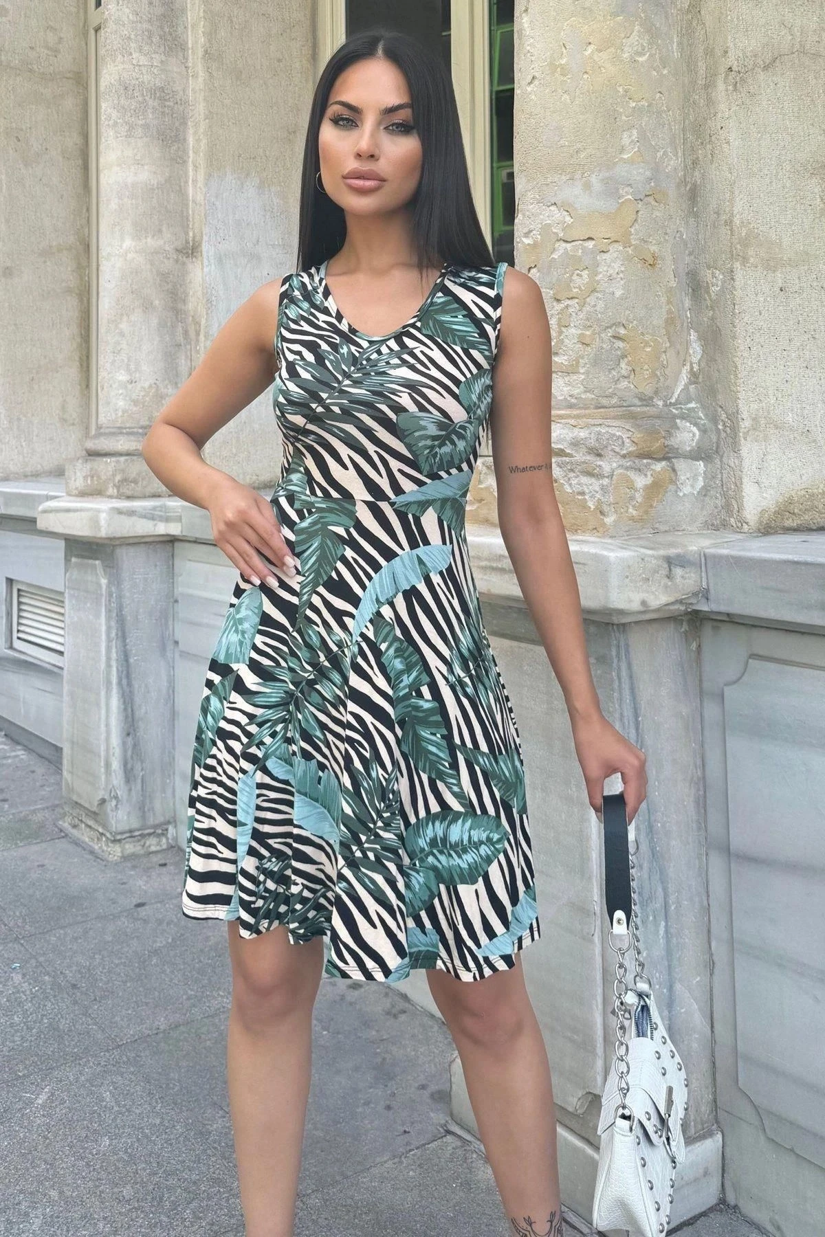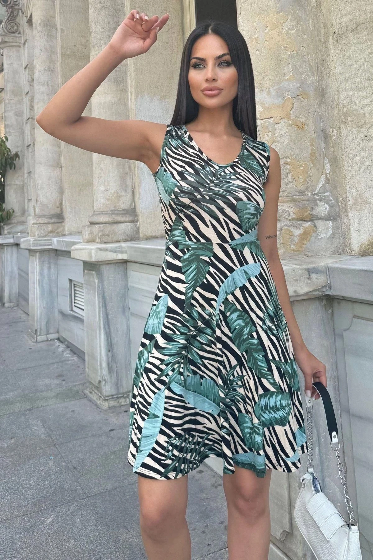 Kadın Yeşil Desenli, Kolsuz, V Yaka, Kolsuz, Midi Kloş Elbise
