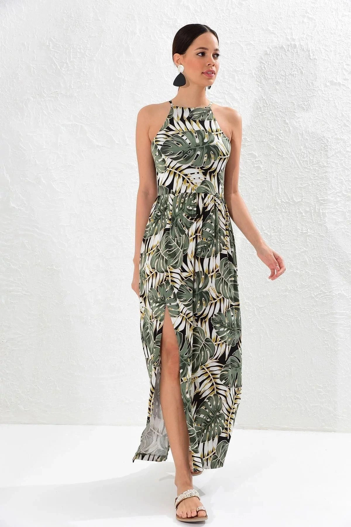 Kadın Yeşil Desenli Sıfır Kol Yırtmaç Detaylı Maksi Boy, Uzun Rahat Ve Günlük Elbise - Halter Yaka