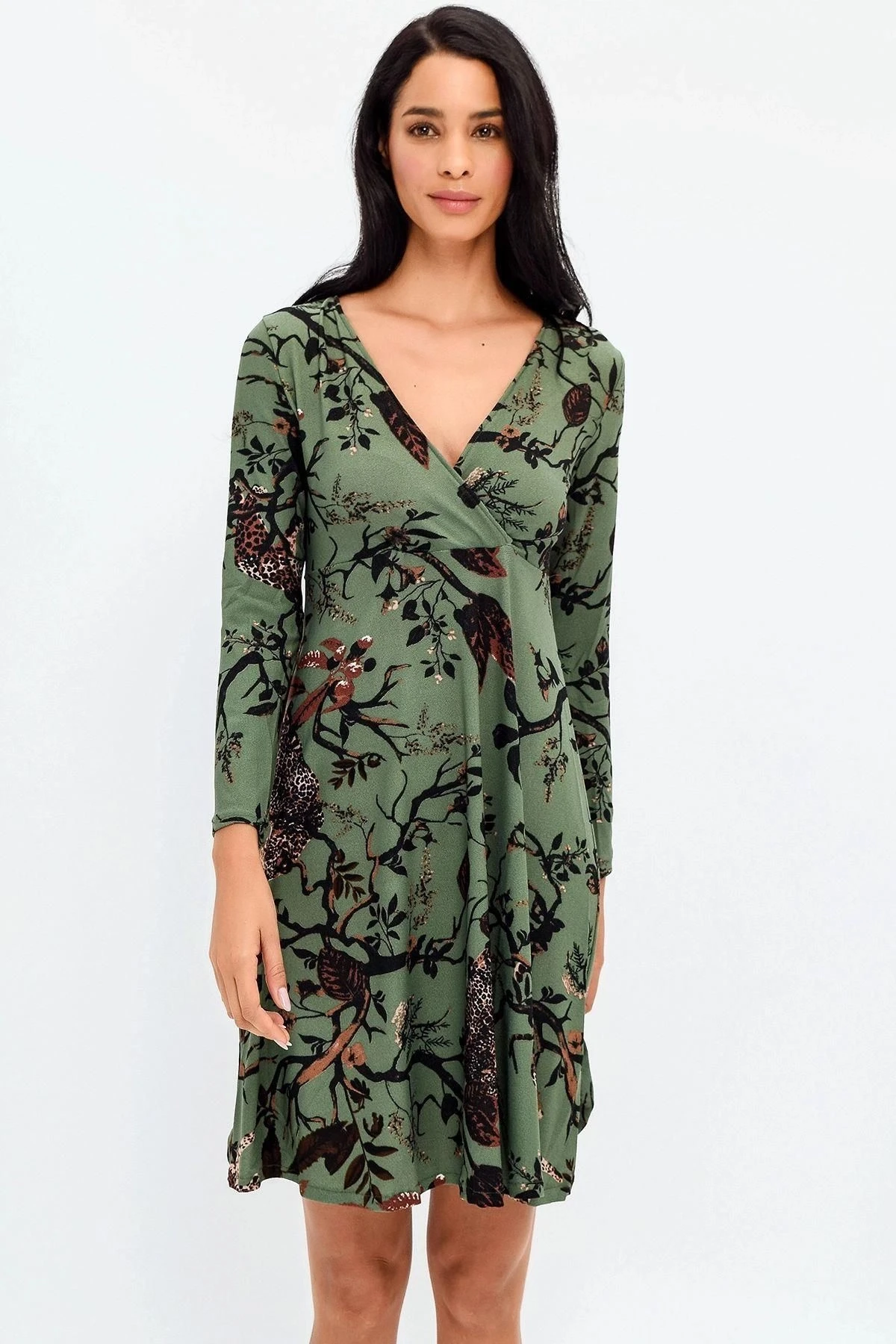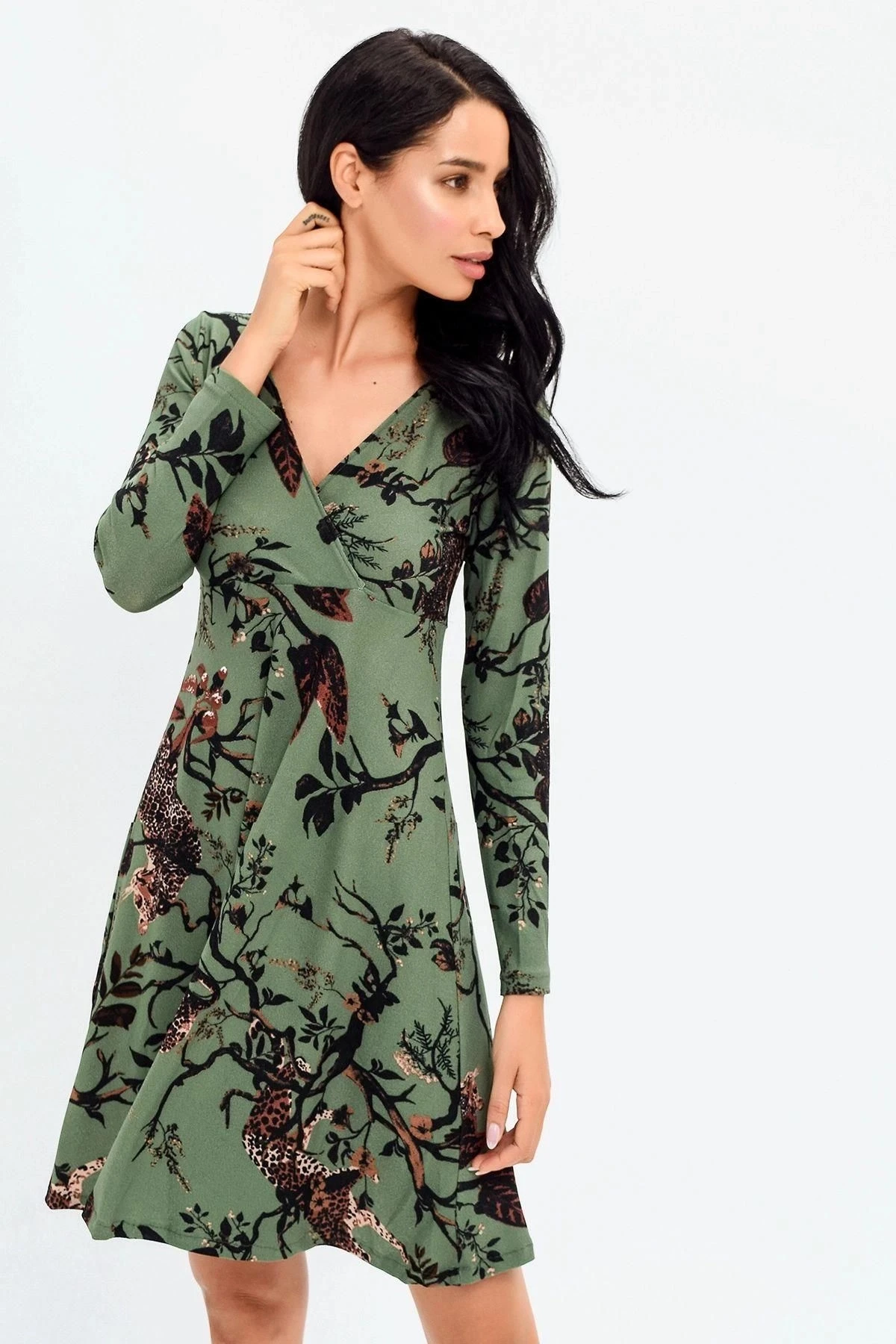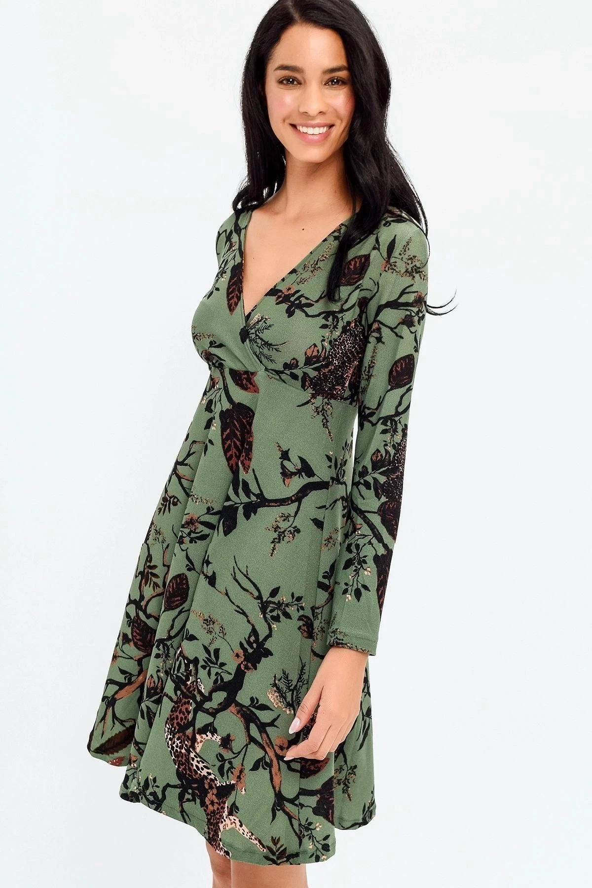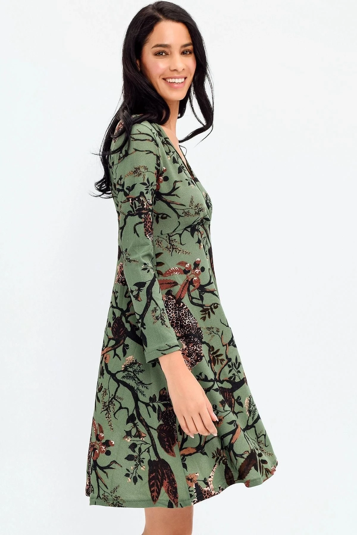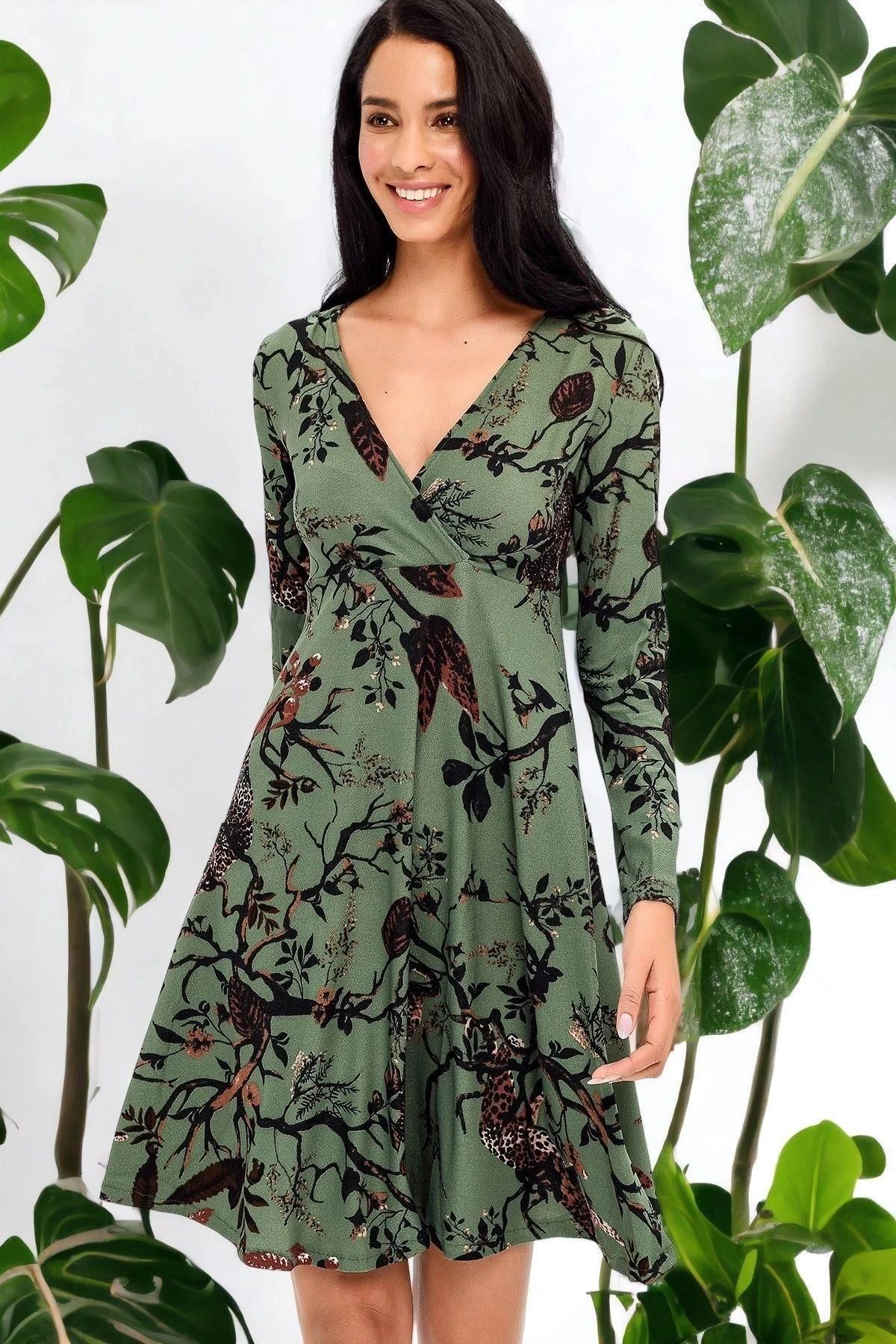 Kadın Yeşil Desenli Truvakar Kol Kloş Midi Boy, Diz üstü Ofis ve Günlük Model Elbise