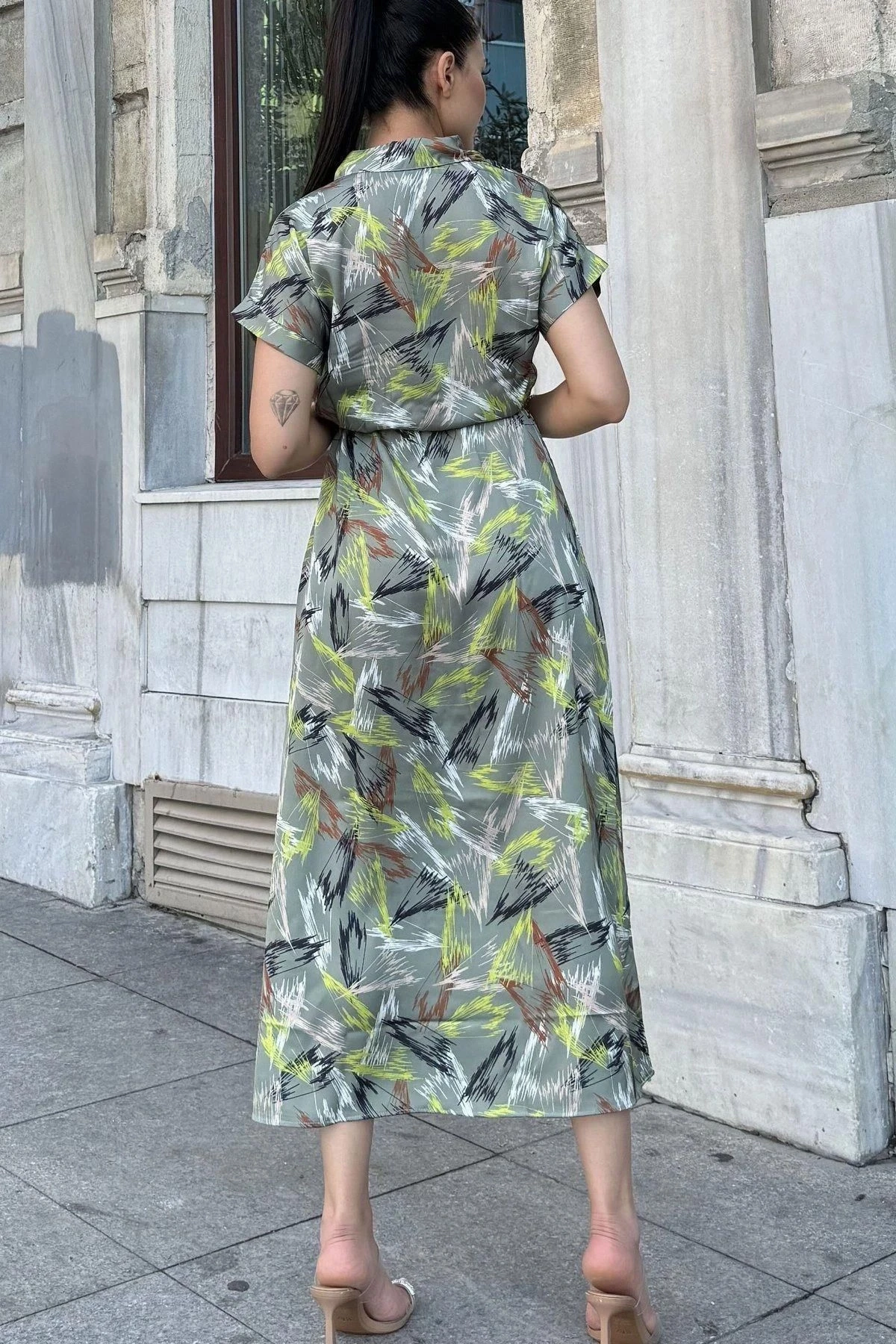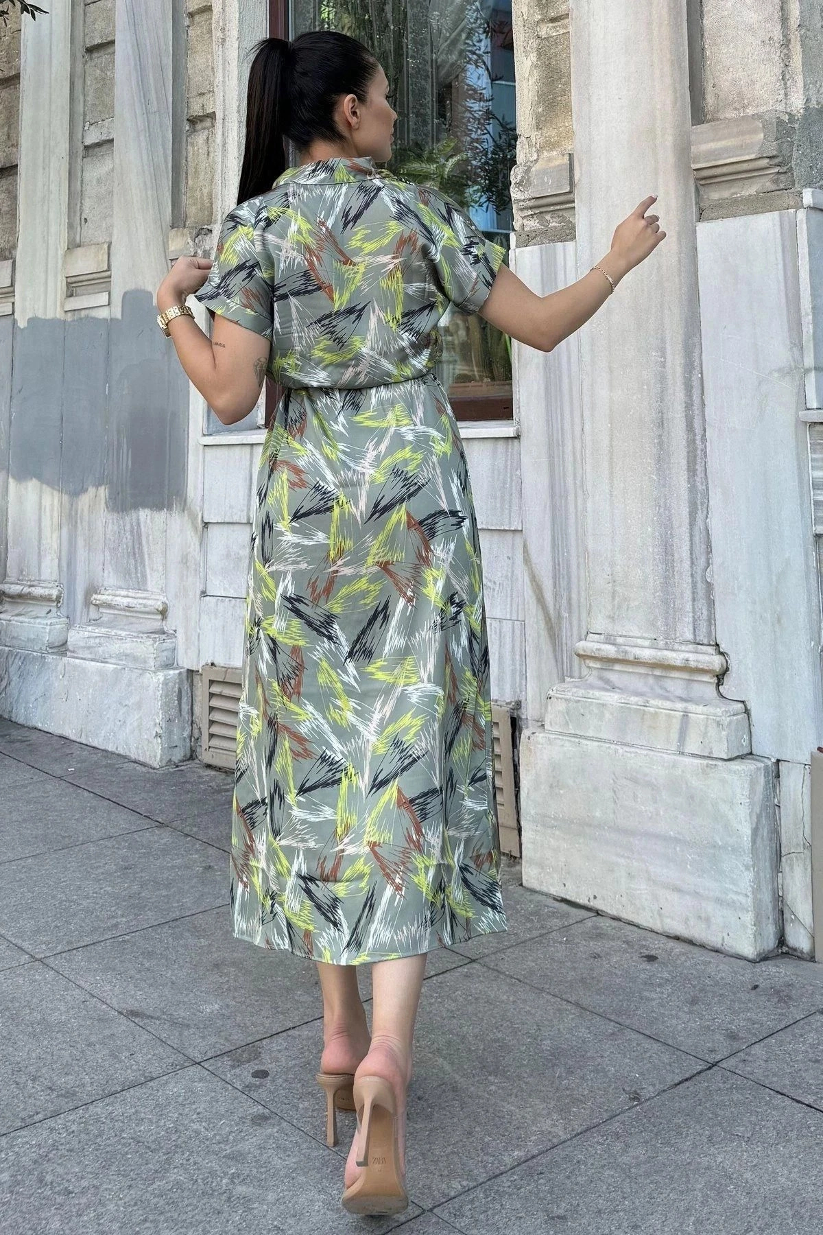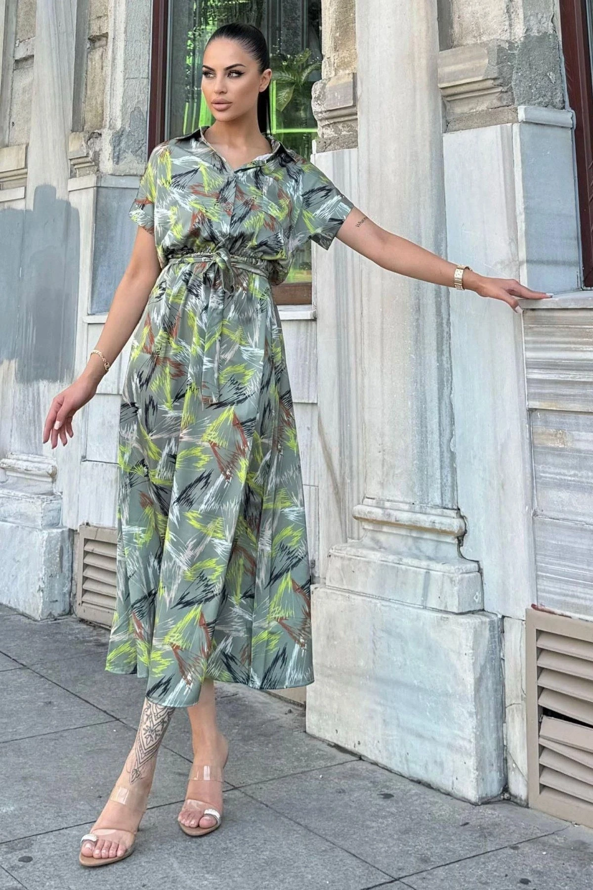 Kadın Yeşil Desenli, Yarım Kol Ve Yarım Patlı Gömlek Yaka, Beli Lastikli, Salaş Uzun Saten Elbise