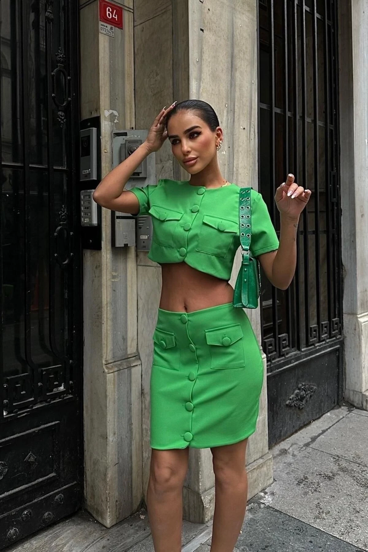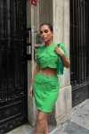 Kadın Yeşil Dokuma Kısa Kol Bisiklet Yaka Crop Takım