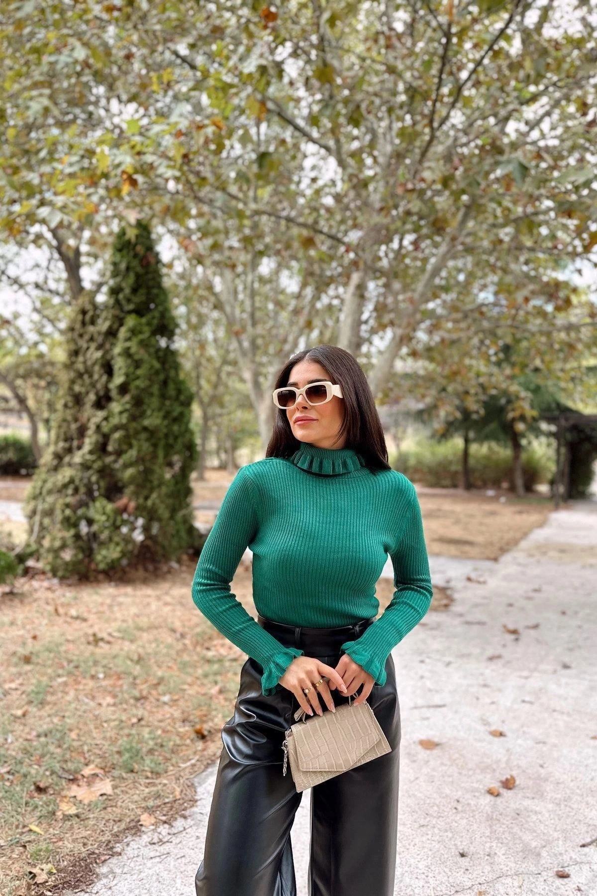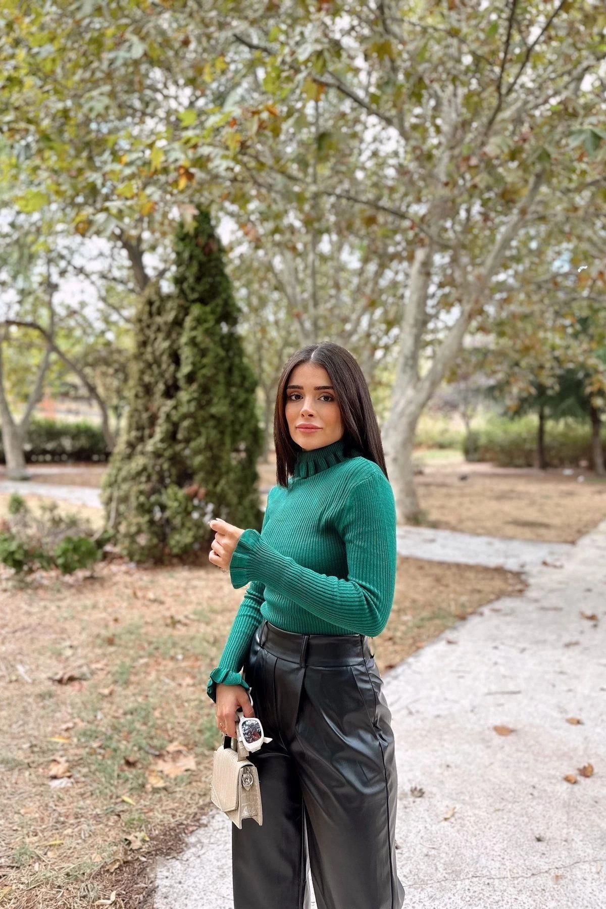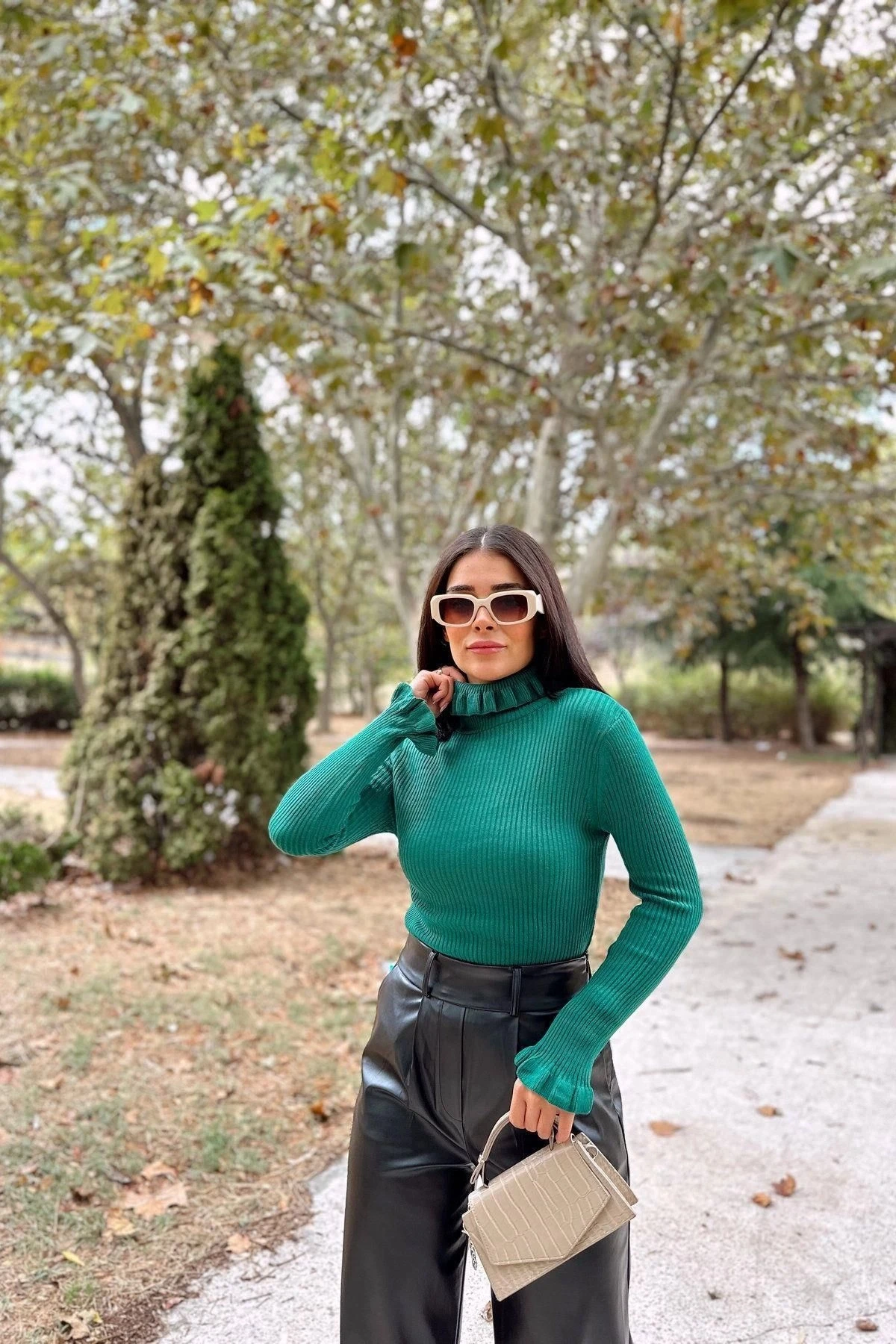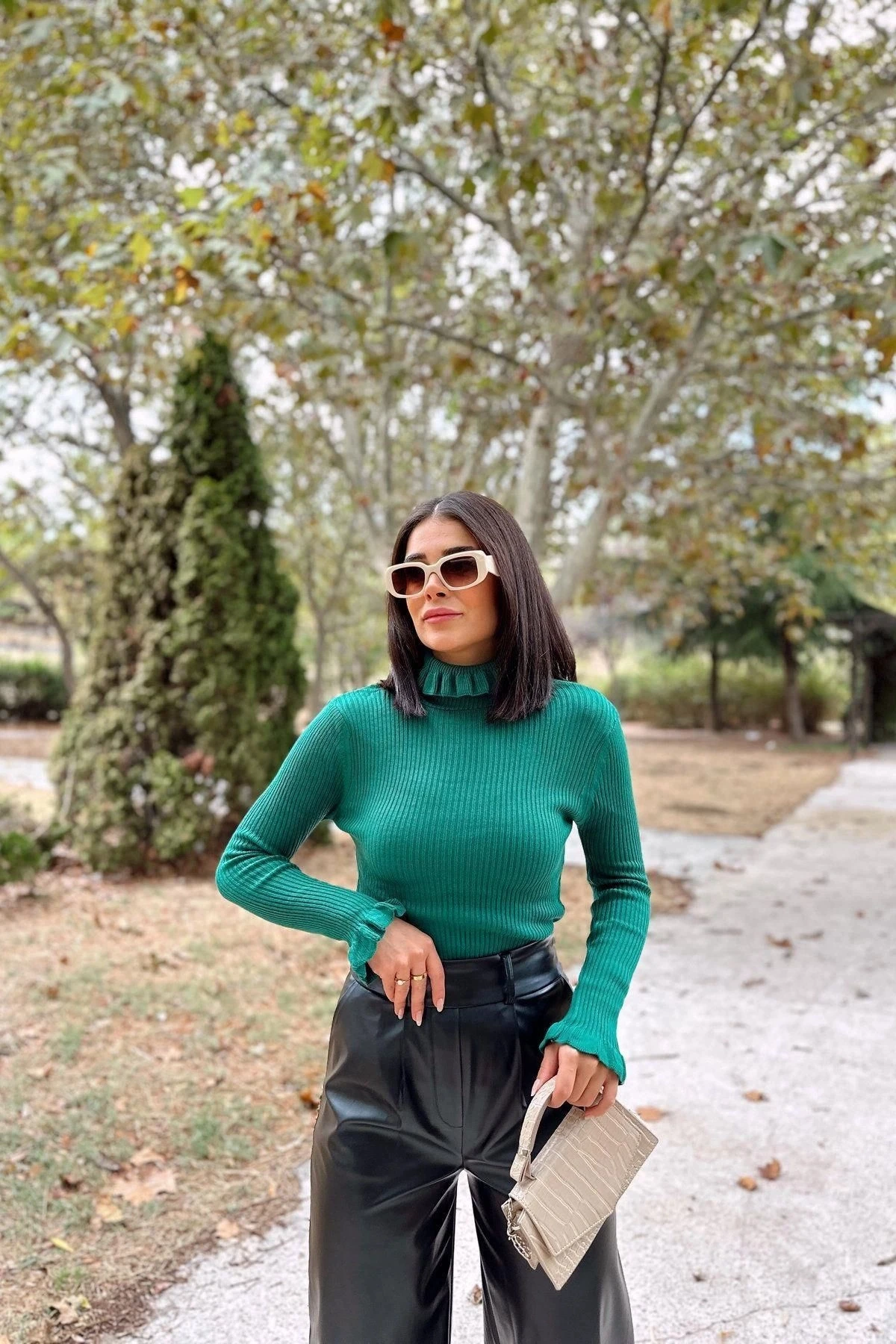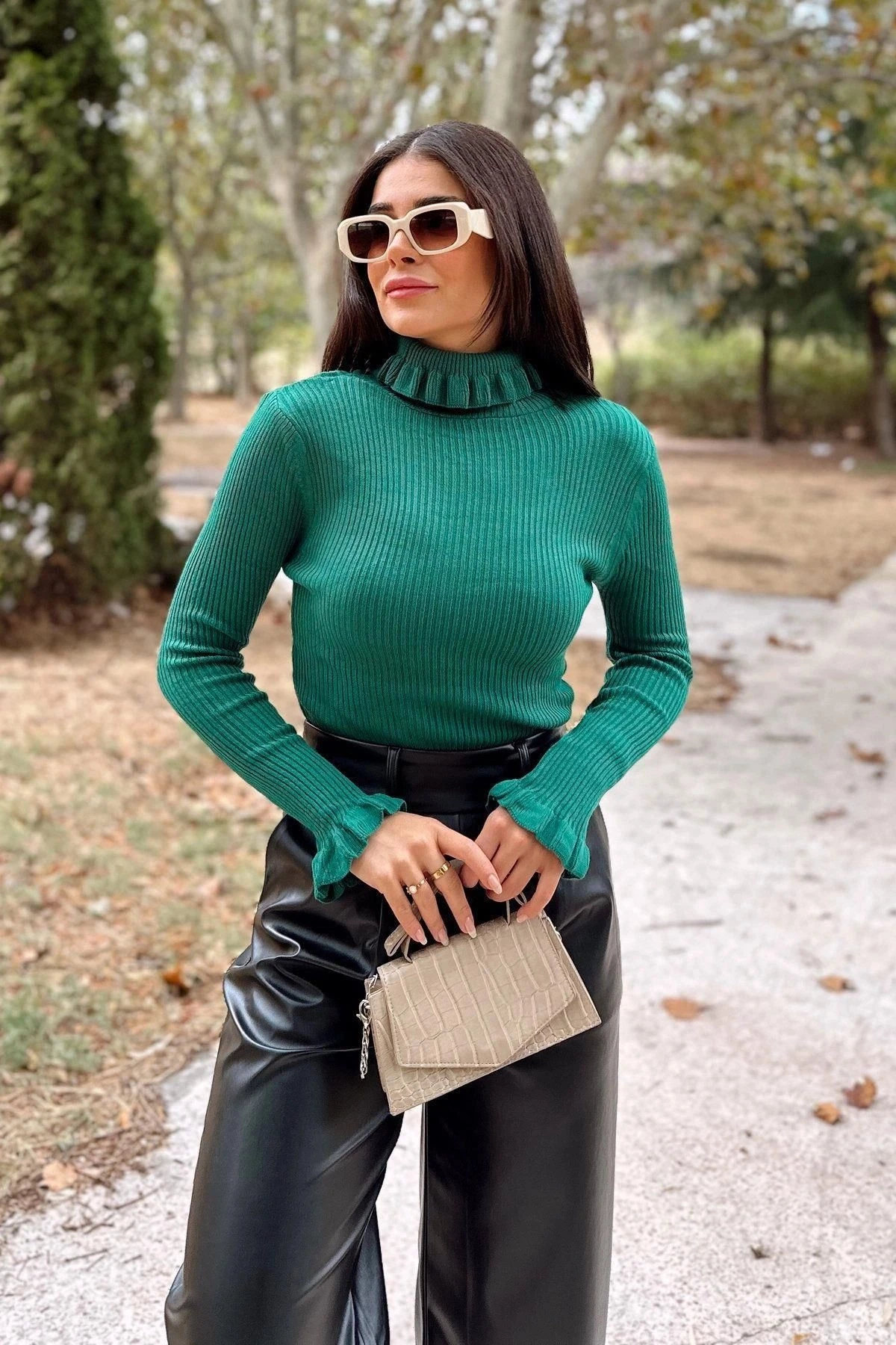 Kadın Yeşil Fırfırlı Boğazlı Yaka, Uzun Kol, Vucüda Oturan Esnek Kumaş, Düz Desen, Triko Bluz