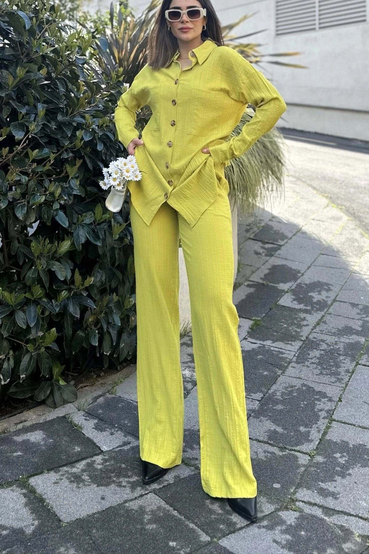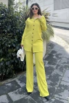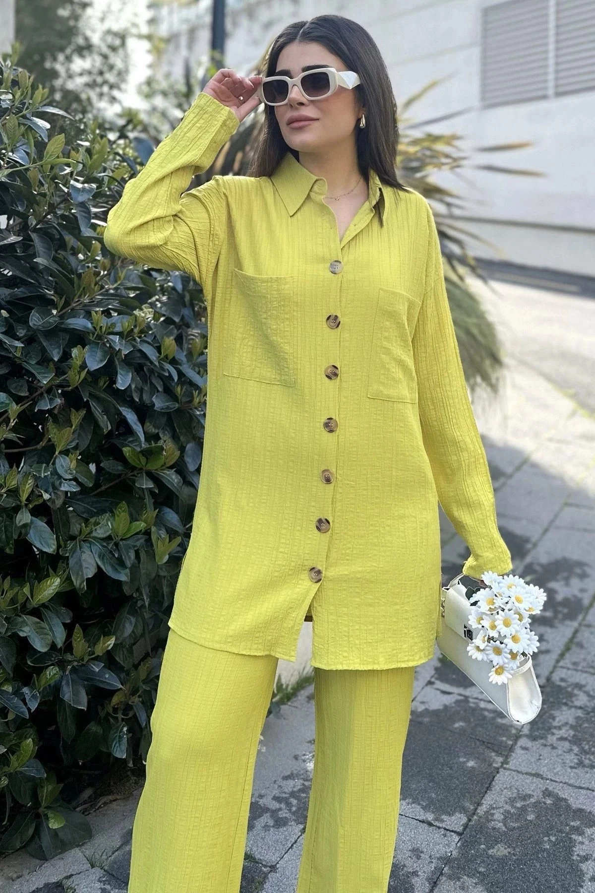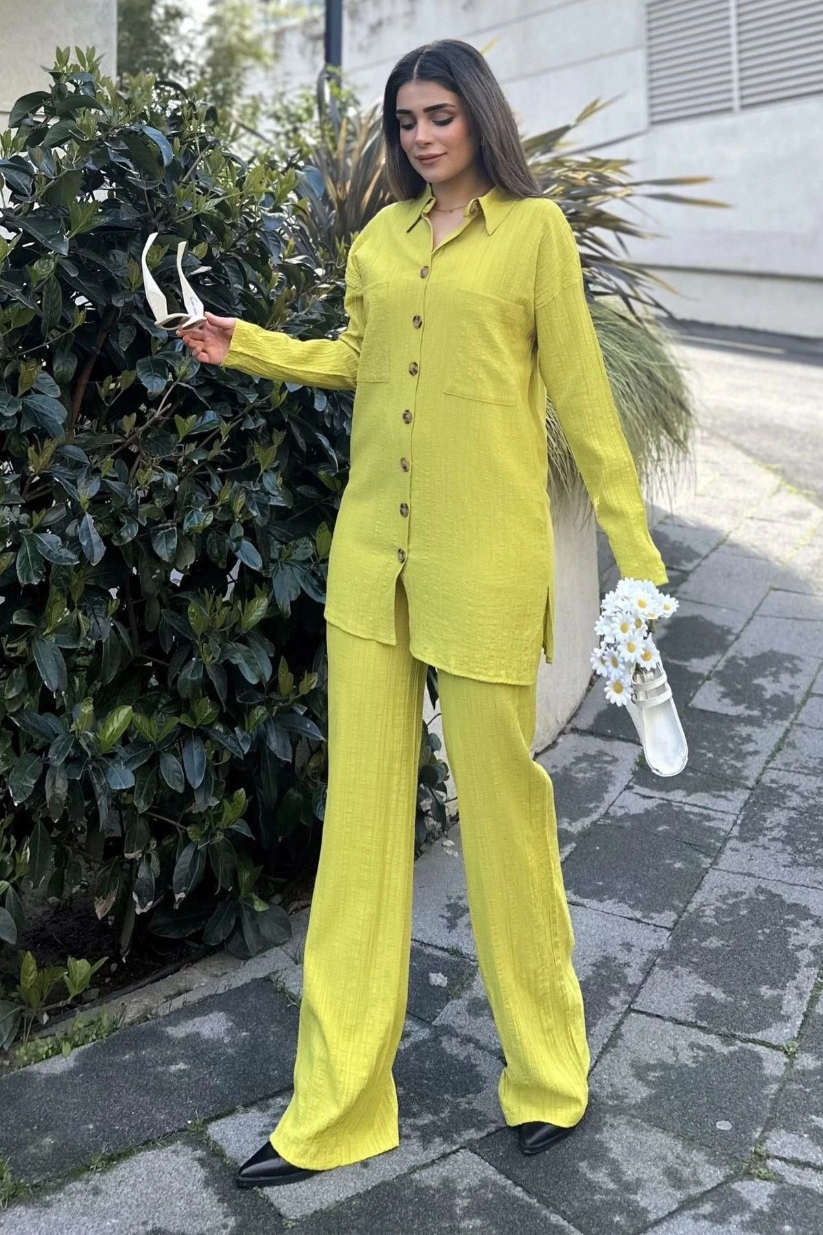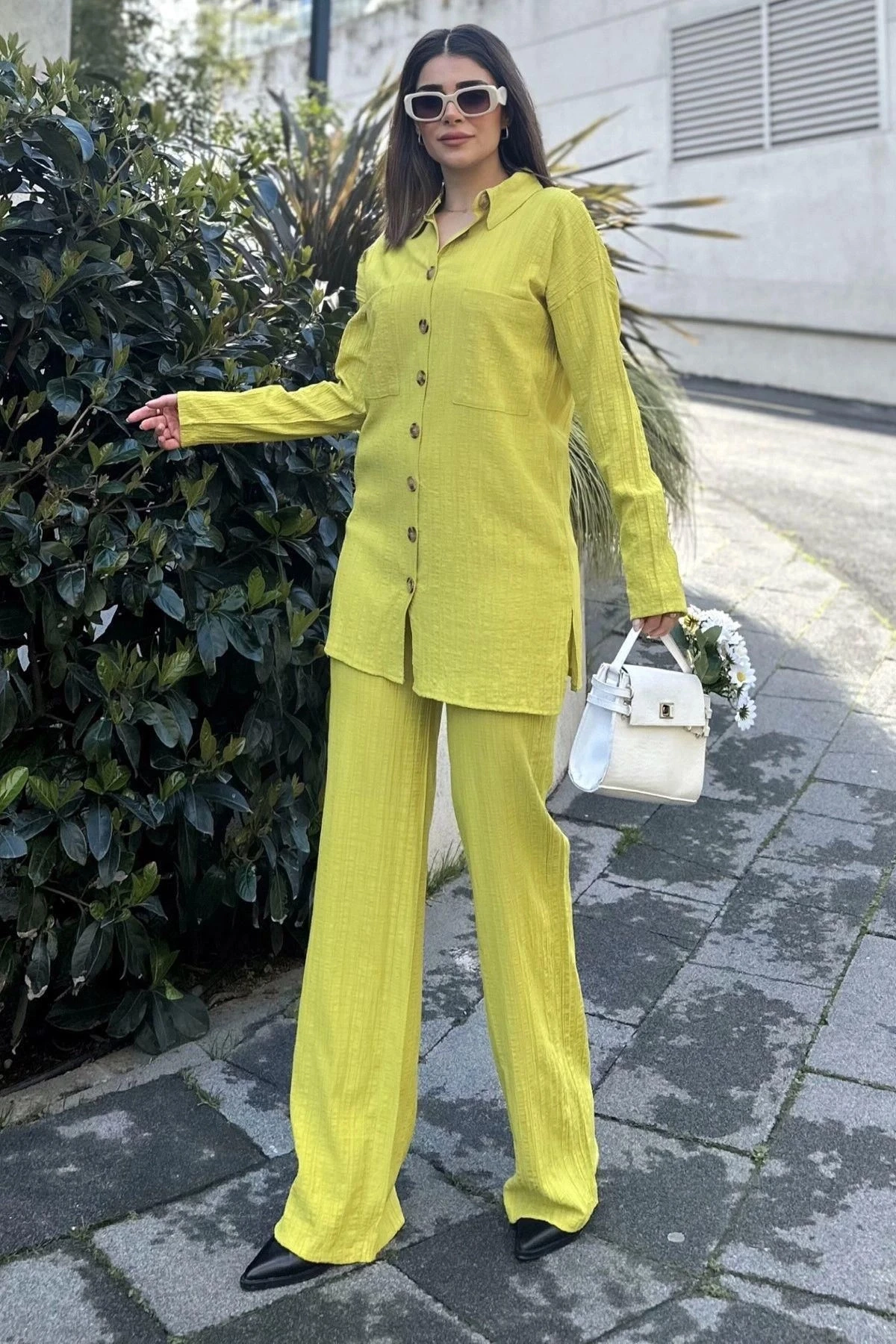 Kadın yeşil Gofre Kumaş, Çift Cepli Gömlek & Bol Paça Pantolon - Salaş Alt & Üst Takım