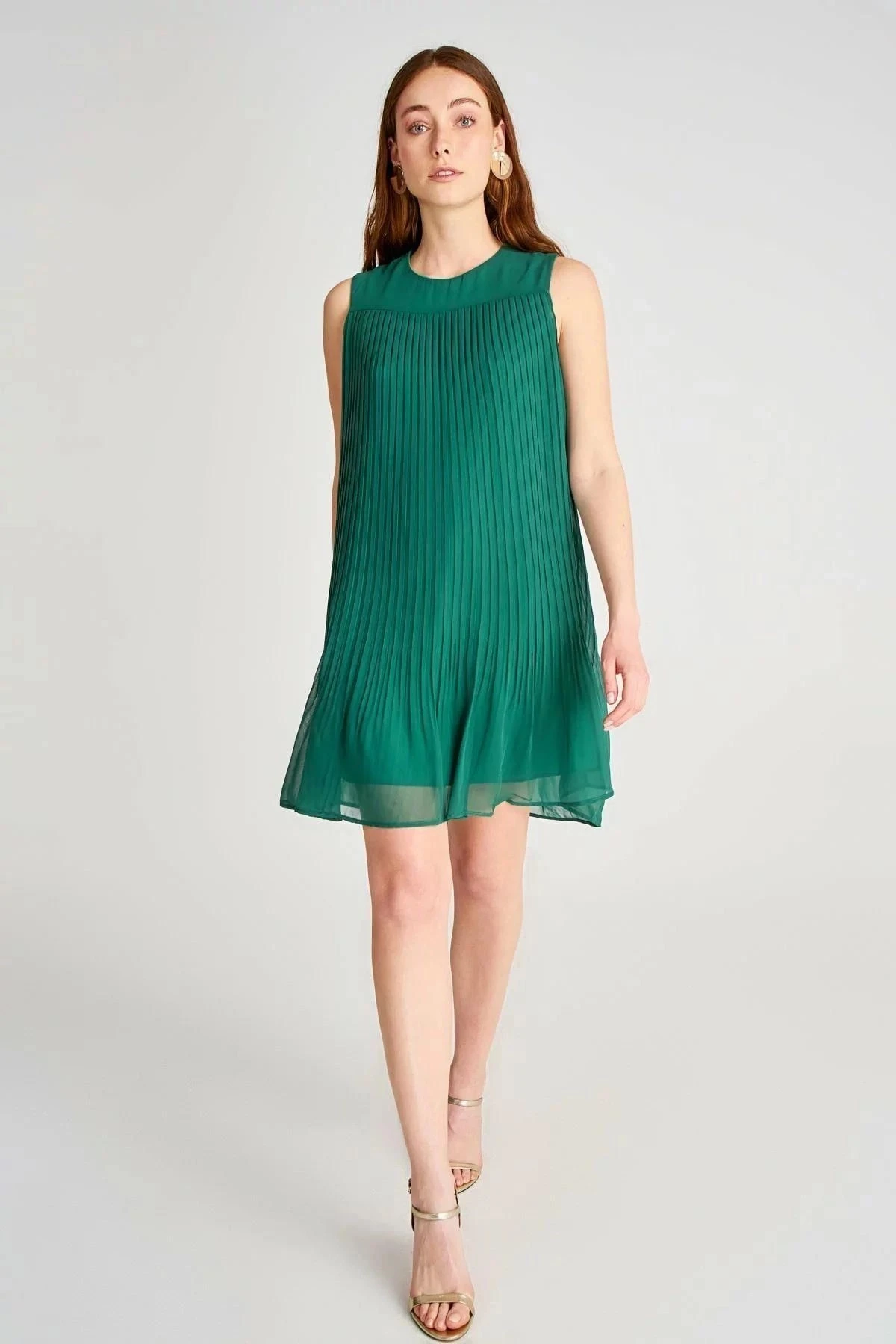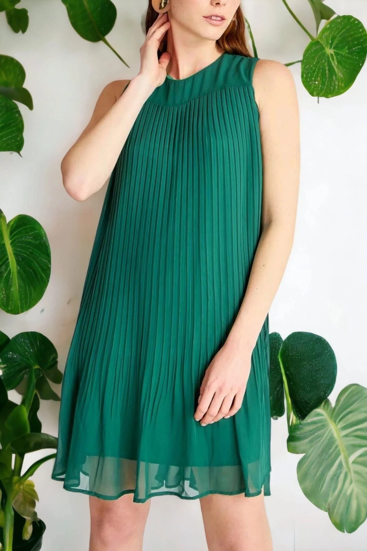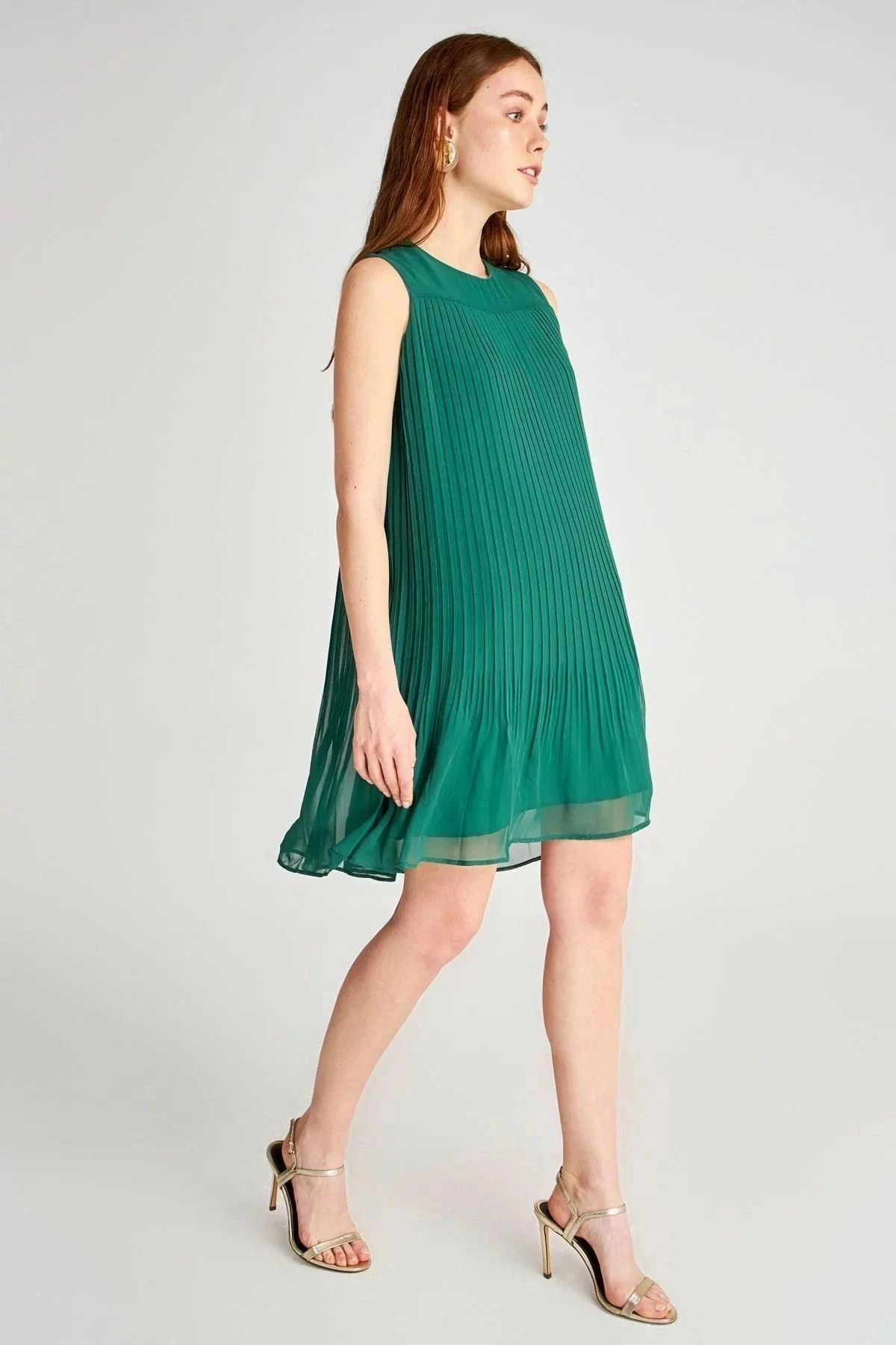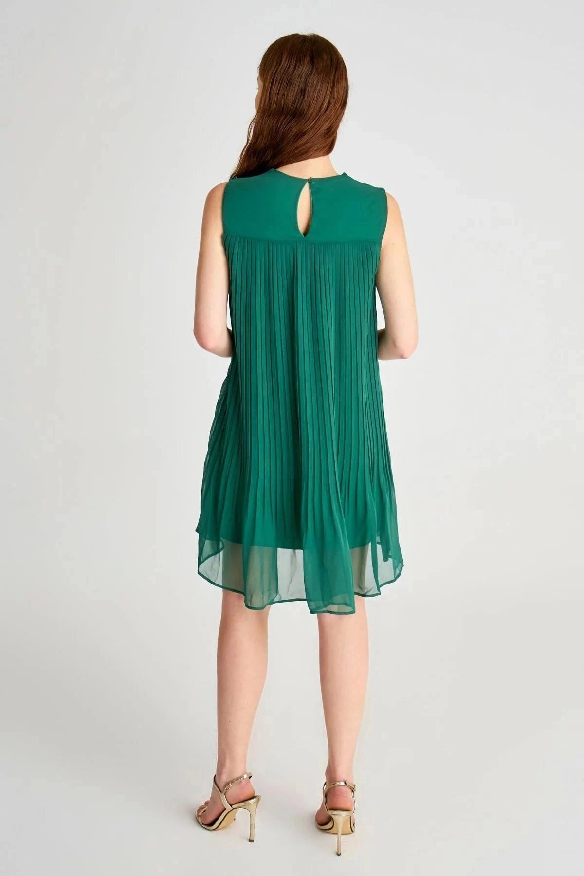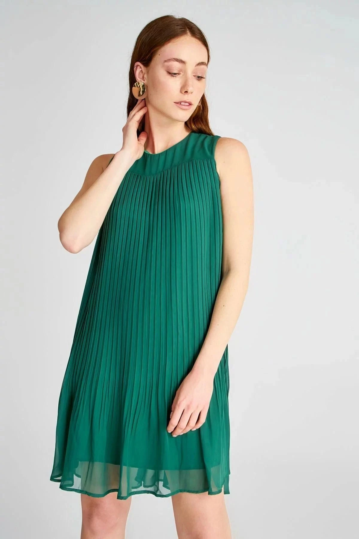 Kadın Yeşil Günlük Stil Sıfır Kol Pliseli Oversize Kesim Mini Kısa Elbise