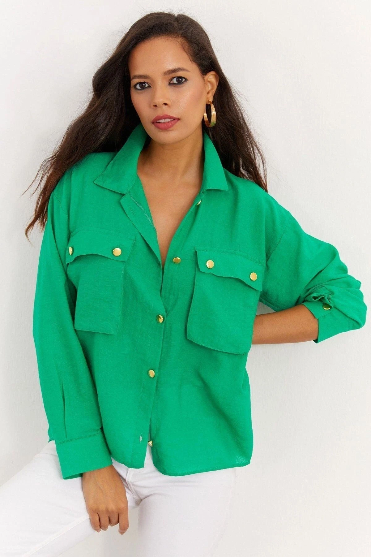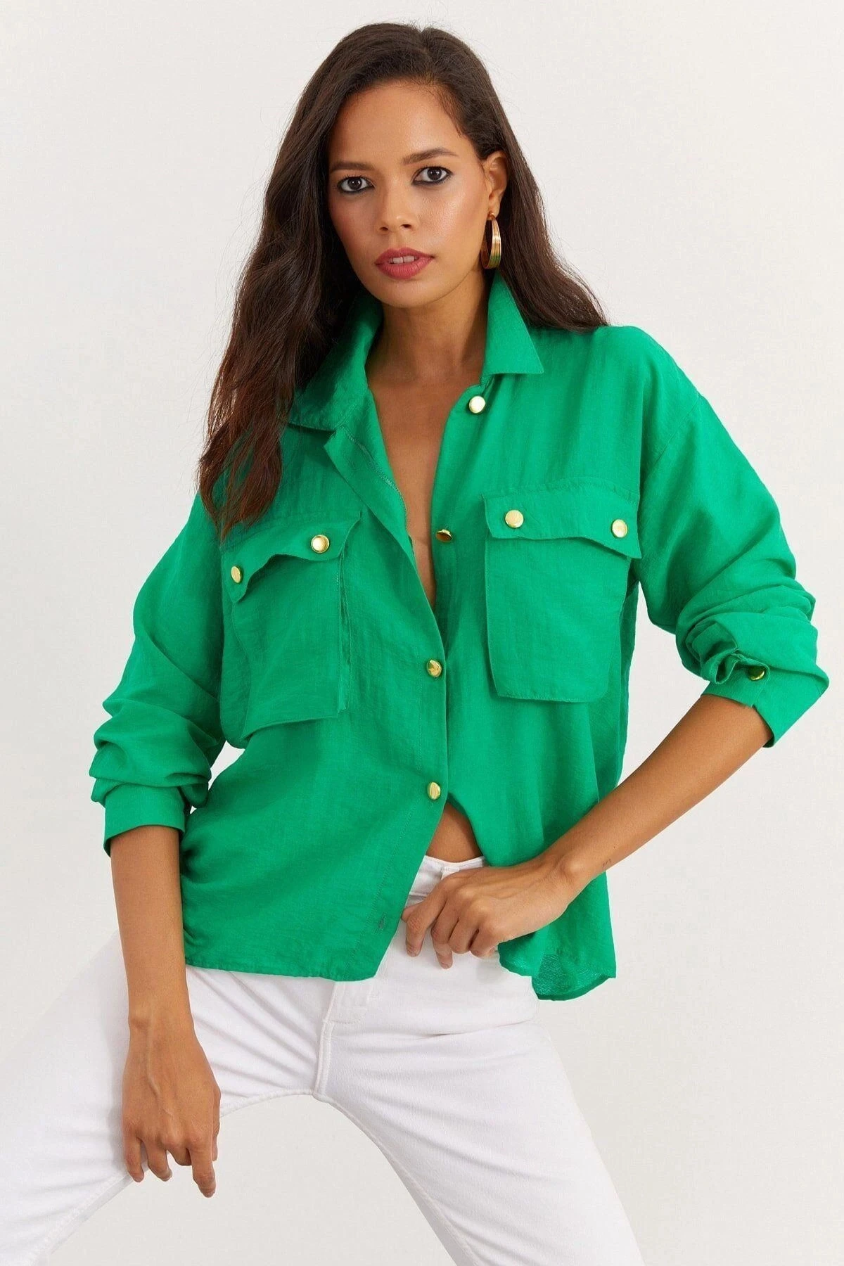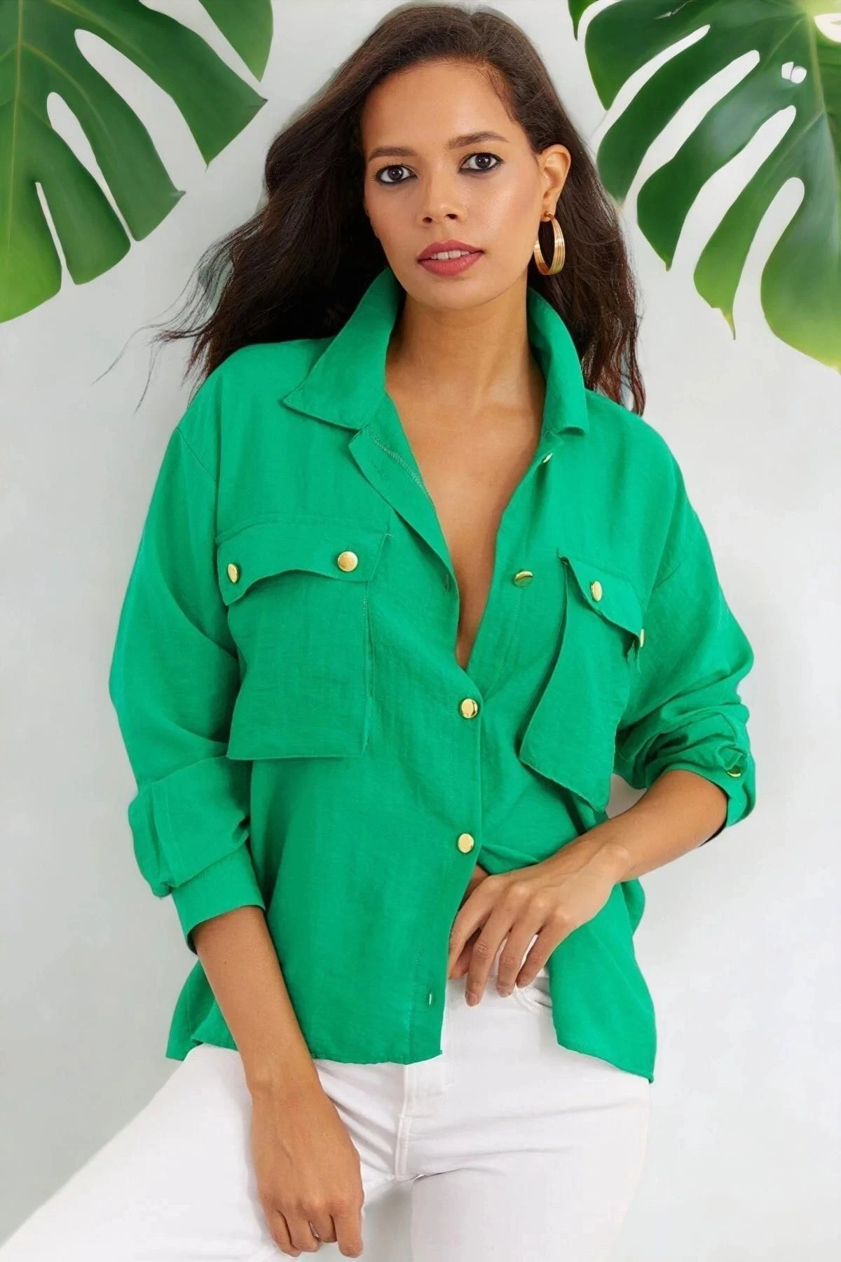 Bu şık yeşil renkli gömlek, klasik bir tarzı modern detaylarla birleştiriyor.; Uzun kollu ve klasik yaka tasarımıyla geleneksel bir görünüm sunarken, cep detayları da şıklığını tamamlıyor.; Regular kesim ve standart boyuyla, rahat bir uyum sağlar ve her bedene uygun olarak tasarlanmıştır.; Bu gömleğin ana malzemesi %100 pamuk olan yüksek kaliteli bir kumaştır.; Pamuk, yumuşaklık ve nefes alabilirlik sunarak gün boyu rahatlık sağlar.; Ayrıca, cildinizin sağlığını korur ve terlemeyi azaltır.; Yeşil renk, doğanın tazeliğini yansıtan canlı ve etkileyici bir seçimdir.; Göz alıcı ve şık bir görünüm elde etmenizi sağlar.; Aynı zamanda, yeşil renk, çeşitli kombinasyonlarla kolaylıkla uyum sağlar ve gardırobunuzda çok yönlü bir parça olmasını sağlar.; Bu gömlekteki kalıp, vücudu saran ve şık bir şekilde oturan regular kesimdir.; Bu sayede, hem şık hem de rahat bir görünüm elde edebilirsiniz.; Standart boyu ise herhangi bir uzunluktaki pantolonla mükemmel uyum sağlar.; Bu gömlek, özenle tasarlanmış detaylarıyla da dikkat çeker.; Cep detayları, hem şık bir görünüm hem de kullanışlılık sunar.; İhtiyaç duyduğunuz küçük eşyaları kolayca saklamanızı sağlar ve pratik bir kullanım sunar.; Bu ürün, kaliteli kumaşı, şık yeşil rengi, uygun kalıbı ve detaylarıyla tarzınıza ve rahatınıza hitap eder.; Hem günlük giyimde hem de özel durumlarda şıklığınızı tamamlar.