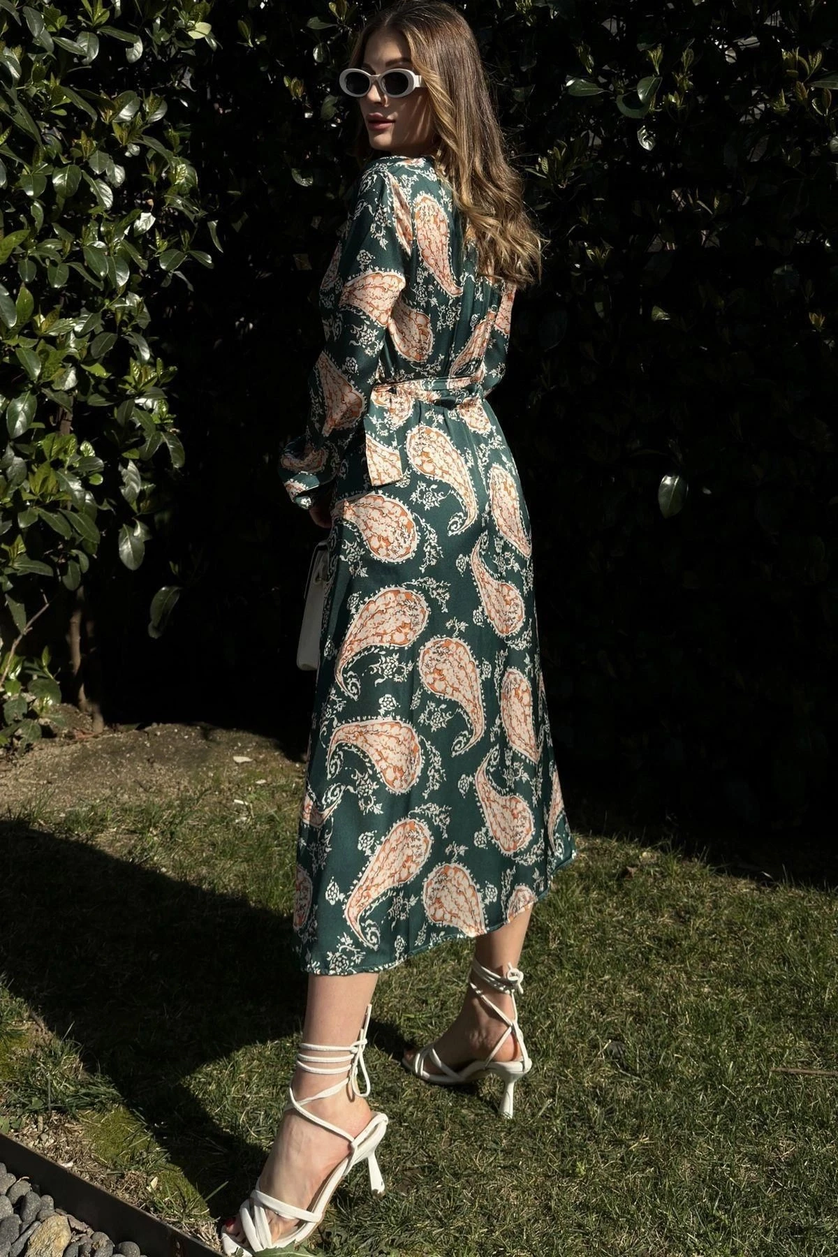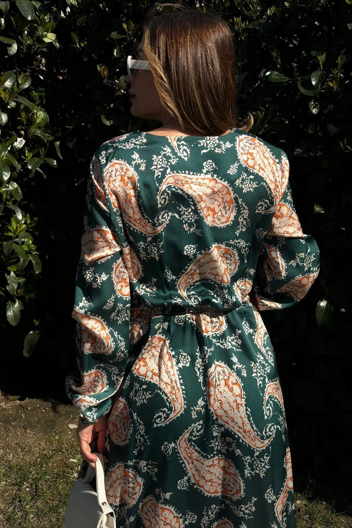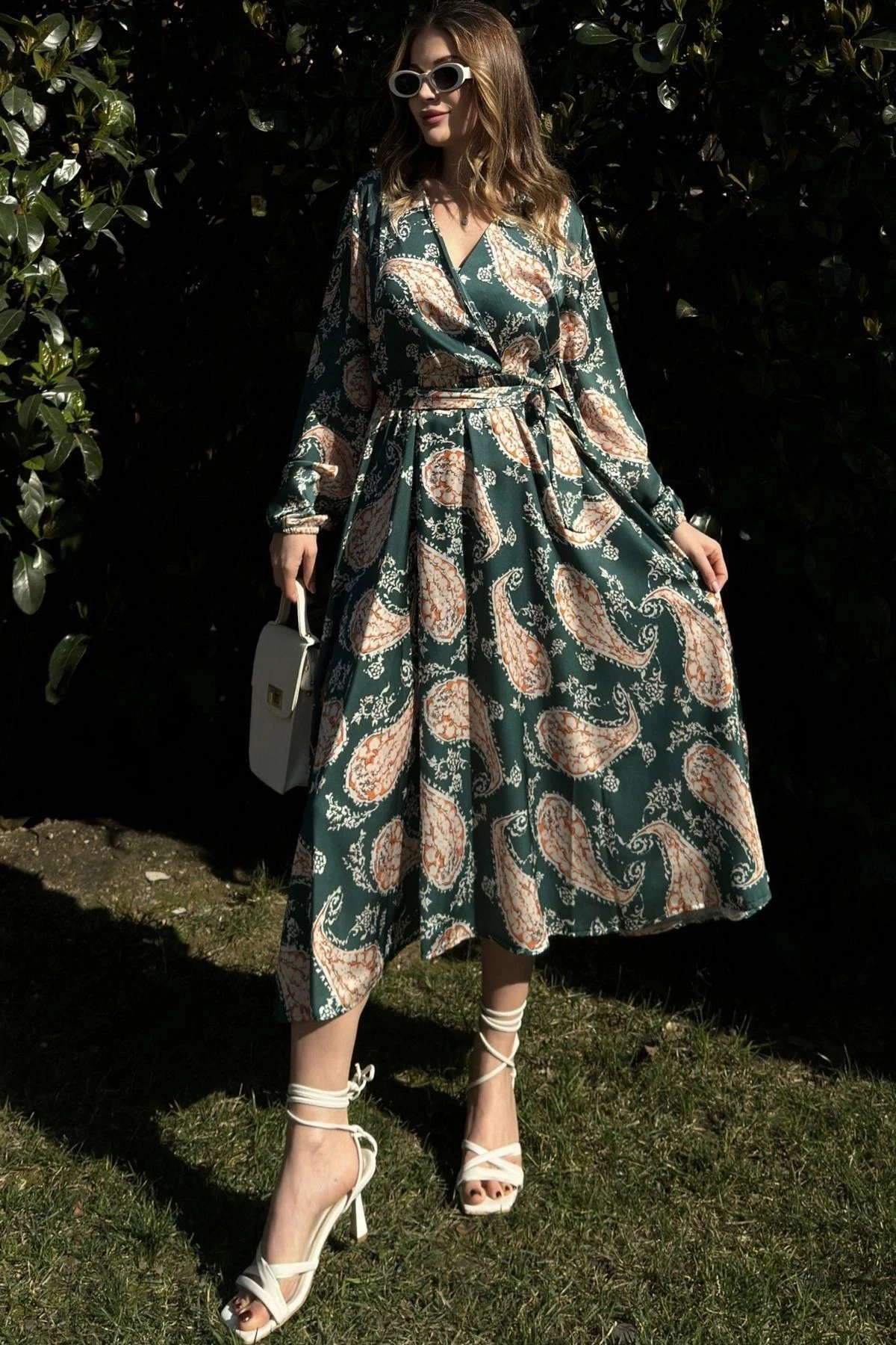 Kadın Yeşil Kruvaze Yaka, Beli Kuşaklı, Kol Bilekleri Lastikli, Salaş, Uzun Saten Elbise