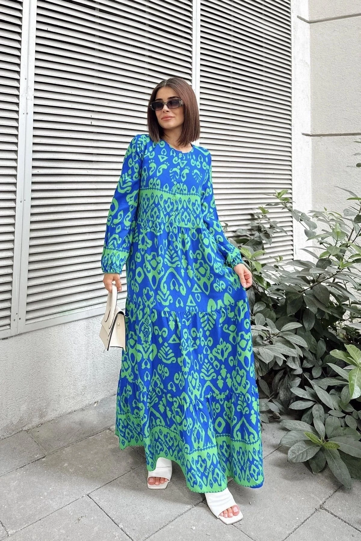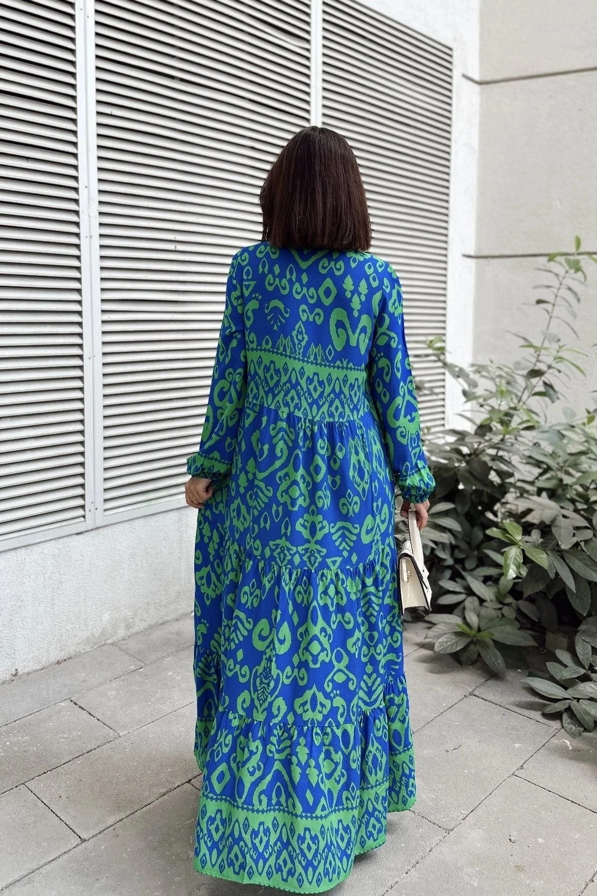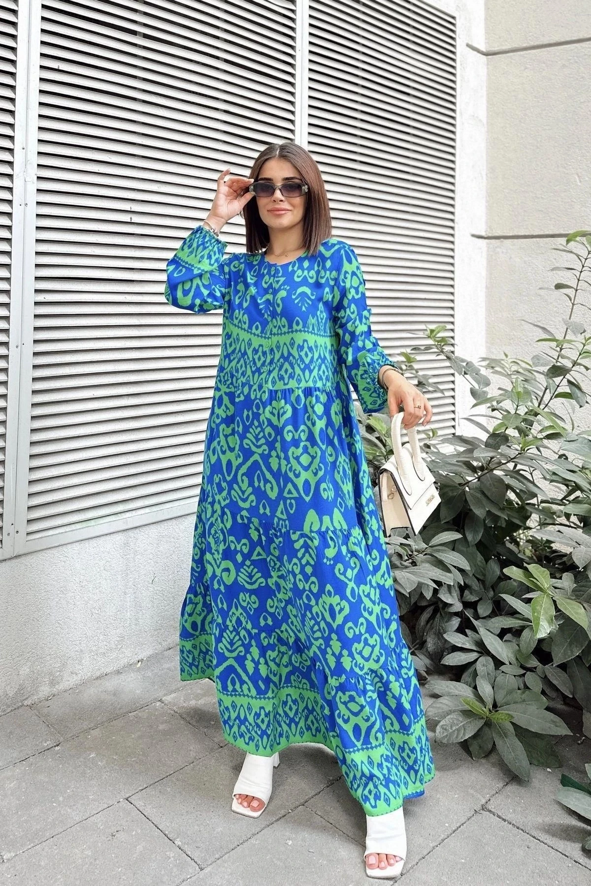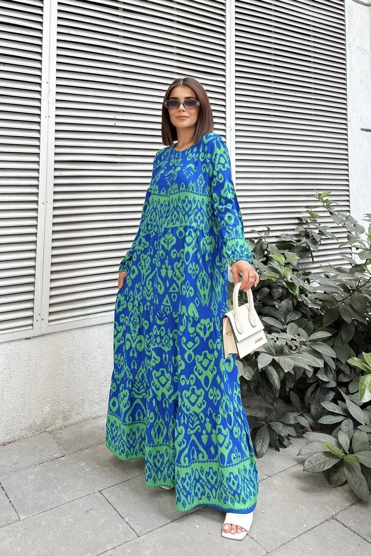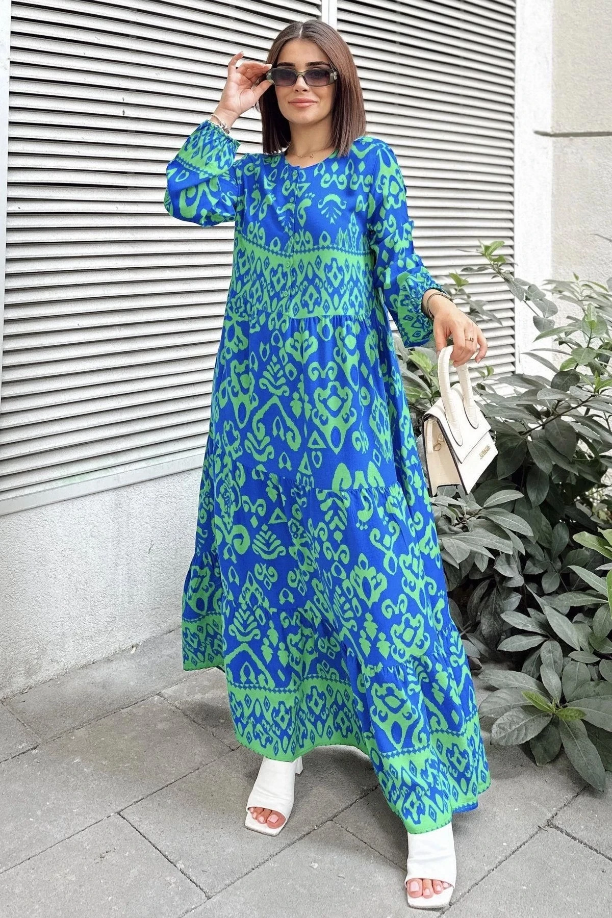 Kadın Yeşil & Mavi Düğmeli Yuvarlak Yaka, Eteği Pliseli, Bilekleri Lastikli, Salaş, Uzun Elbise