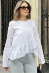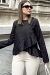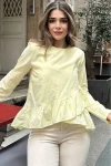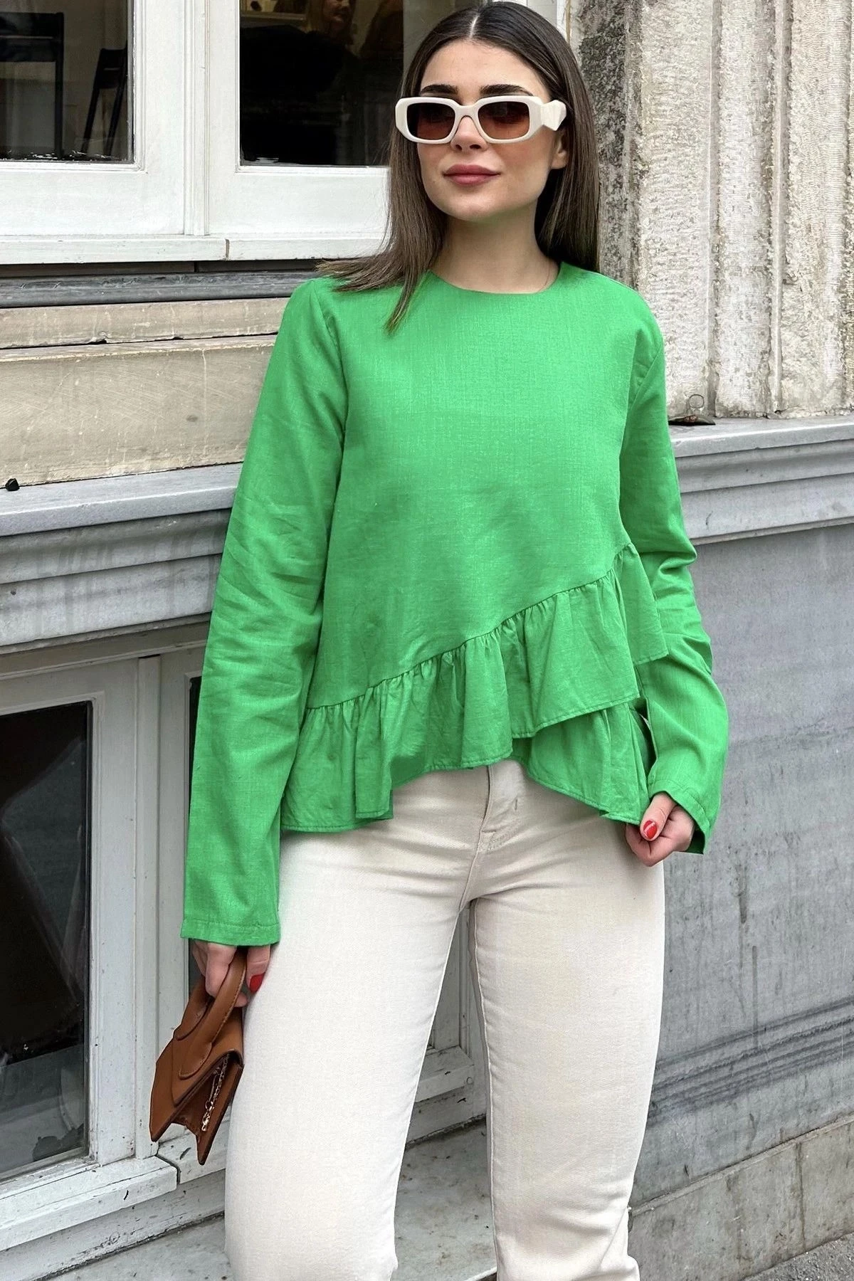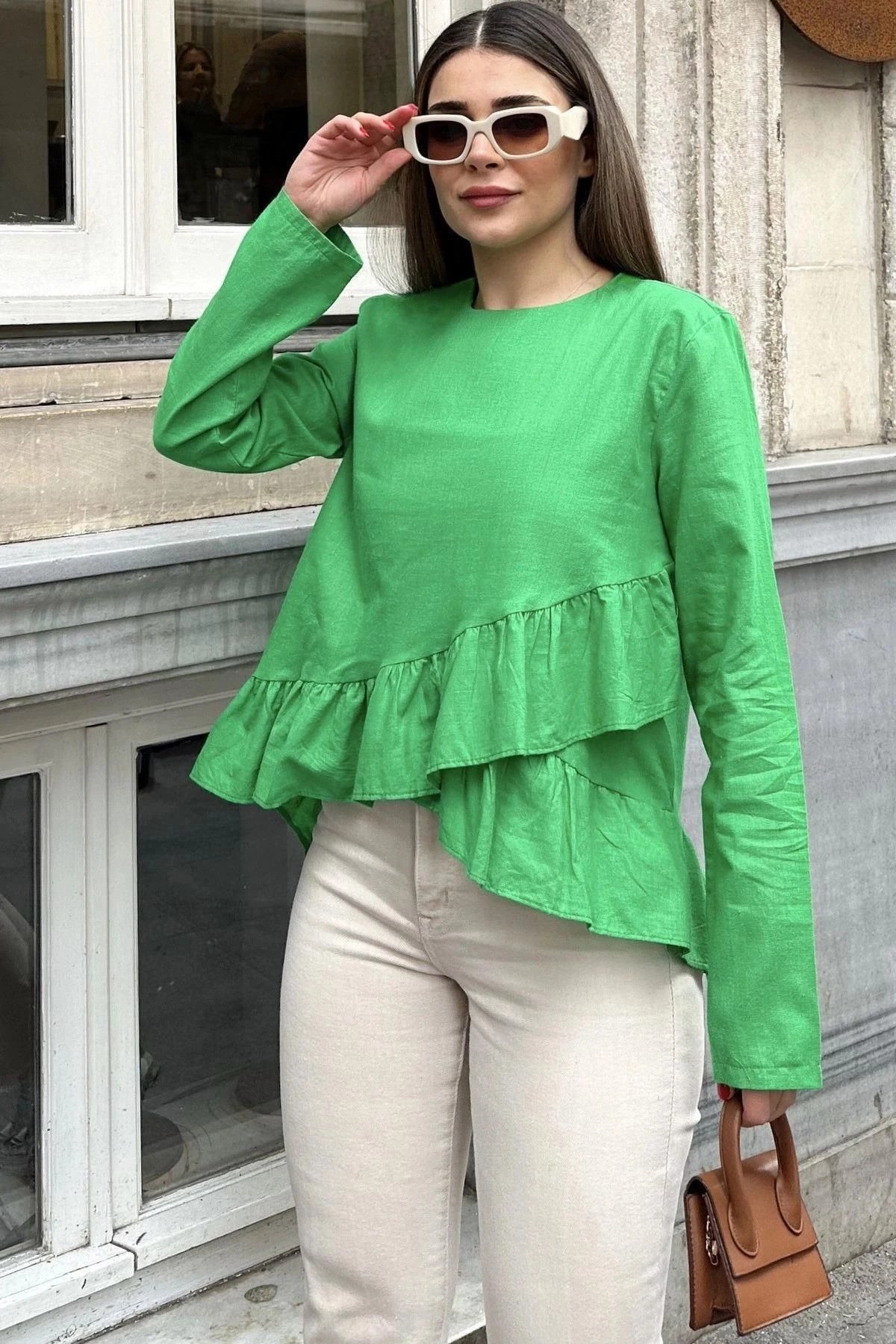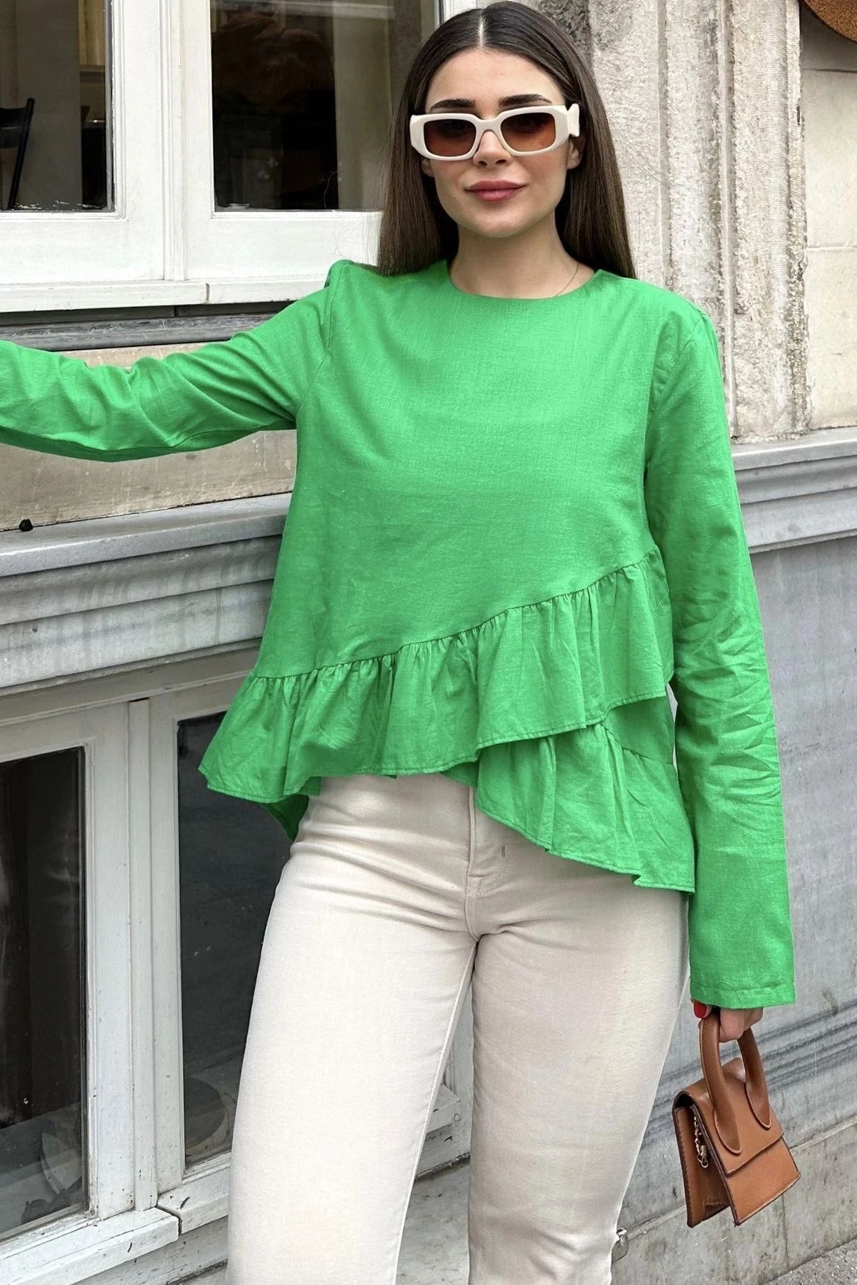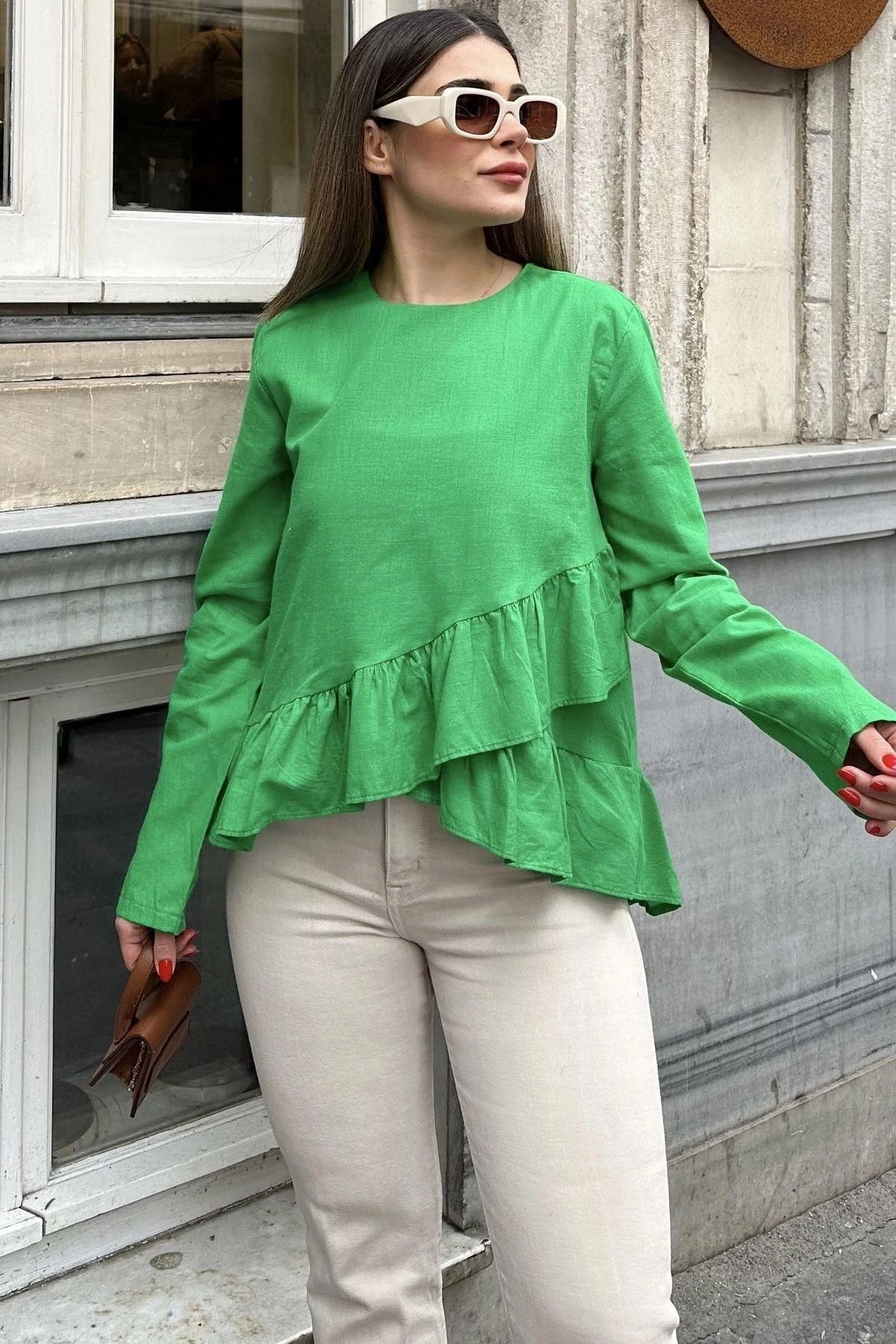 Kadın Yeşil Önü Fırfırlı, Yuvarlak Yaka, Arkası Uzun Pamuklu Salaş Bluz