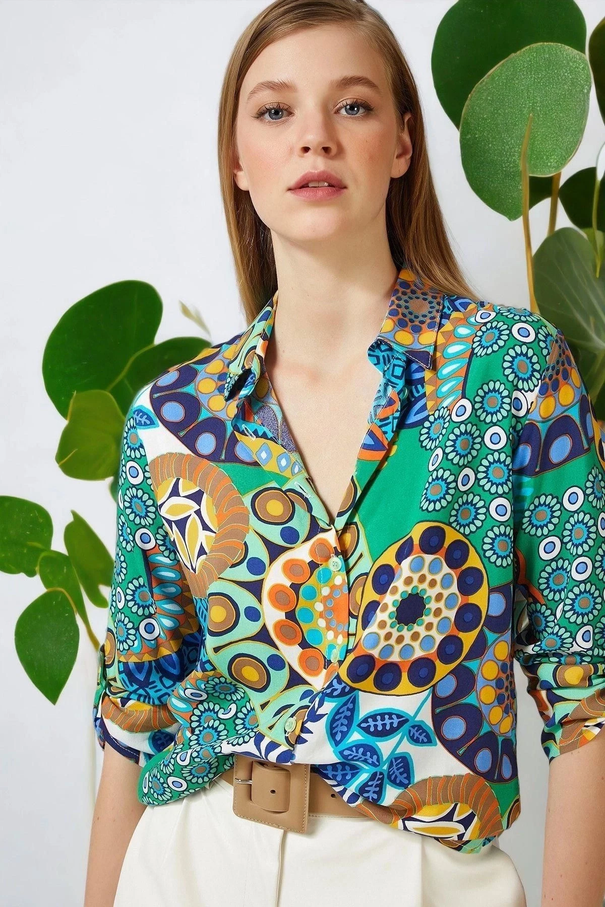 Kadın Yeşil Polo Yaka Çok Renkli Desenli Uzun Kol Regular Kesim Standart Boy Gömlek