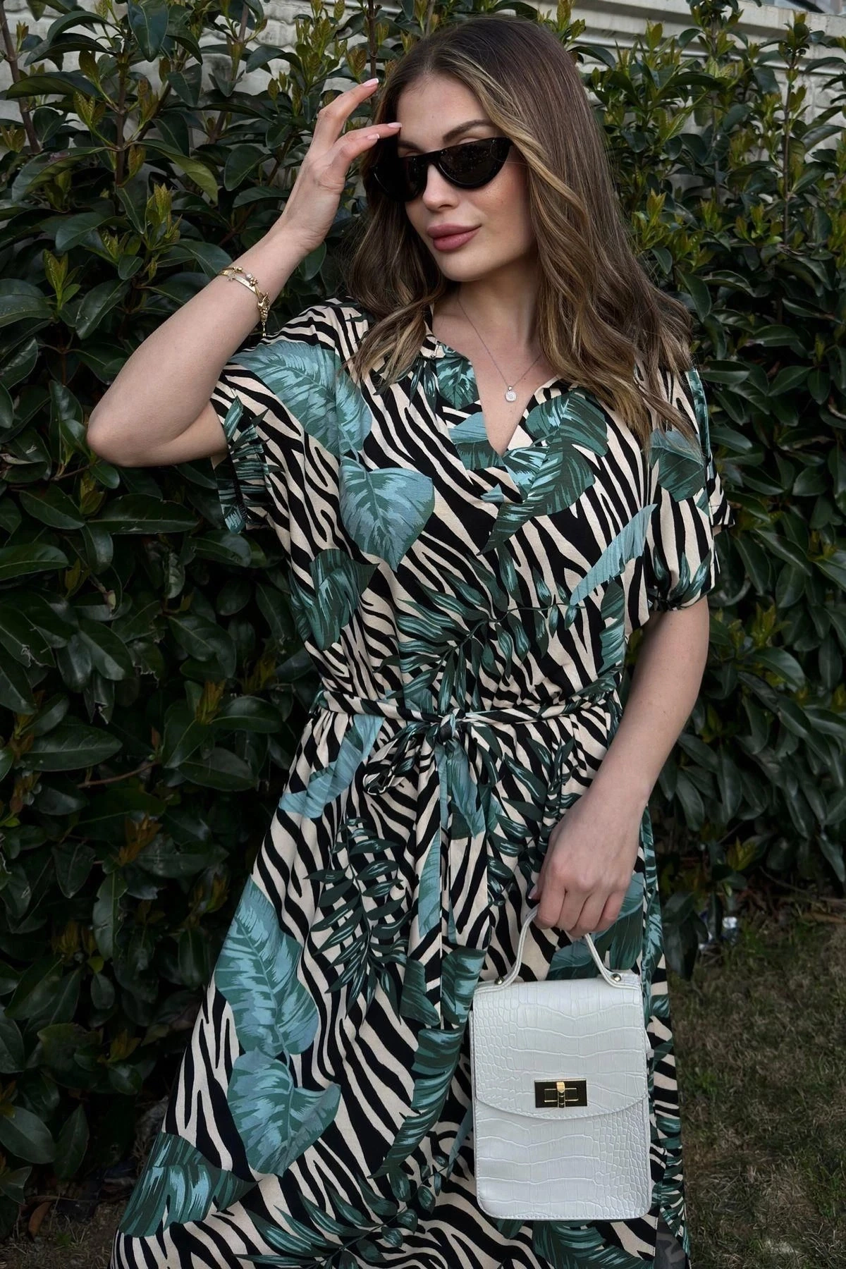 Kadın Yeşil & Siyah Kısa Kol, V Yaka, Beli Kuşaklı Salaş Uzun Elbise