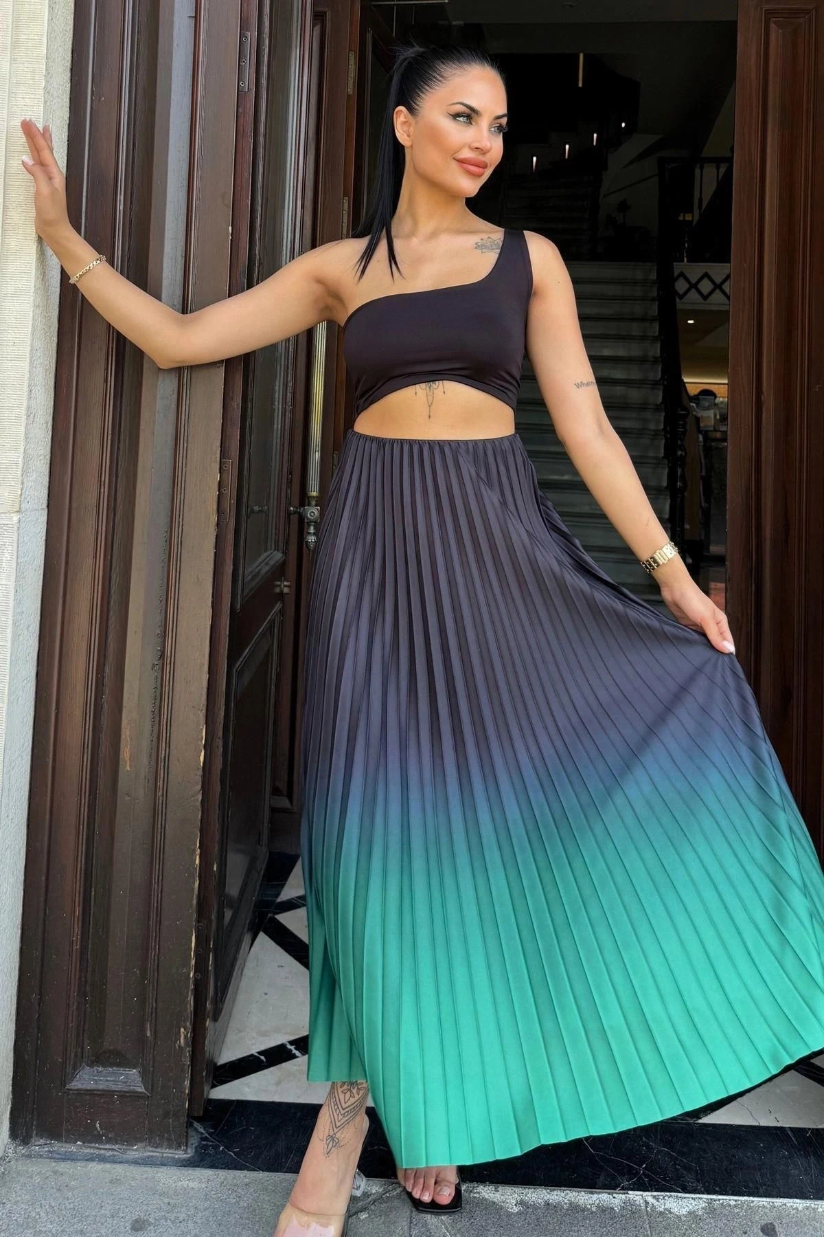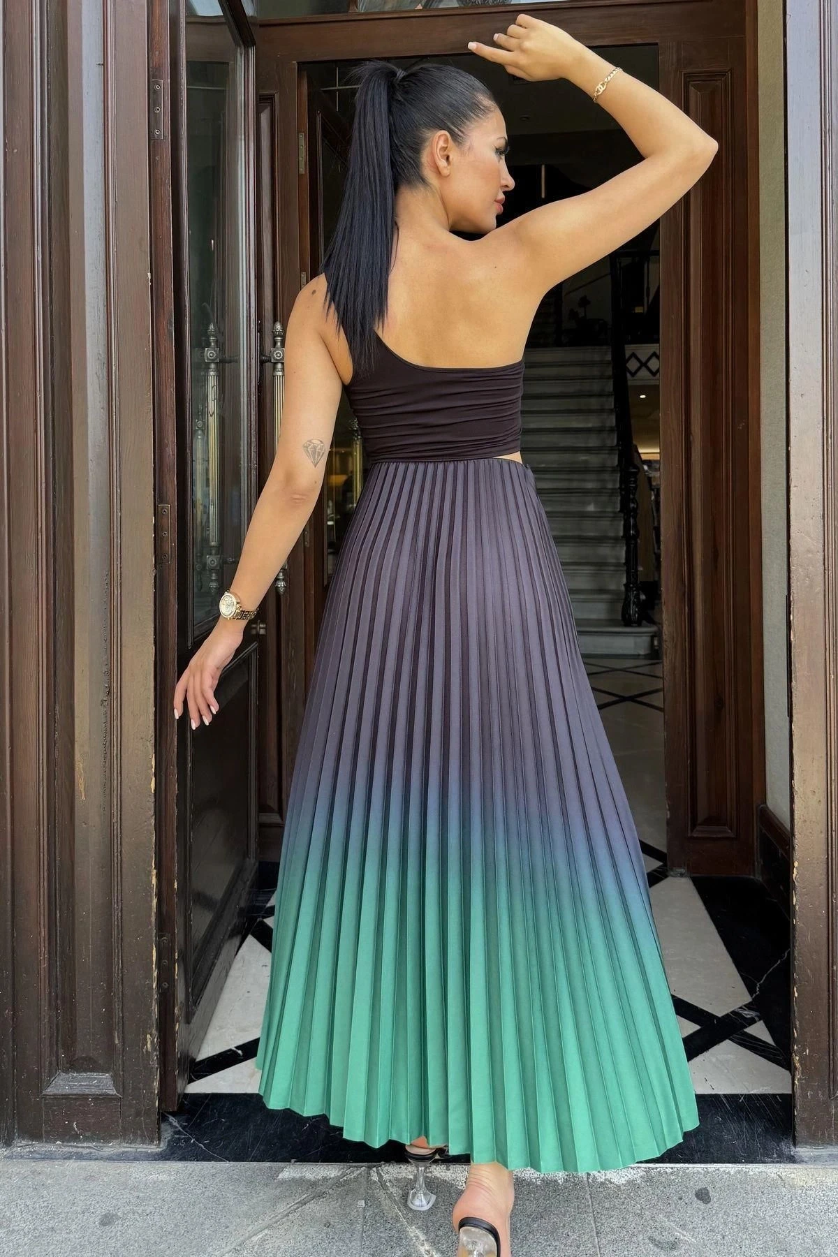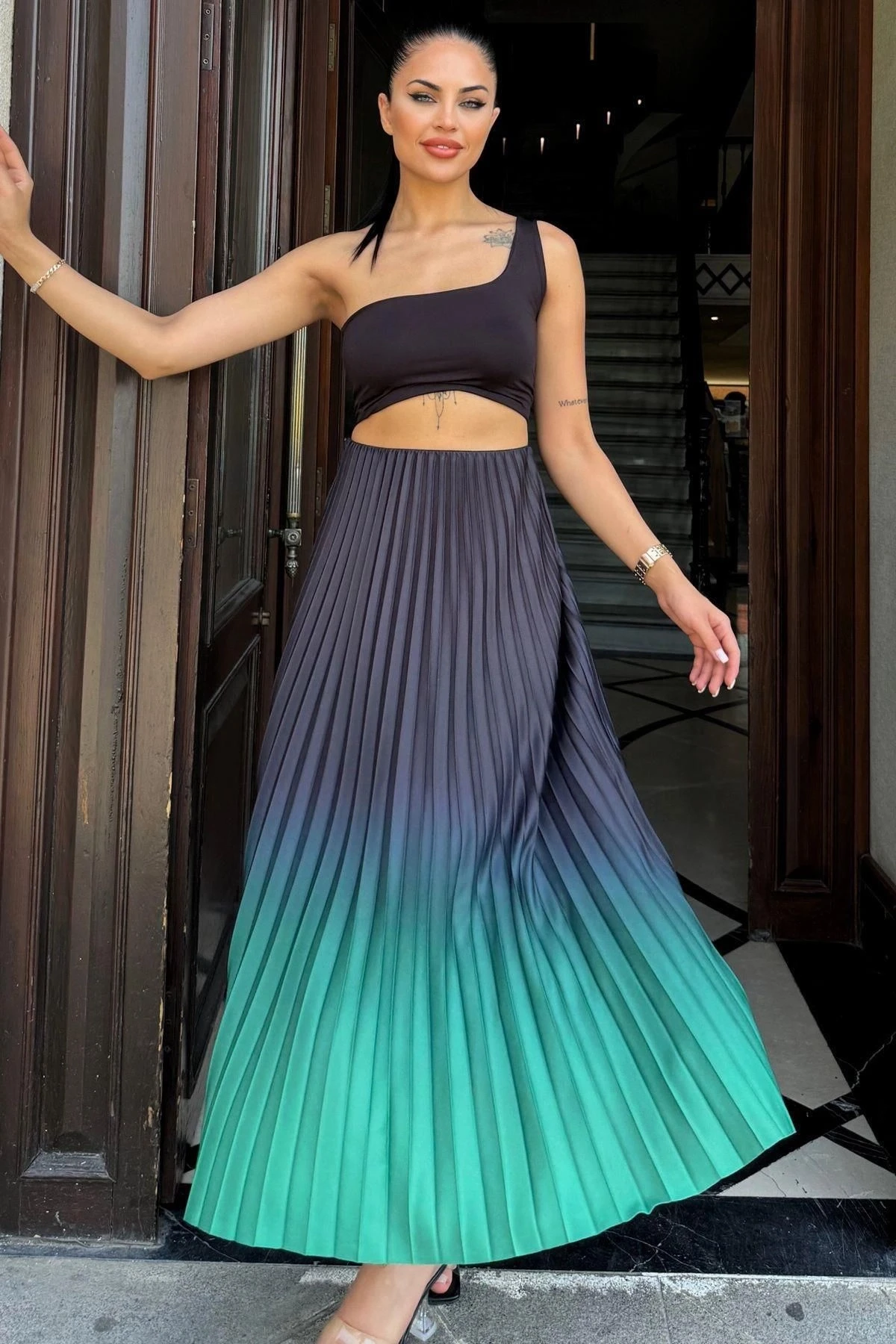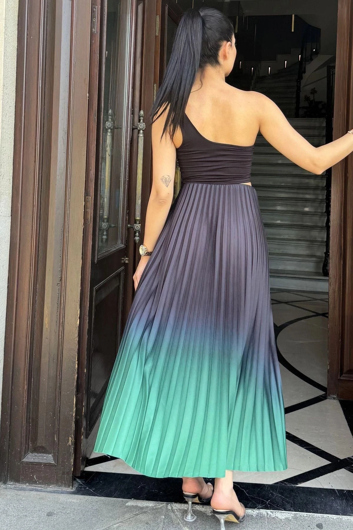 Kadın Yeşil & Siyah Ombre Desen, Pilili Maxi Etek