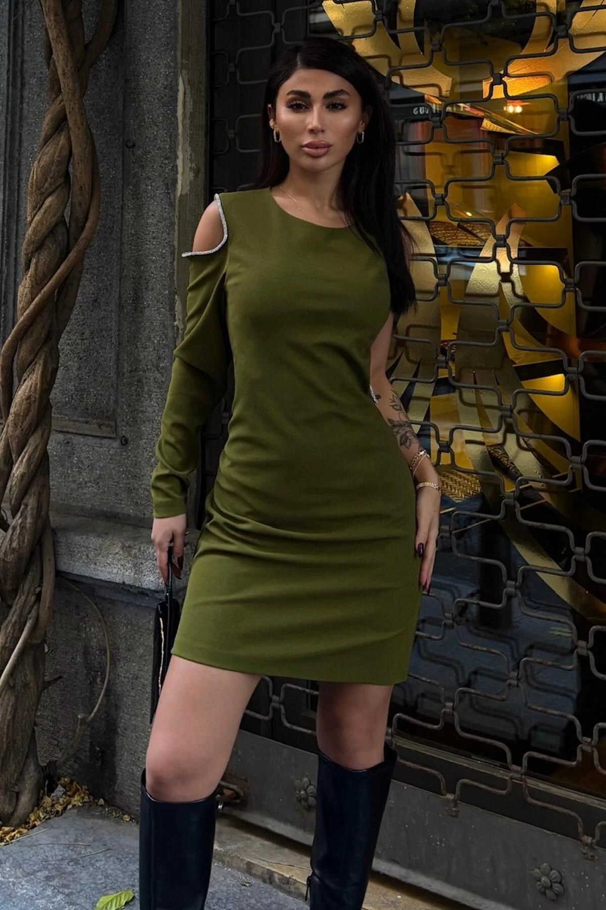 Kadın Yeşil Tek Kol Taşlı Dokuma Mini Elbise