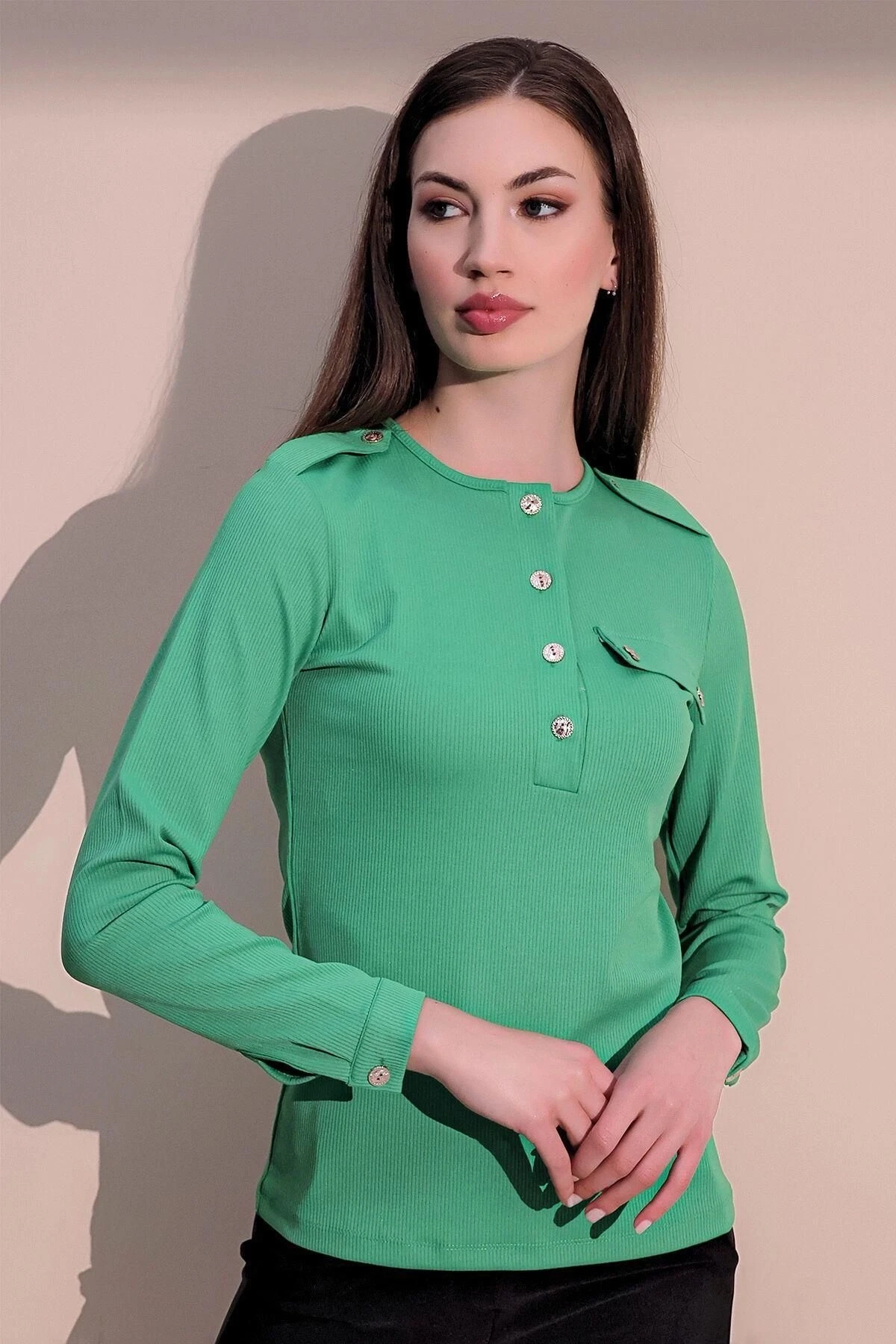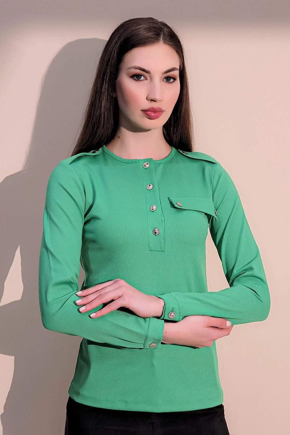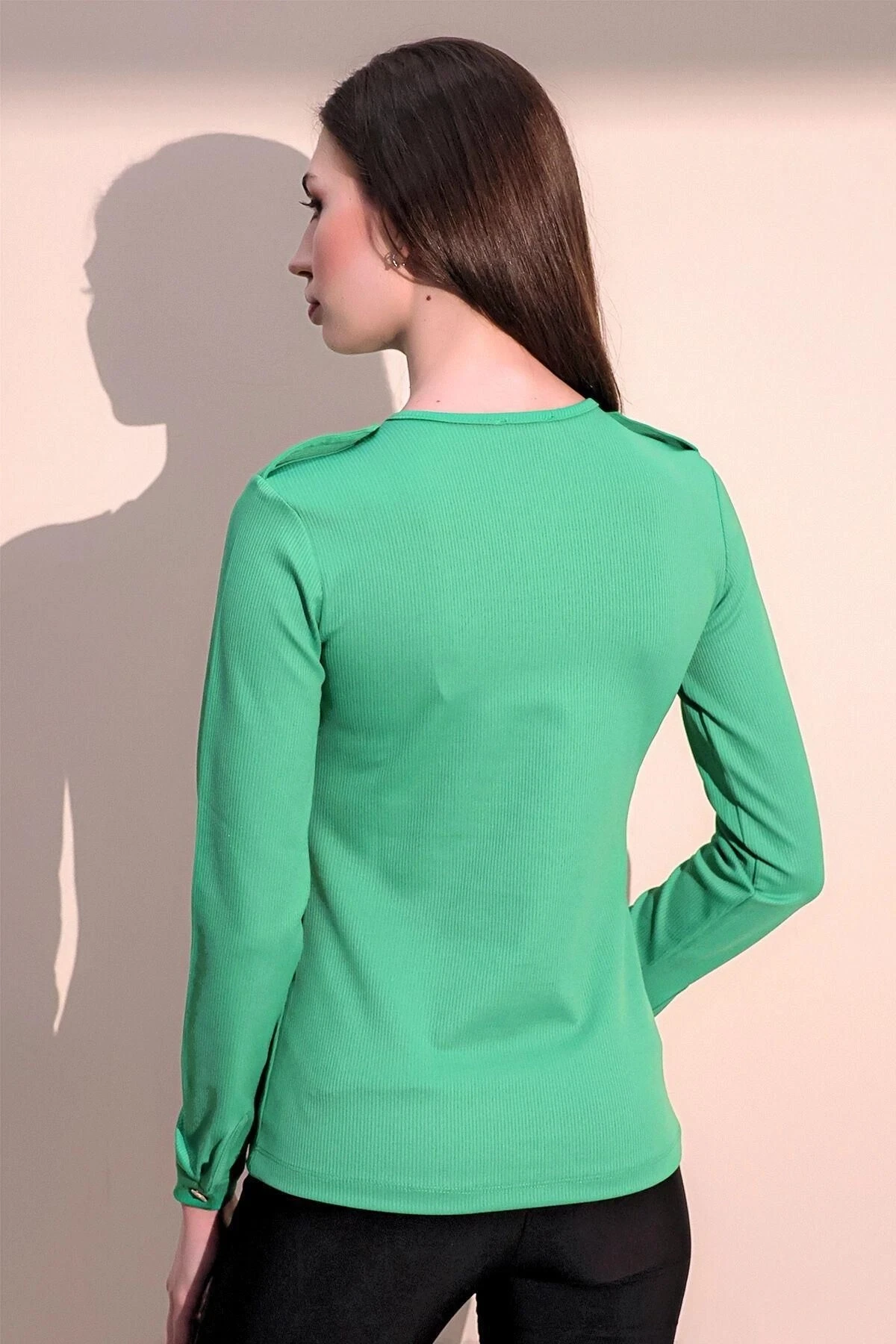 Bu yeşil renkteki uzun kol bluz, kaliteli kumaşı ve zarif tasarımıyla dikkat çeken bir parçadır.; Üzerindeki apoletler, bluza şık ve sofistike bir hava katarak tarzınıza özgünlük katar.; Yarım patlı kaşkorse detayı ise bluzun kesimini belirginleştirirken, bedeninizi güzel bir şekilde vurgular.; Bluzun kumaşı %95 polyester ve %5 elastane içeriğiyle üretilmiştir.; Bu malzemeler, hem dayanıklılık sağlar hem de bluza esneklik katar, böylece hareket özgürlüğünüzü kısıtlamadan konforlu bir şekilde giyebilirsiniz.; Ayrıca, polyester ve elastane kombinasyonu sayesinde bluzun şekli uzun süre korunur ve kırışıklıkları en aza indirir.; Yeşil renk, doğanın canlılığını ve tazeliğini yansıtırken, bluza enerji ve canlılık katar.; Bu nedenle, bu bluzu giyerek kendinizi hem şık hem de ferah hissedebilirsiniz.; Düz kesimi, sadeliği ve zarafeti bir araya getirirken, cepli tasarımı ise kullanışlı bir detaydır.; Bu bluz, herhangi bir özel etkinlikte veya günlük hayatta stilinizi tamamlamak için mükemmel bir seçenektir.; Şıklığı, kaliteyi ve tarzı bir araya getiren bu ürün, gardırobunuzun vazgeçilmez bir parçası olacak.
