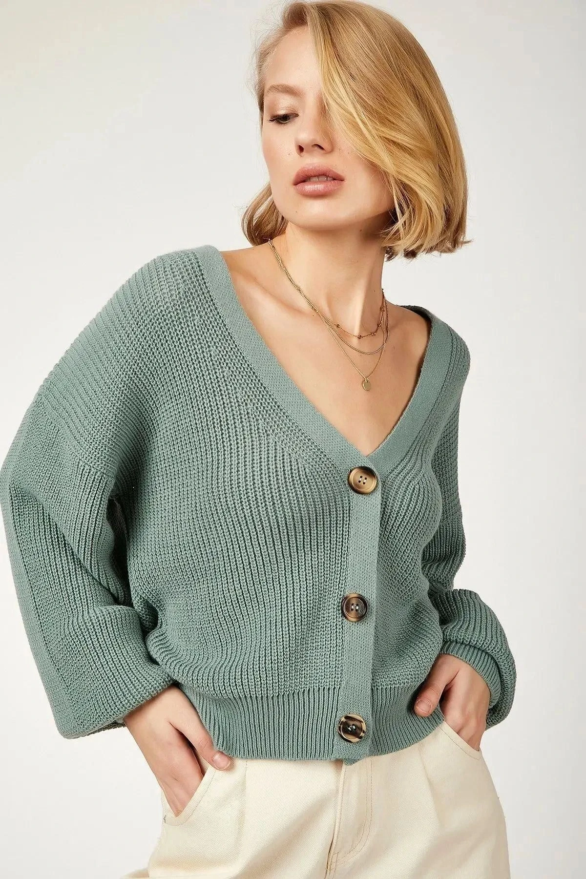 Sizi yeni gelen ürünümüz olan Yeşil Renk V Yaka Uzun Kol Basic Hırka ile tanıştırmaktan mutluluk duyarız! Bu hırka, kaliteli kumaş ve şık tasarımıyla gardırobunuzun vazgeçilmez parçası olacak.; Kumaş içeriği, %50 akrilik ve %50 yün karışımından oluşur.; Bu kombinasyon, hırkanın yumuşak dokusunu ve konforunu artırırken, dayanıklılığını da sağlar.; Hırkanın kumaşı, kaliteli malzeme seçimimizle dikkatlice üretilmiştir, böylece uzun süreli kullanıma dayanıklıdır.; Yeşil renk, hırkaya canlılık ve tazelik katarken, stilinize sofistike bir dokunuş sağlar.; V yaka tasarımı, feminen ve modern bir görünüm elde etmenizi sağlar.; Uzun kollu kesimi, ekstra sıcaklık ve rahatlık sağlar ve her mevsimde giyilebilirlik sunar.; Bu düğmeli hırka, pratiklik ve şıklığı bir araya getirir.; Düz kesim ve standart boyuyla, her bedene uyum sağlar ve her türlü kombinasyon için mükemmel bir temel parça oluşturur.; Şık düğmeleri, hırkayı açıp kapamanızı kolaylaştırırken, tarzınızı da tamamlar.; Bu ürün, günlük giyimden özel etkinliklere kadar geniş bir kullanım yelpazesine sahiptir.; Herhangi bir stil veya mevsimle uyum sağlaması için mükemmel bir seçenektir.; Klasik ve şık bir görünüm için bir etek veya pantolonla kombinleyebilir, rahat bir tarz için kot pantolonlarla tamamlayabilirsiniz.; Bizimle birlikte bu kaliteli ve şık hırkayı keşfetmek için bir adım atın.; Renkli kıyafetlerinizi tamamlayacak ve sizi rahatlıkla şık bir şekilde sıcak tutacak bu hırkayı kaçırmayın.