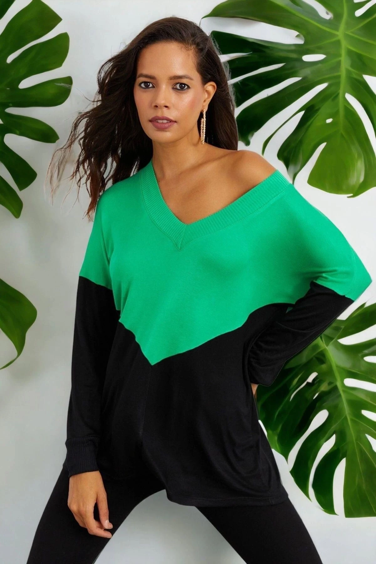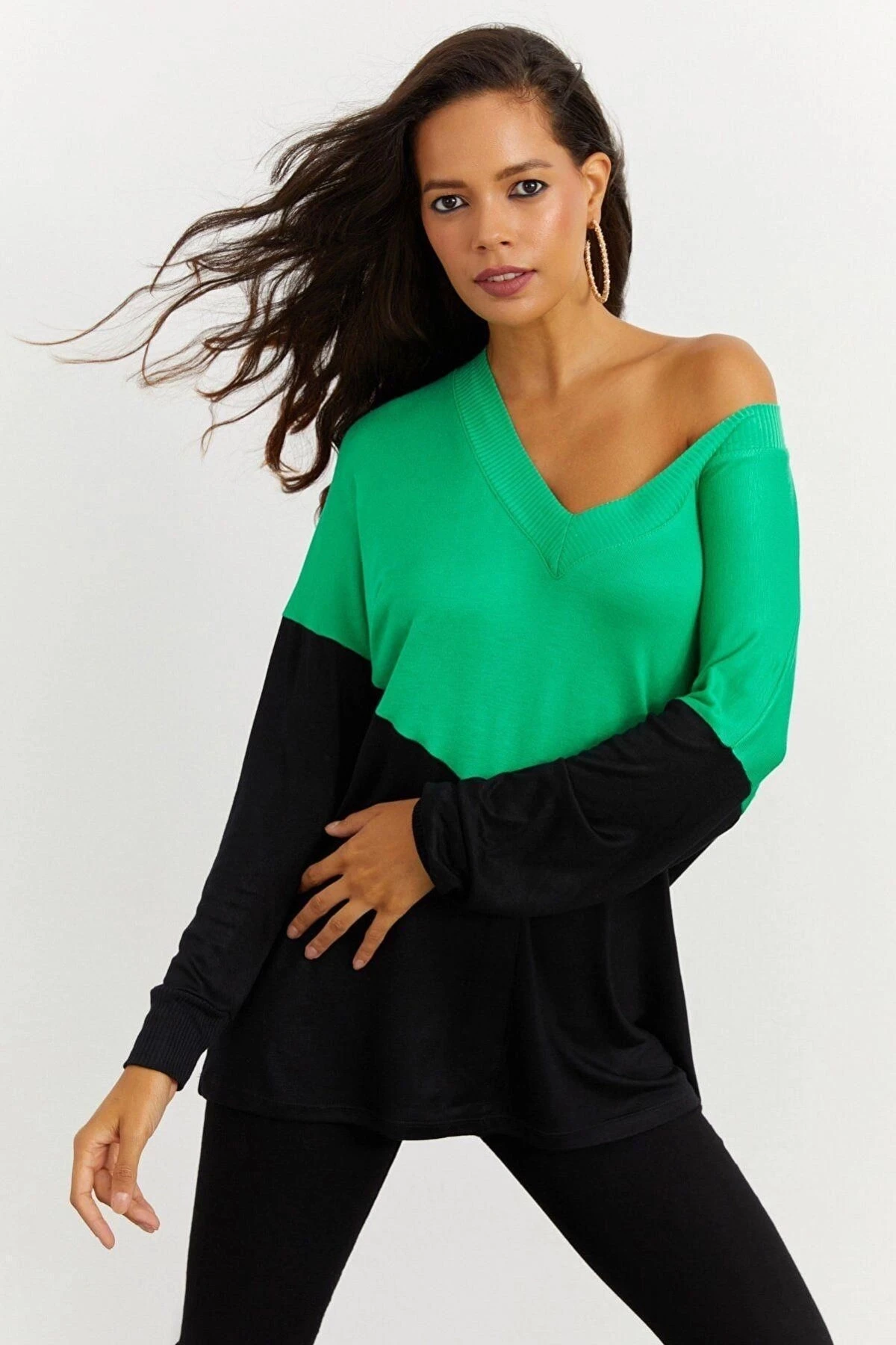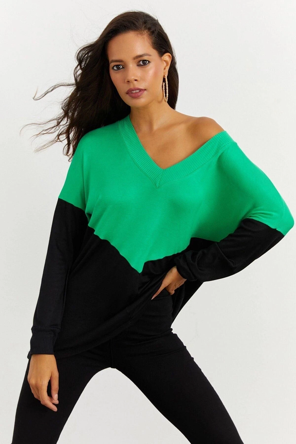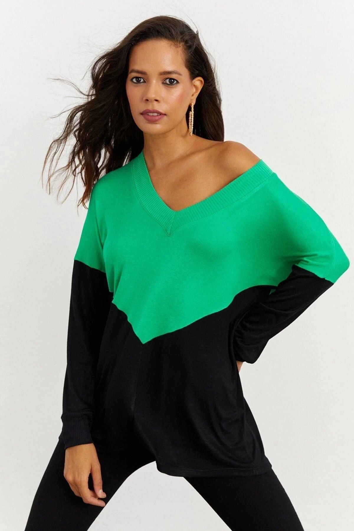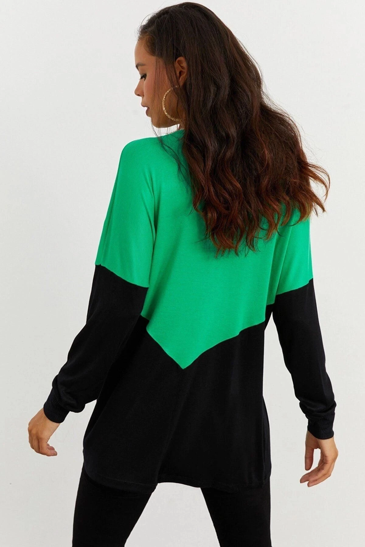 Kadın Yeşil V Yaka, Uzun Kol, Renk Bloklu, Regular Kesim, Maksi Boy Bluz.