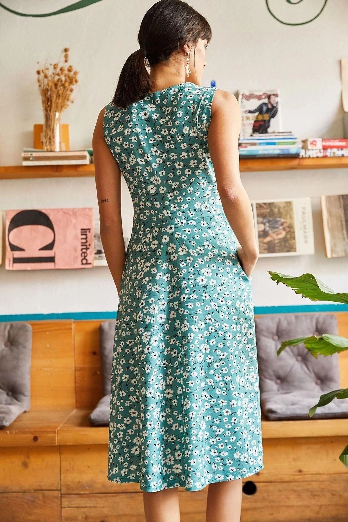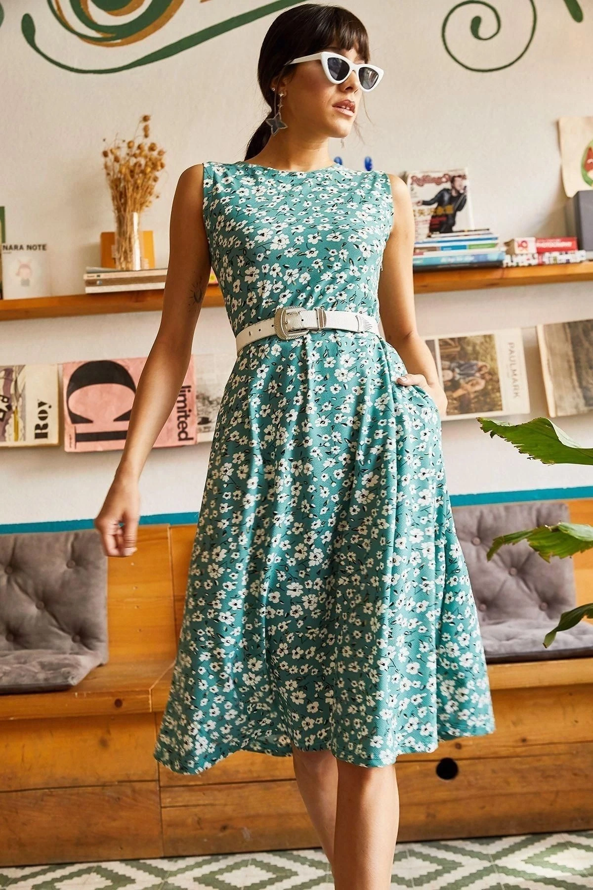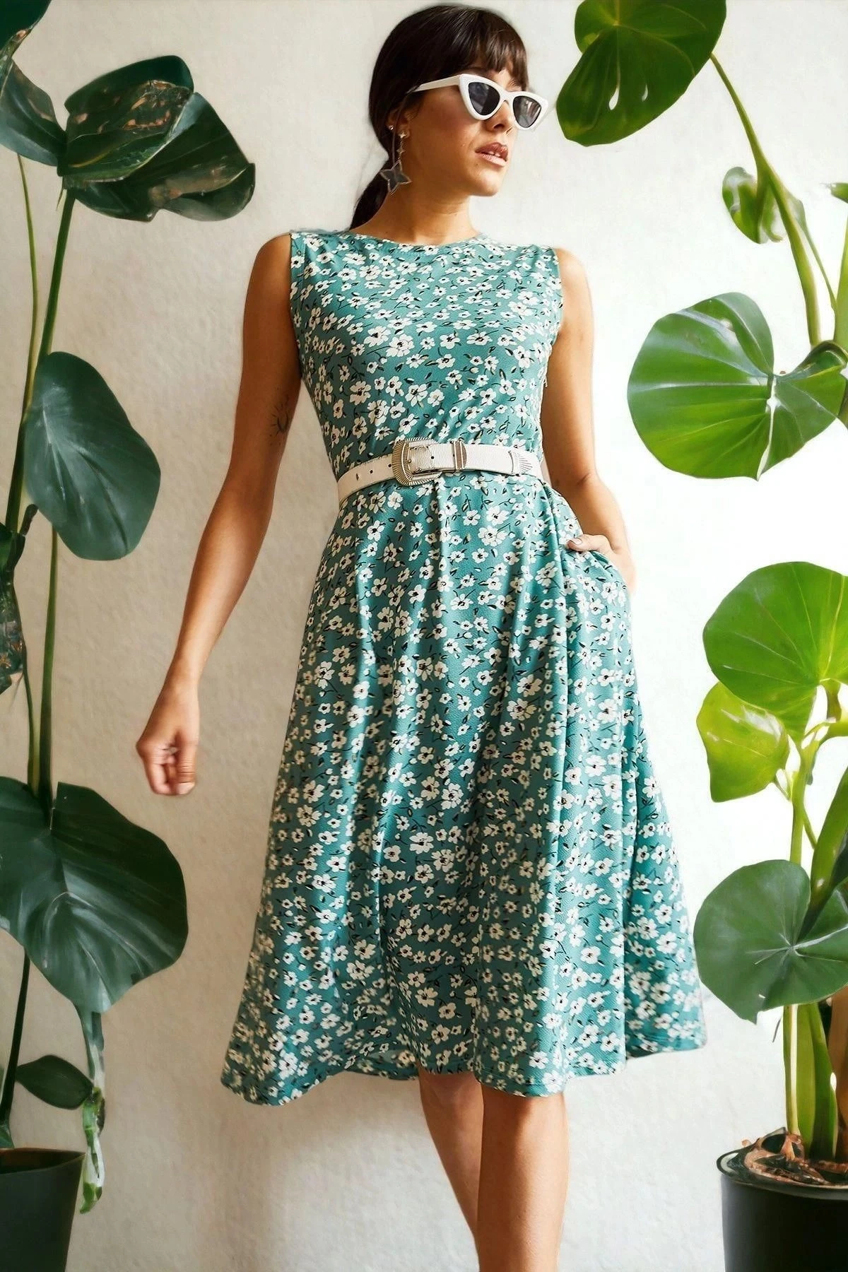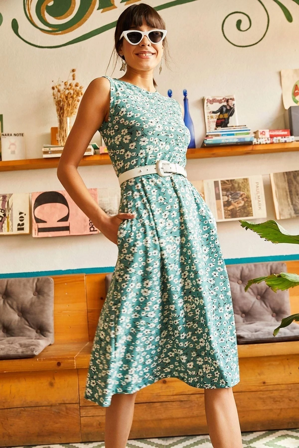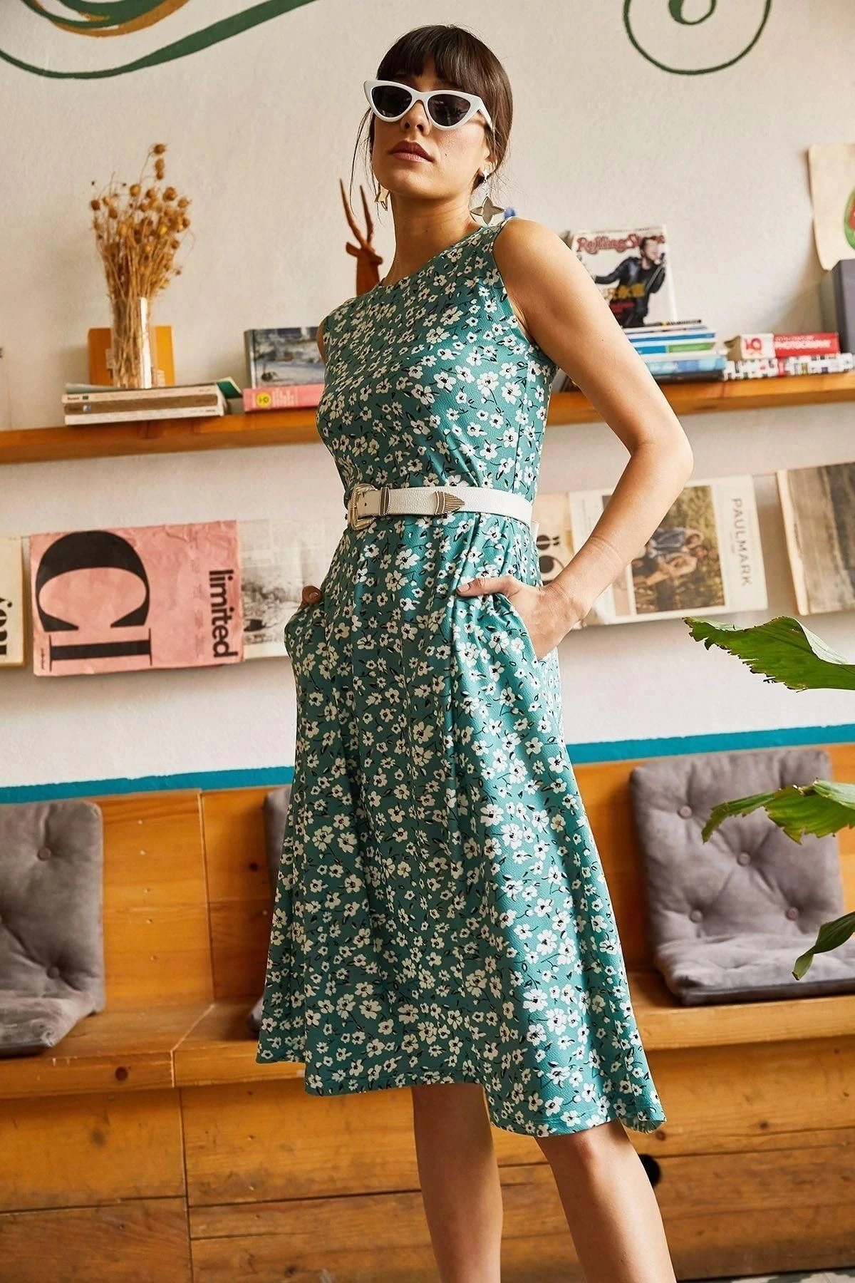 Bu zarif elbise, şıklık ve tarzı bir araya getiriyor.; Yeşil renkli tasarımıyla dikkat çekiyor ve herhangi bir etkinlikte veya özel gününüzde öne çıkmanızı sağlıyor.; Yuvarlak yaka detayı, sizi daha zarif ve sofistike bir görünüme kavuştururken, puantiyeli cep detayları da elbisenin şıklığını tamamlıyor.; Bu elbisenin kumaş içeriği, %95 Polyester ve %5 Elastan'dan oluşuyor.; Bu sayede elbise, hem rahatlık hem de hareket özgürlüğü sunar.; Polyester kumaş, dayanıklılığı ve kolay bakımıyla bilinirken, elastan ise esnekliği ve vücuda uyumuyla öne çıkar.; Bu kombinasyon, elbisenin uzun süre dayanmasını ve her giyimde mükemmel bir şekilde oturmasını sağlar.; Elbisenin regular kesimi ve standart boyu, her bedene mükemmel bir uyum sağlar.; Kusursuz bir şekilde vücudu saran bu kesim, zarif hatlarınızı ön plana çıkarırken, sizi rahat hissettirir.; Ayrıca, sıfır kol tasarımı, yaz aylarında serinlemenizi sağlarken, şık bir görünüm sunar.; Bu elbiseyle herhangi bir etkinlikte veya özel gününüzde göz kamaştıracaksınız.; Zarif tasarımı, dikkat çekici renkleri ve detaylarıyla sizi benzersiz kılacak.; Üstelik, dayanıklı kumaşı sayesinde uzun süre kullanabileceğiniz bir parça olacak.; Bu elbiseyle tarzınızı tamamlayın ve herkesi etkileyin.