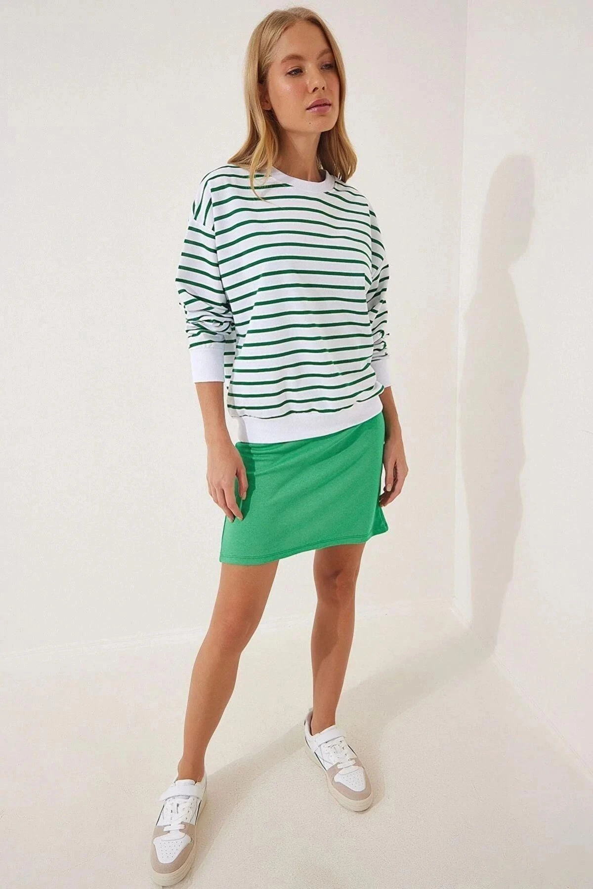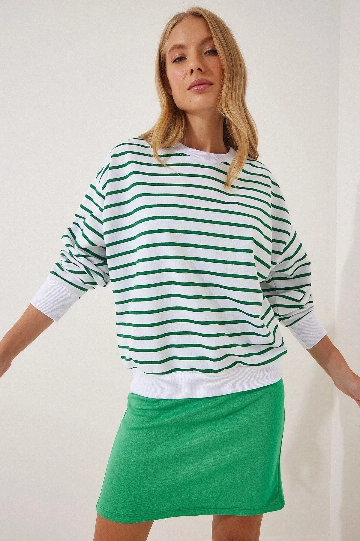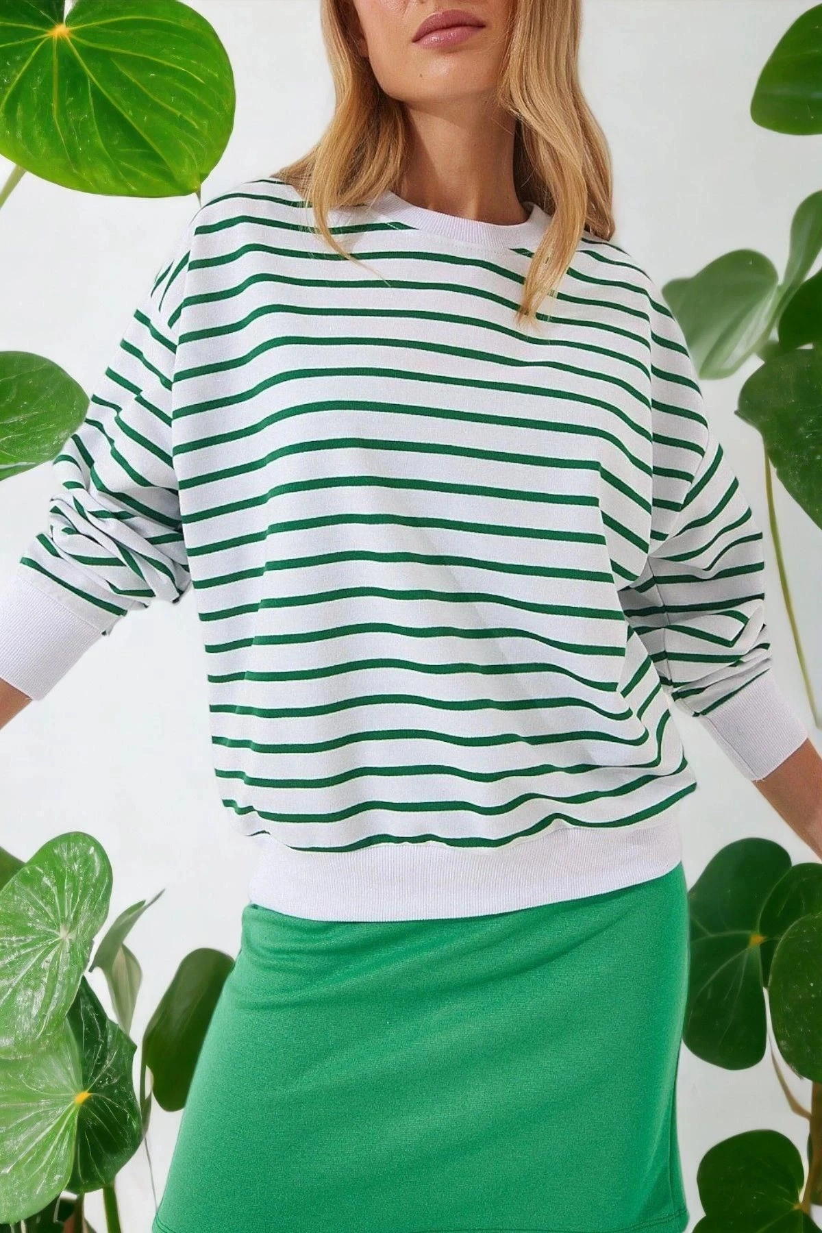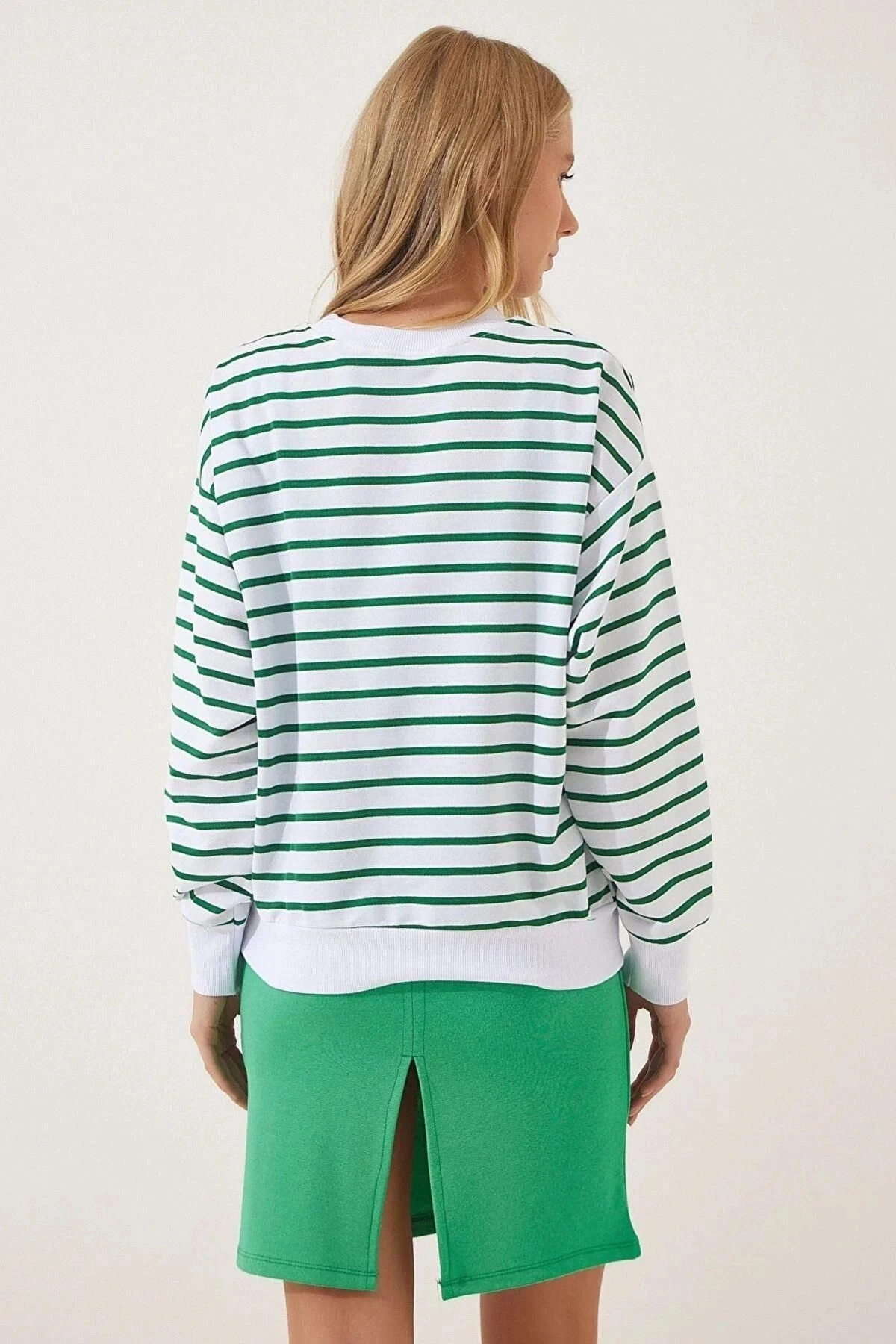 Bu şık sweatshirt, trendleri takip edenler için mükemmel bir seçimdir.; Kaliteli kumaşıyla öne çıkan bu sweatshirt, %95 viskon ve %5 elastan karışımıyla üretilmiştir.; Bu malzeme, hem konforlu bir giyim deneyimi sunar hem de uzun süre dayanıklılığını korur.; Yeşil renkli tasarımıyla göz alıcı bir etki yaratan bu sweatshirt, herhangi bir kıyafetinize kolaylıkla eşlik edebilir.; Özellikle çizgili detaylar, stilinize enerji katarak sizi öne çıkarır.; Yuvarlak yaka ve uzun kollu kesimi, hem şık bir görünüm sağlar hem de rahatlık sunar.; Oversize kesimiyle bu sweatshirt, modern bir tarz arayanlar için idealdir.; Standart boyutlardan biraz daha büyük olan bu kesim, salaş ve rahat bir görünüm elde etmenizi sağlar.; Hem günlük kullanıma uygun hem de özel günlerde tarzınızı tamamlayacak bir parça olarak öne çıkar.; Bu sweatshirt'ün kalıp ve tasarımı özenle düşünülmüştür.; Yüksek kaliteli kumaşı, formunu korumasına yardımcı olur ve uzun süreli kullanımda bile şeklini kaybetmez.; Dayanıklı dikişleri ve mükemmel detaylarıyla bu sweatshirt, tarzınızı ifade etmeniz için güvenilir bir seçenektir.; Bu ürün, şıklığı ve konforu bir araya getiren harika bir seçimdir.; Viskon ve elastan karışımı kumaşı, yeşil renkli tasarımı, çizgili detayları ve oversize kesimiyle öne çıkar.; İster günlük giyimde kullanın, ister özel bir etkinlikte şık bir görünüm elde etmek isteyin, bu sweatshirt her duruma uyum sağlayacak ve tarzınızı tamamlayacaktır.