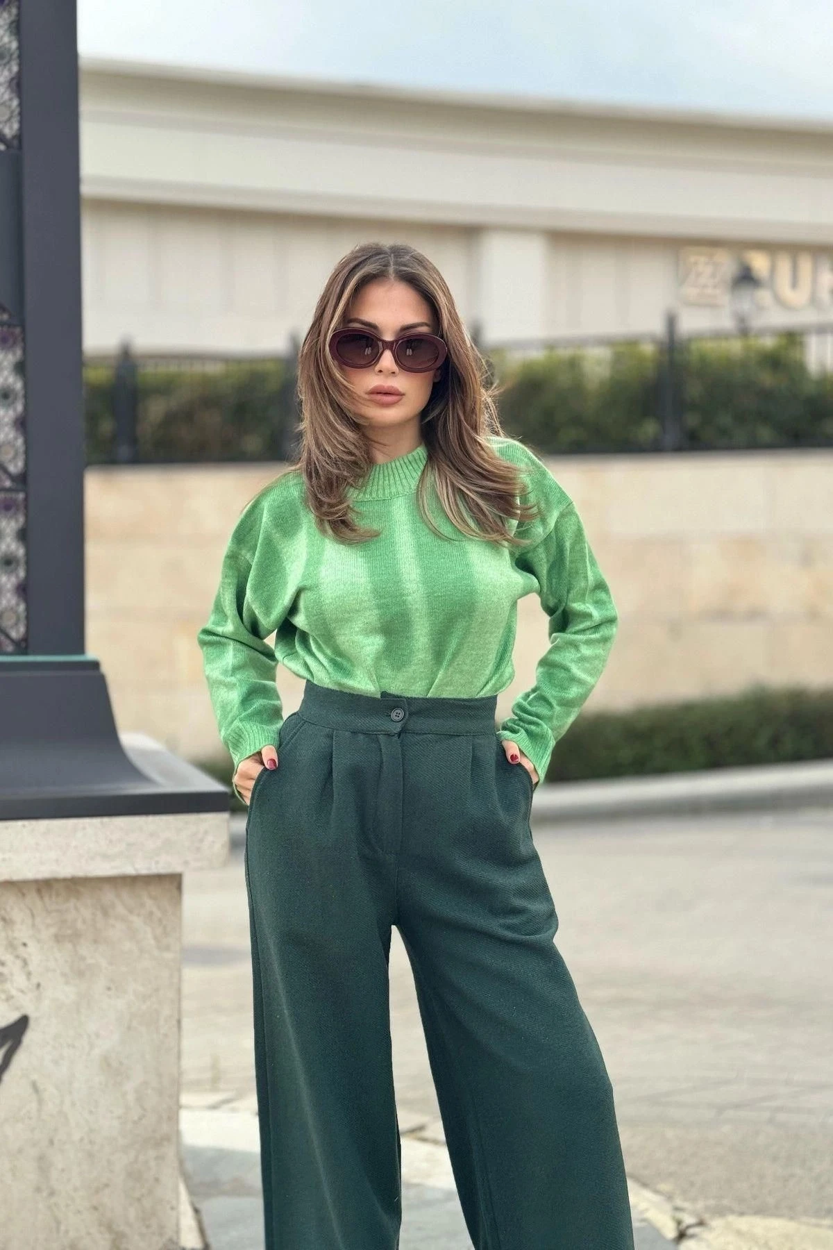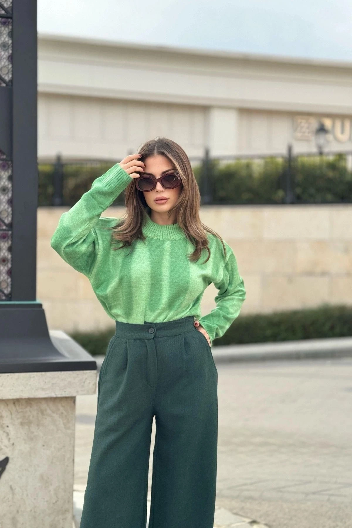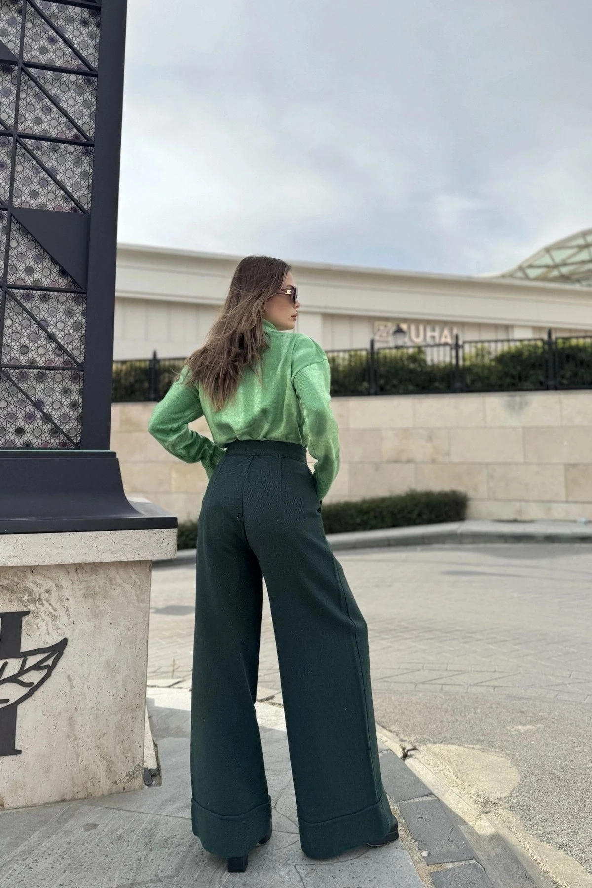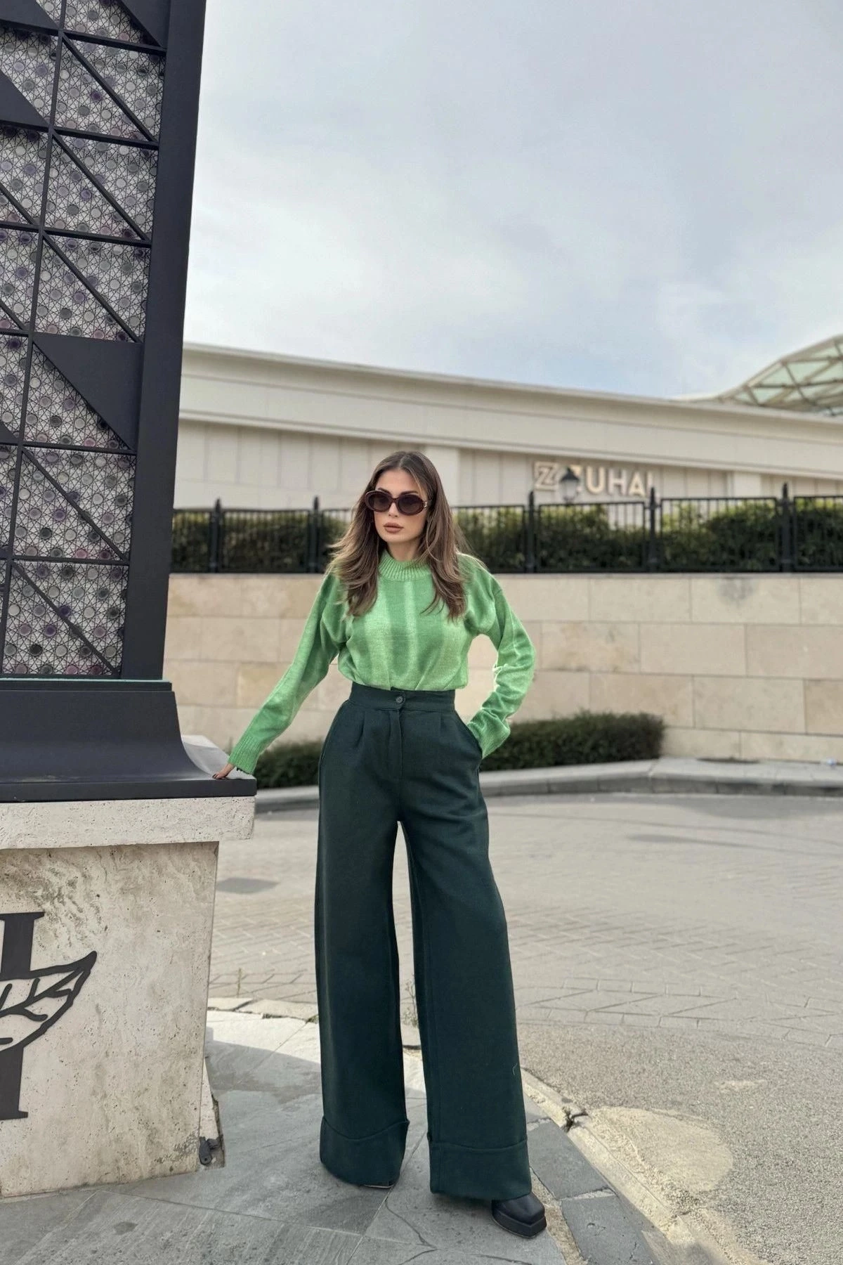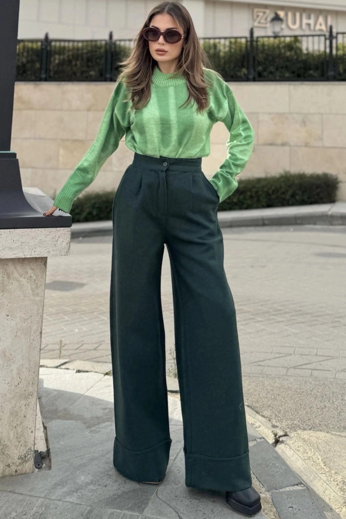 Kadın Zümrüt Yeşil Duble Paça, Beli Pliseli, Fitilli Kaşe Kumaş, İspanyol Pantolon