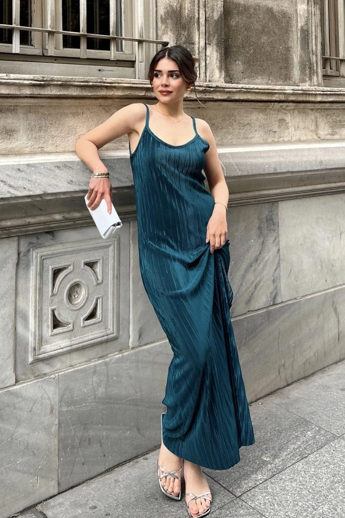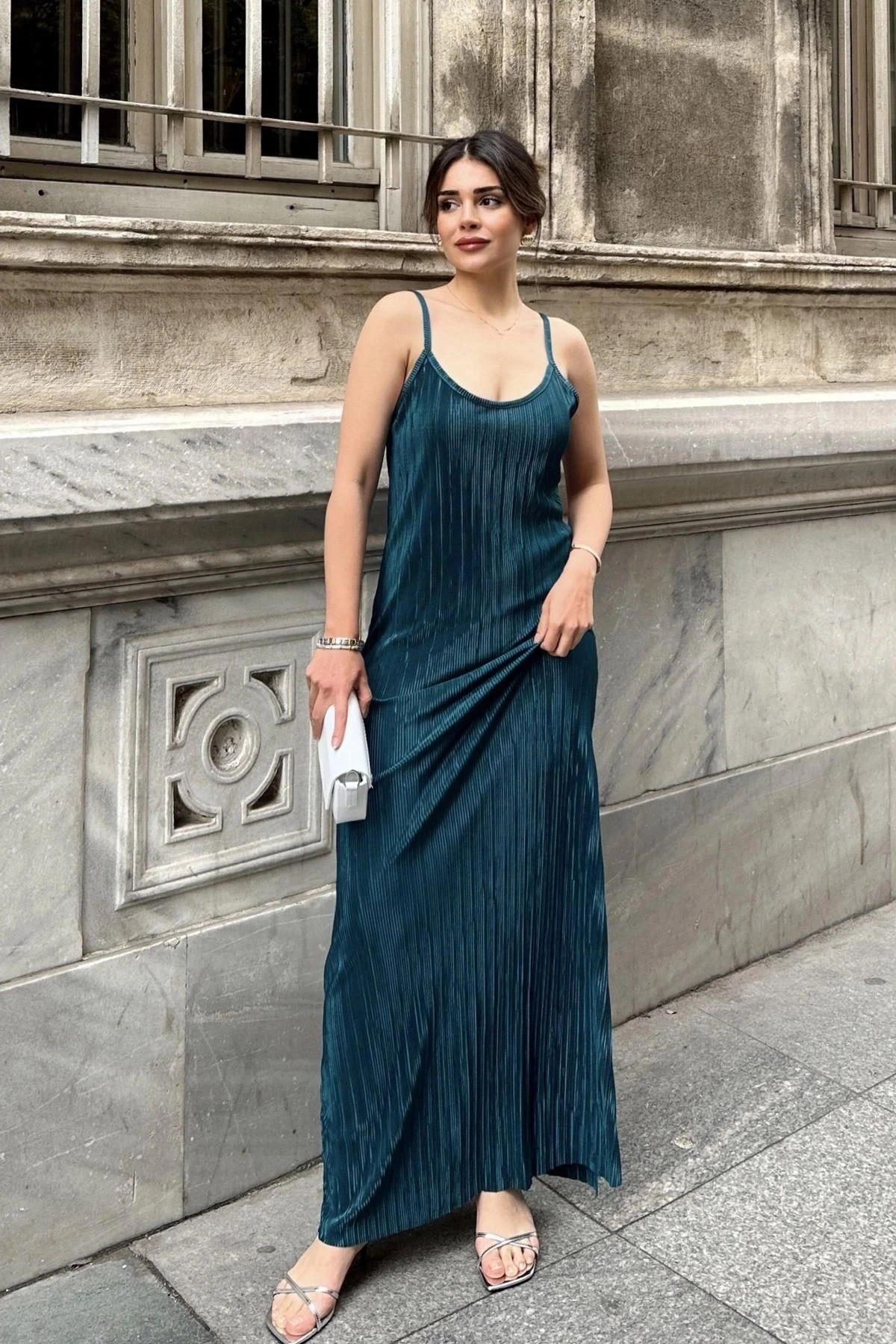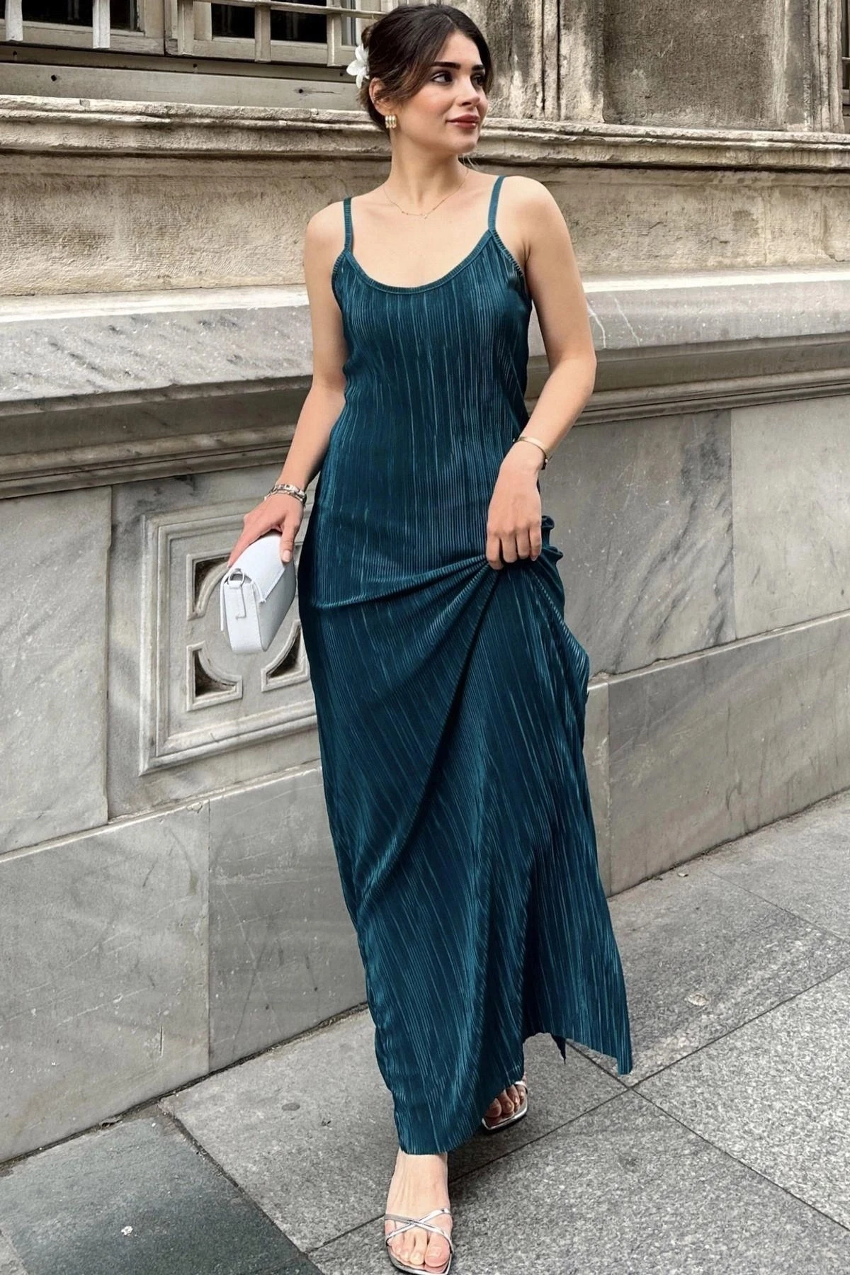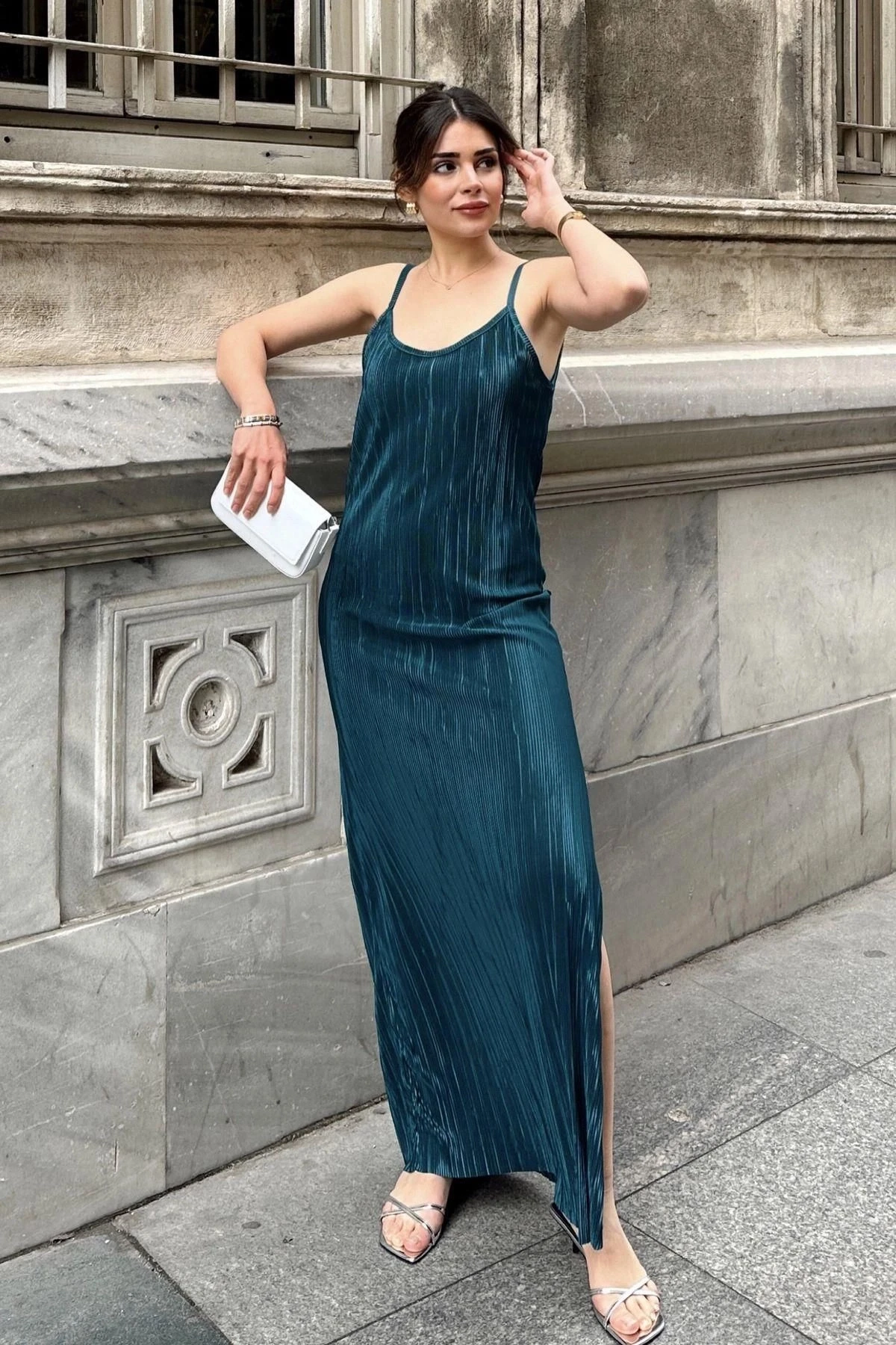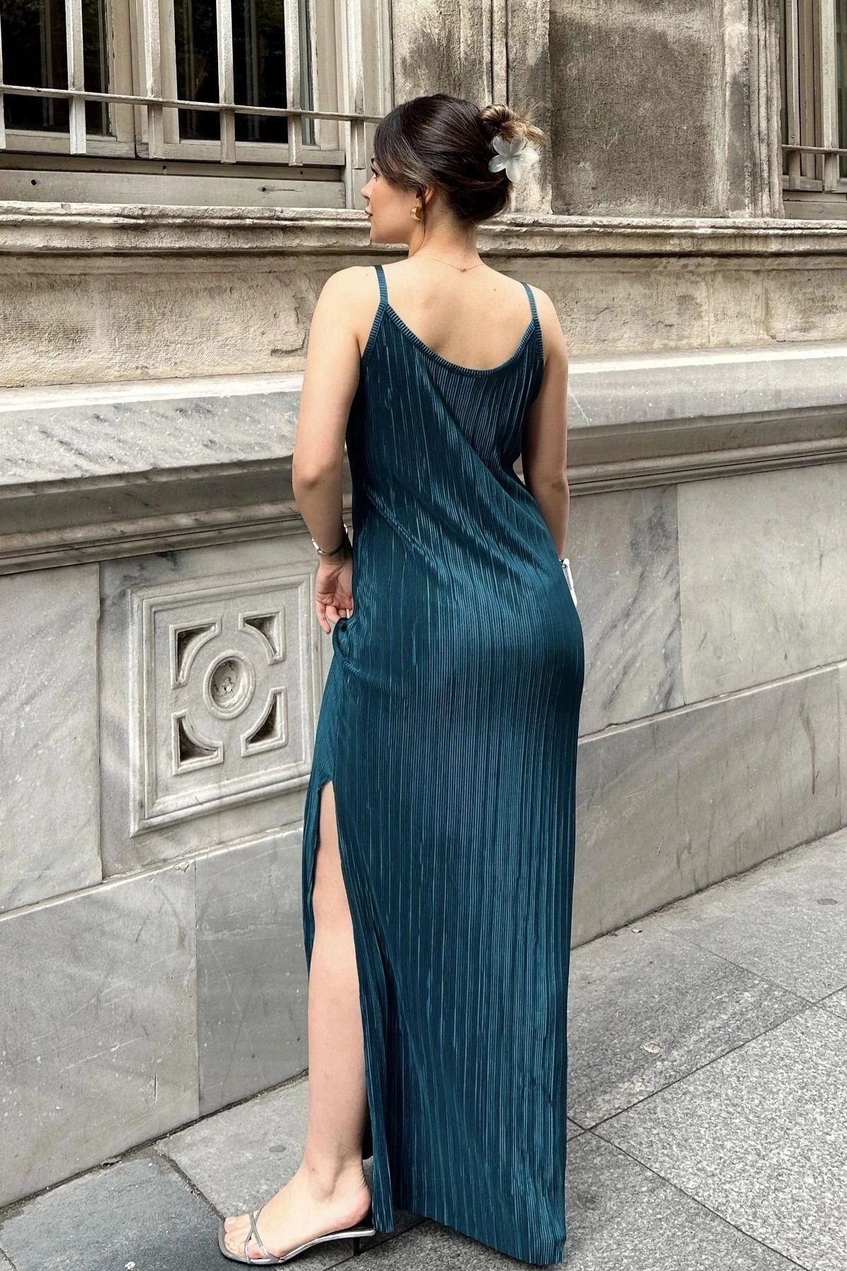 Kadın Zümrüt Yeşil İnce Askılı, V Yaka, Yırtmaç Detaylı, Uzun Pliseli Elbise