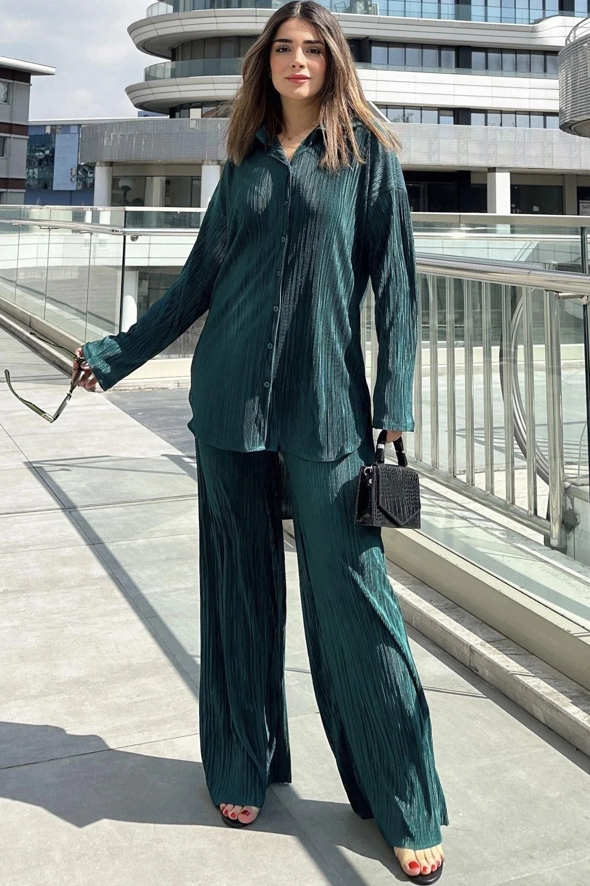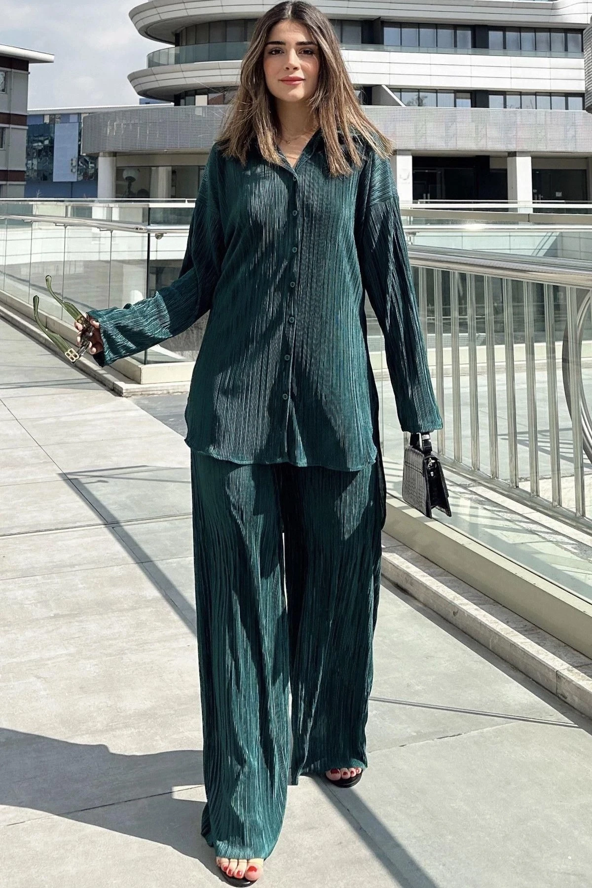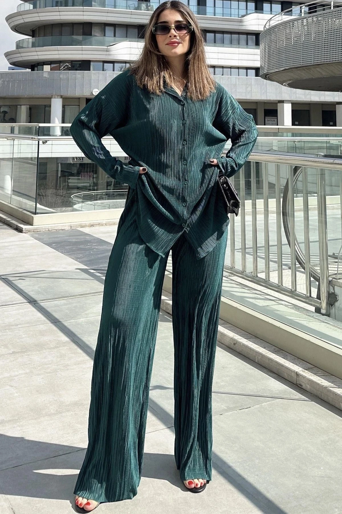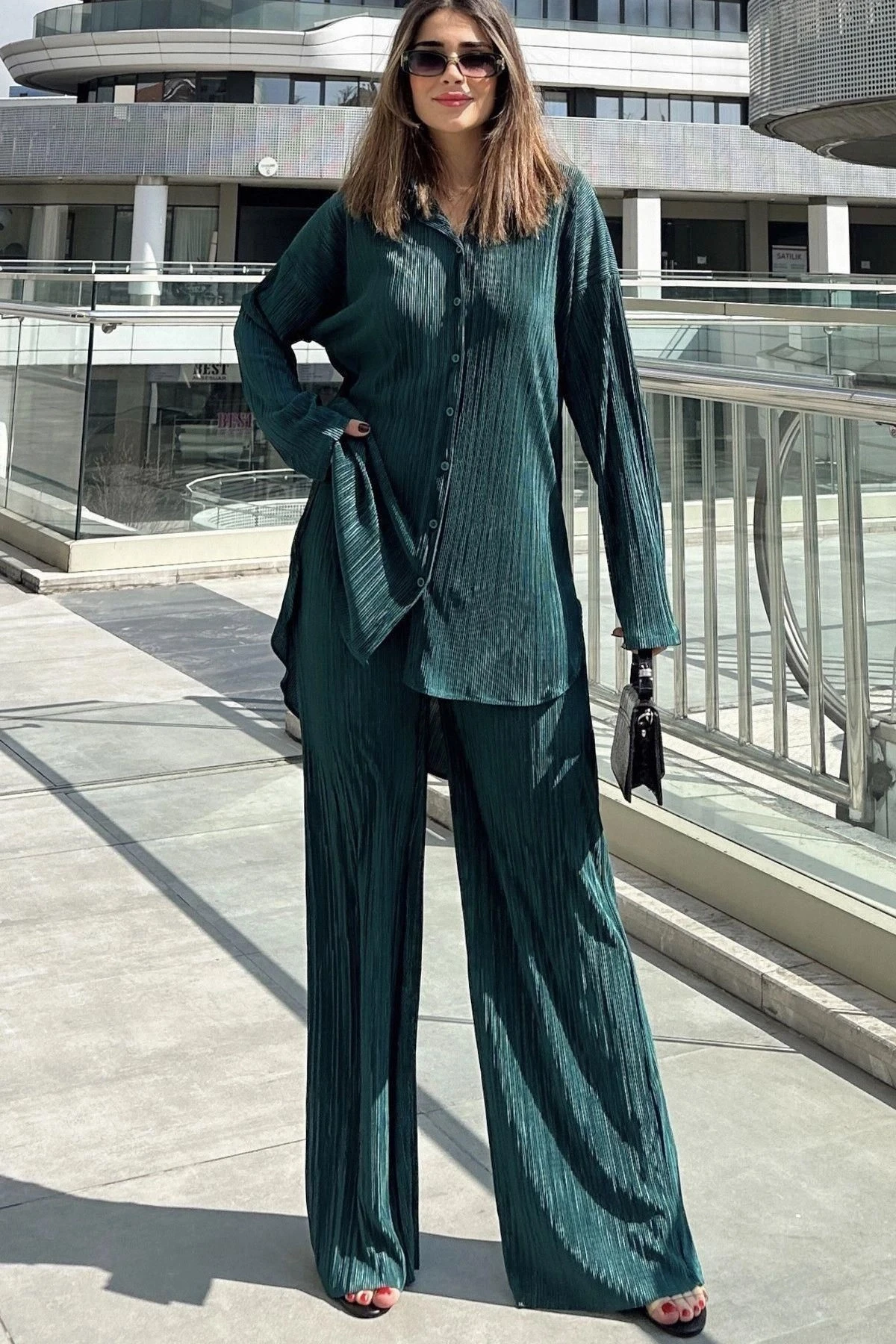 Kadın Zümrüt Yeşil Uzun Tunik Gömlek & Beli Lastikli, Bol Paça Pantolon - Salaş Bürümcük Takım