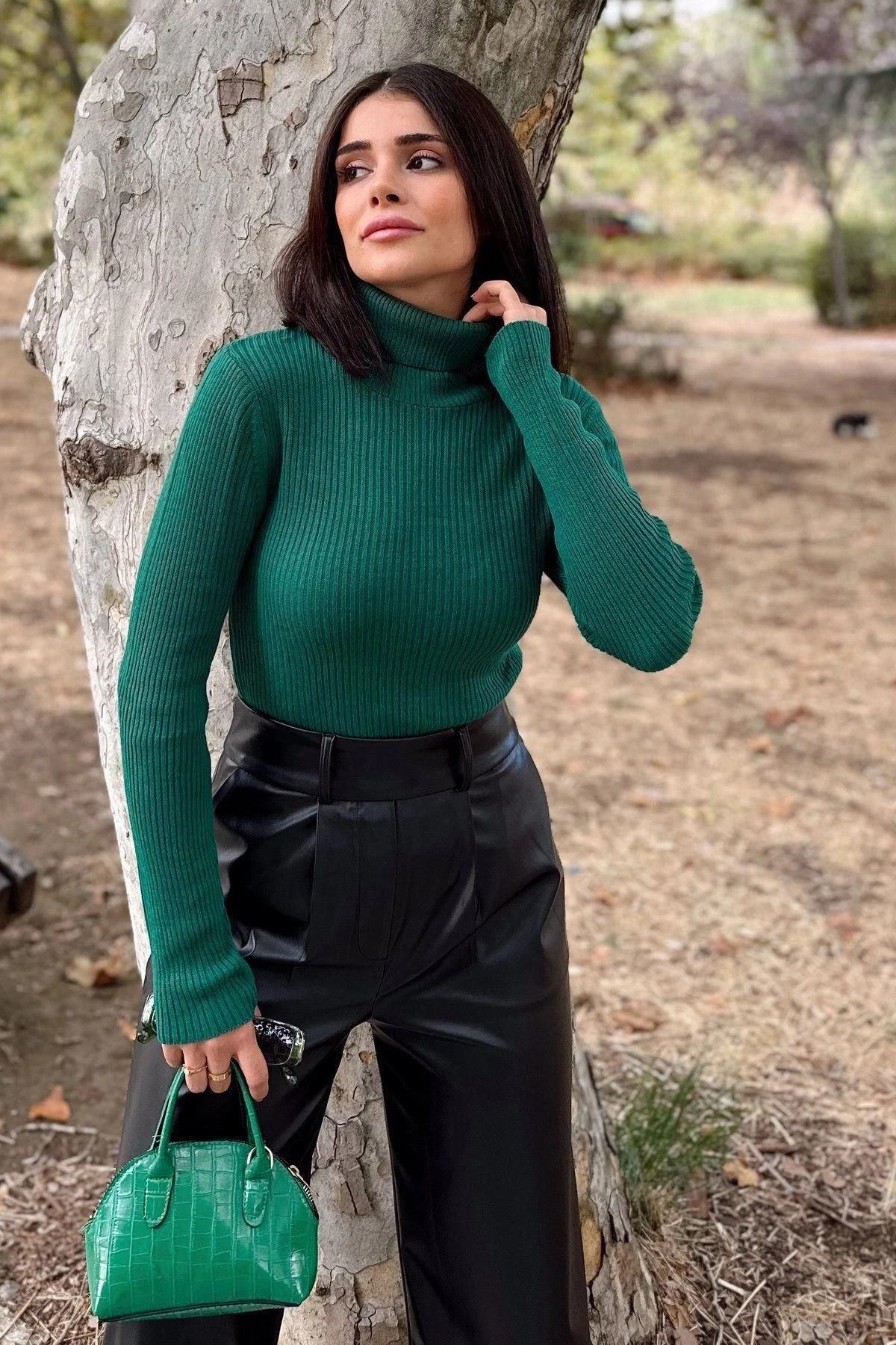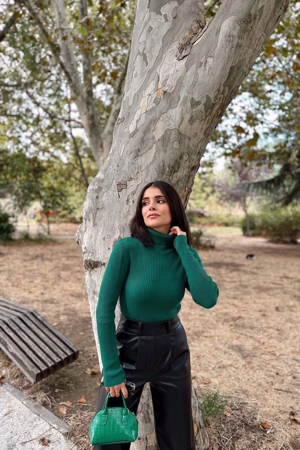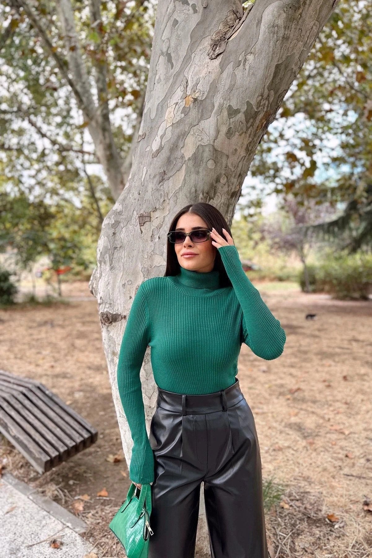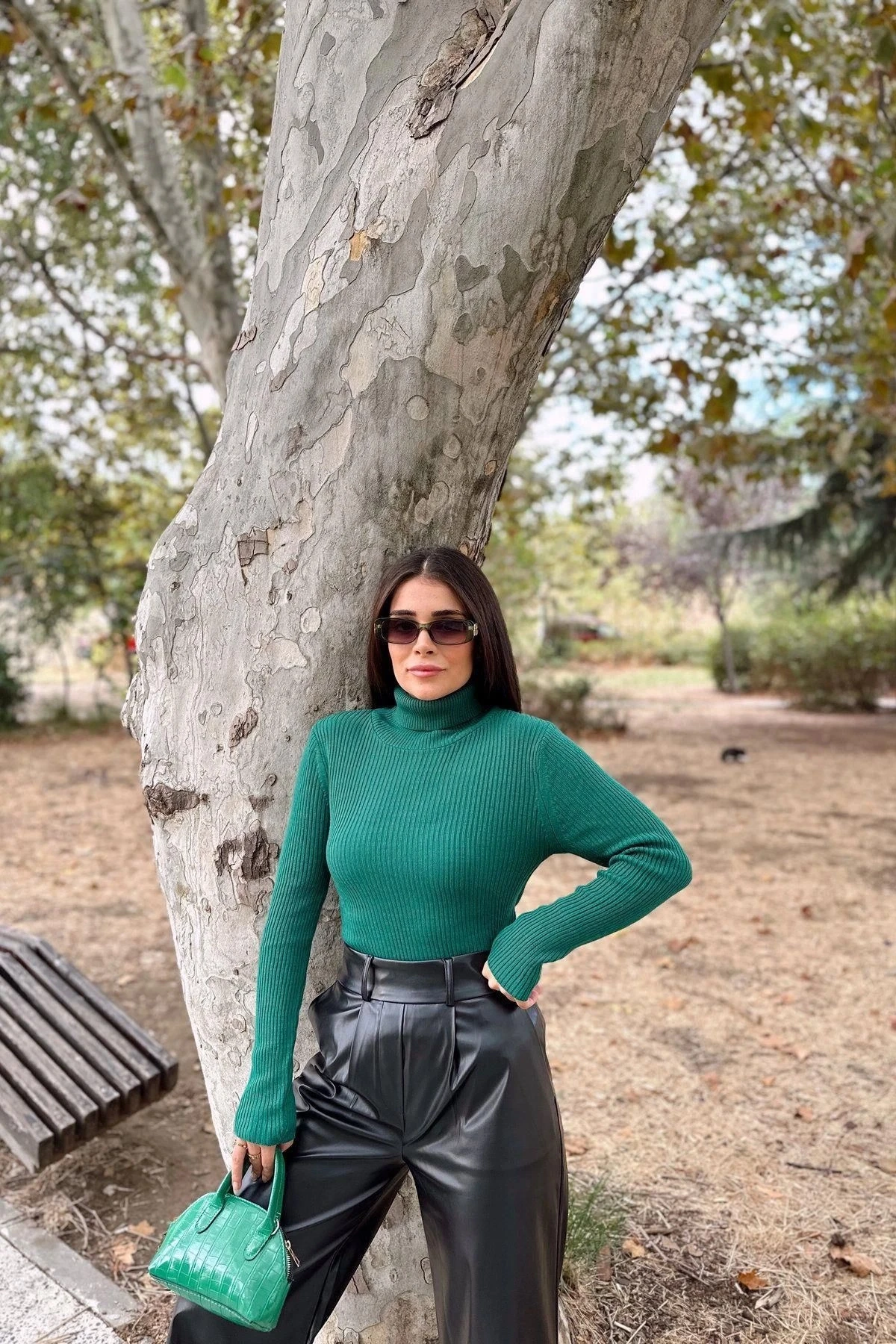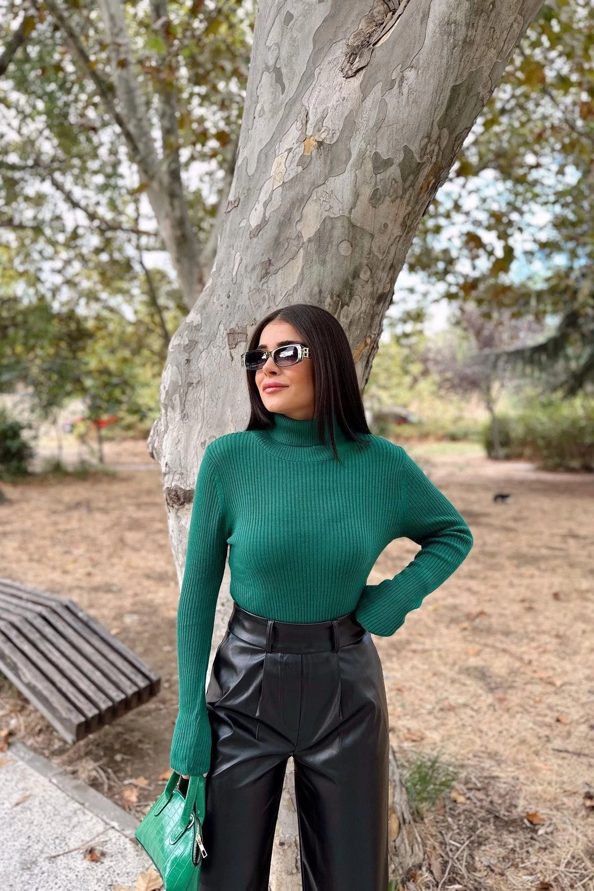 Kadın Zümrüt Yeşili Boğazlı Yaka, Uzun Kol, Vucüda Oturan Kalıp, Esnek Kumaş, Düz Desen, Triko Bluz