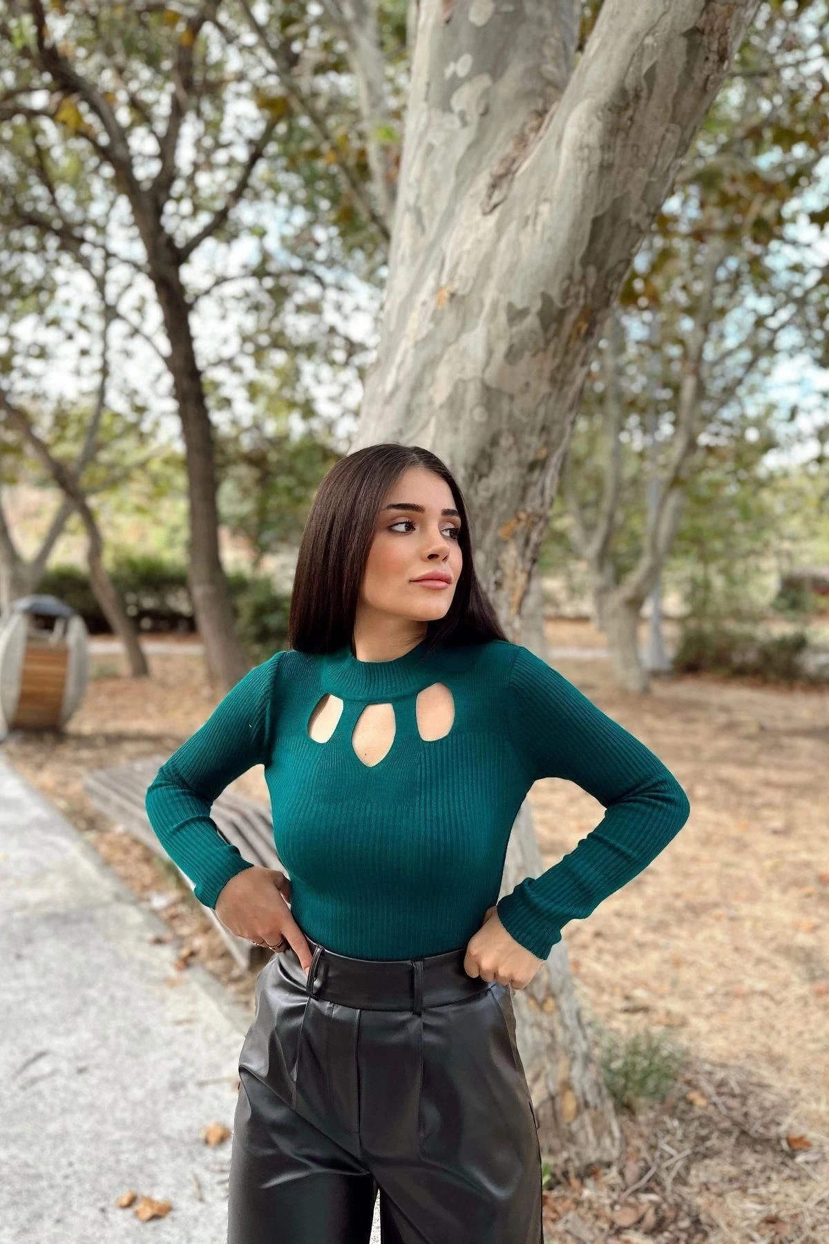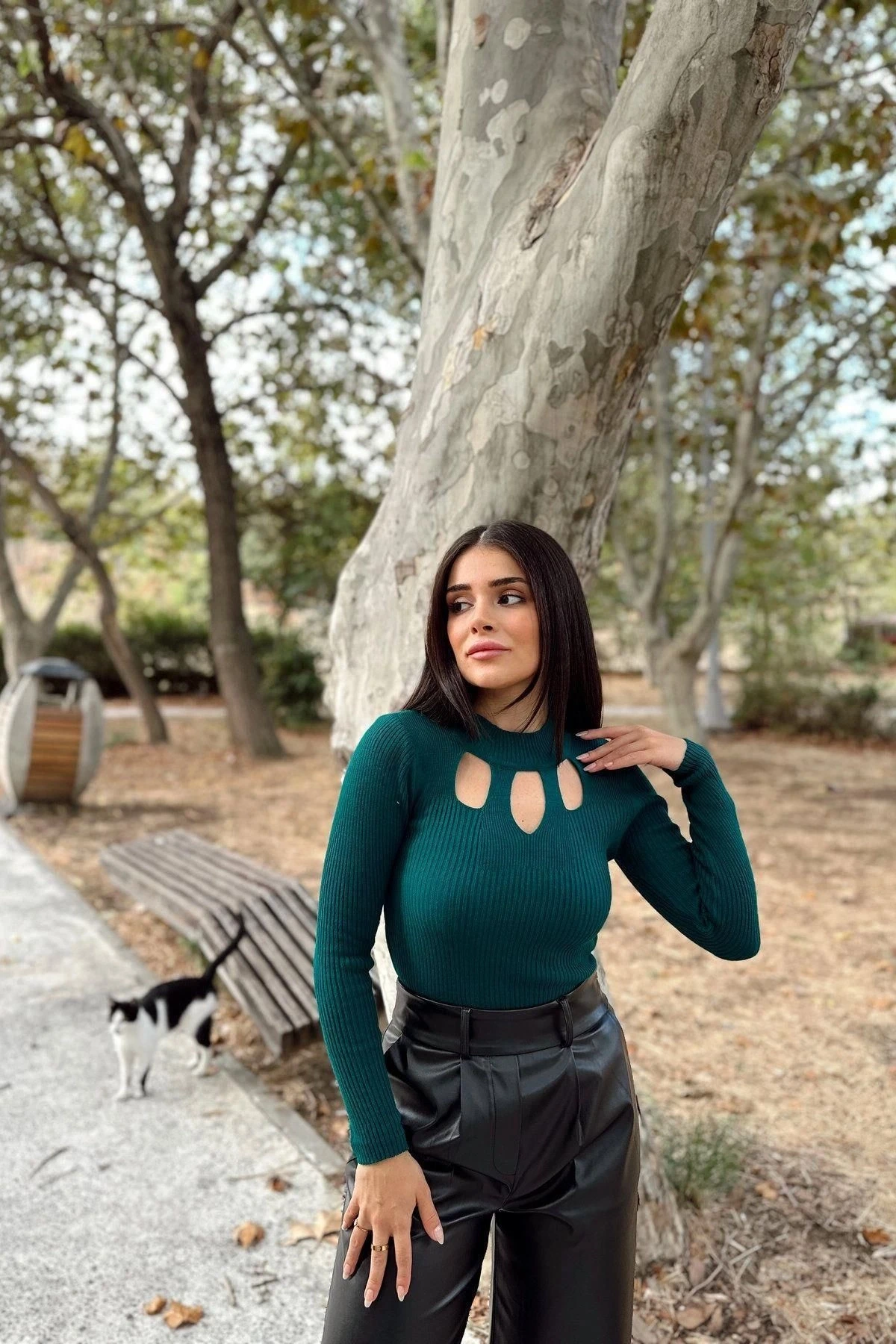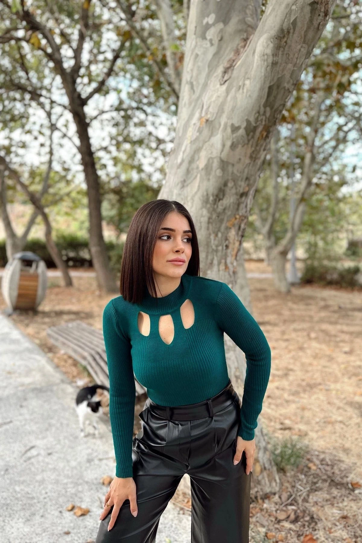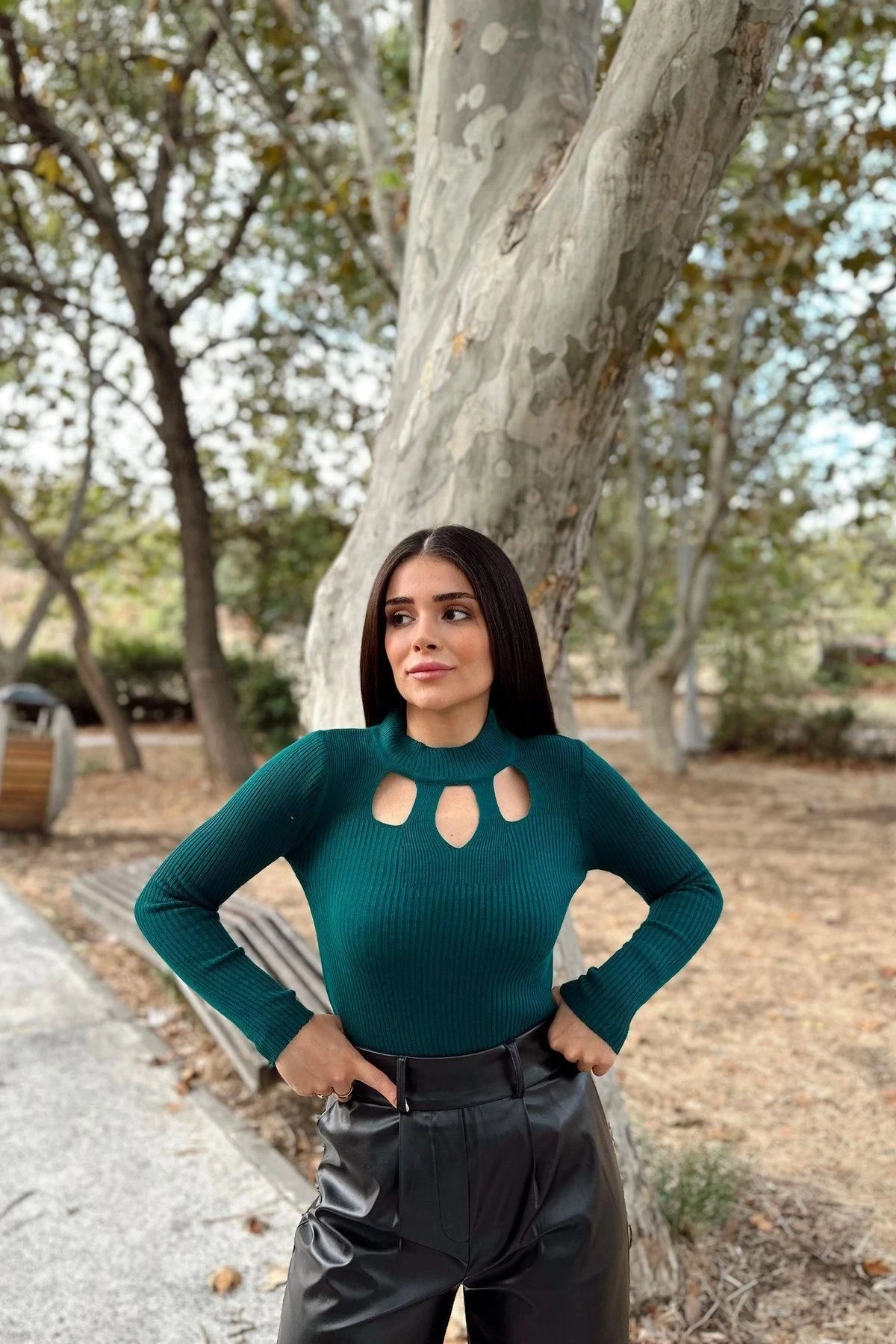Kadın Zümrüt Yeşili Yüksek Yaka, Uzun Kol,Vucüda Oturan Esnek Kumaş, Dekolte Detay, Triko Bluz
