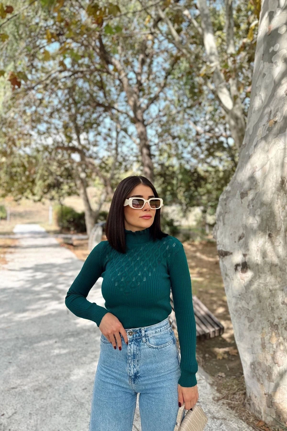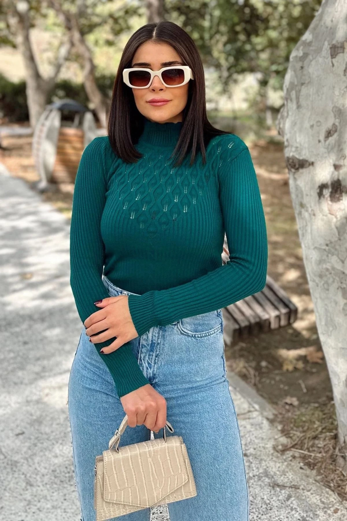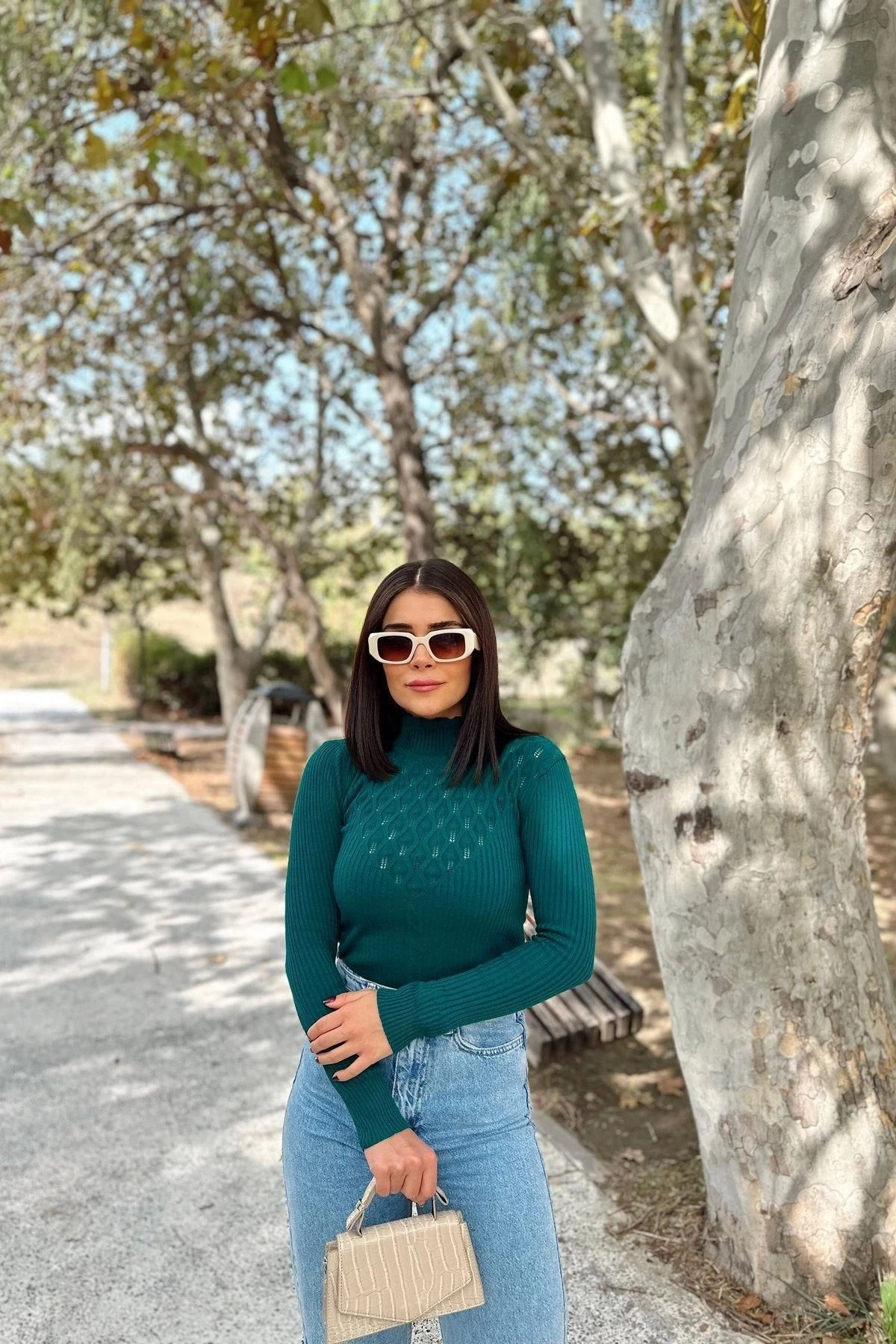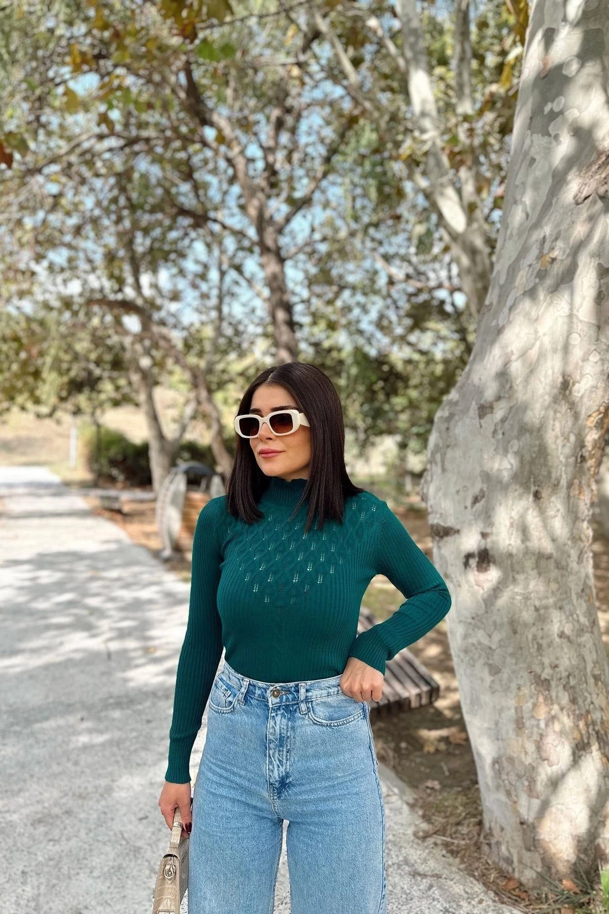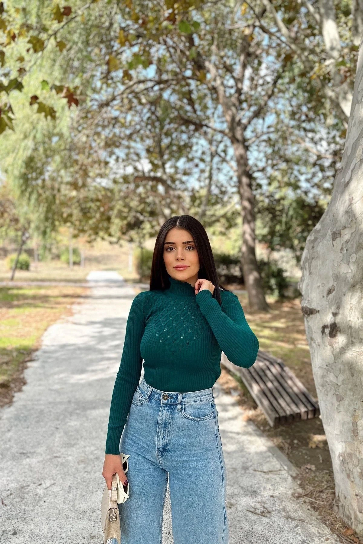 Kadın Zümrüt Yeşili Yüksek Yaka, Uzun Kol,Vucüda Oturan Esnek Kumaş, Dekolte Detay, Triko Bluz